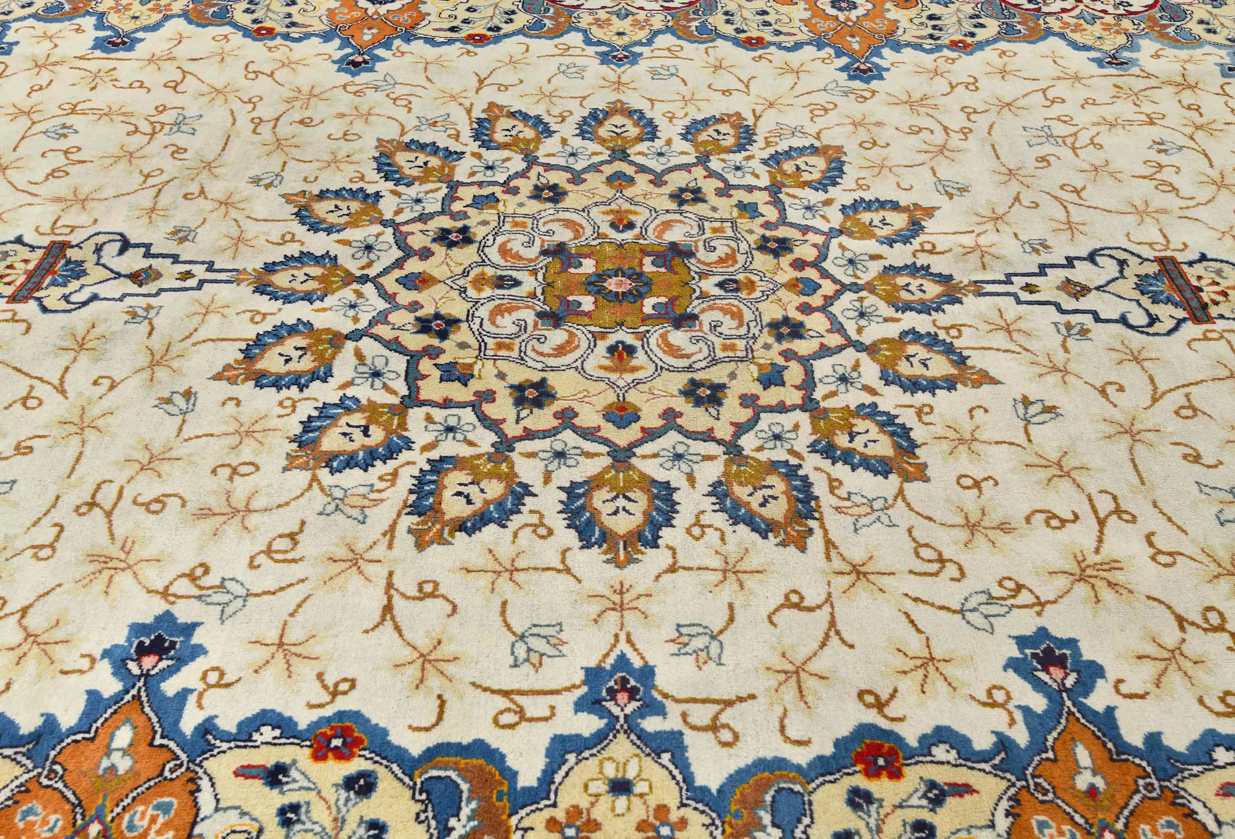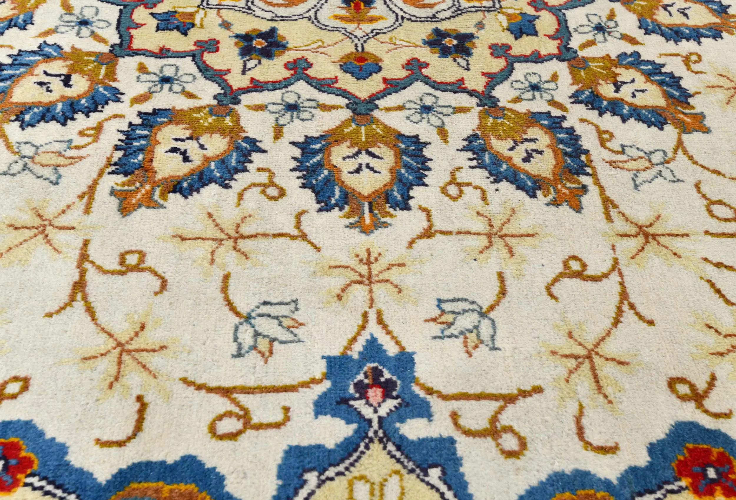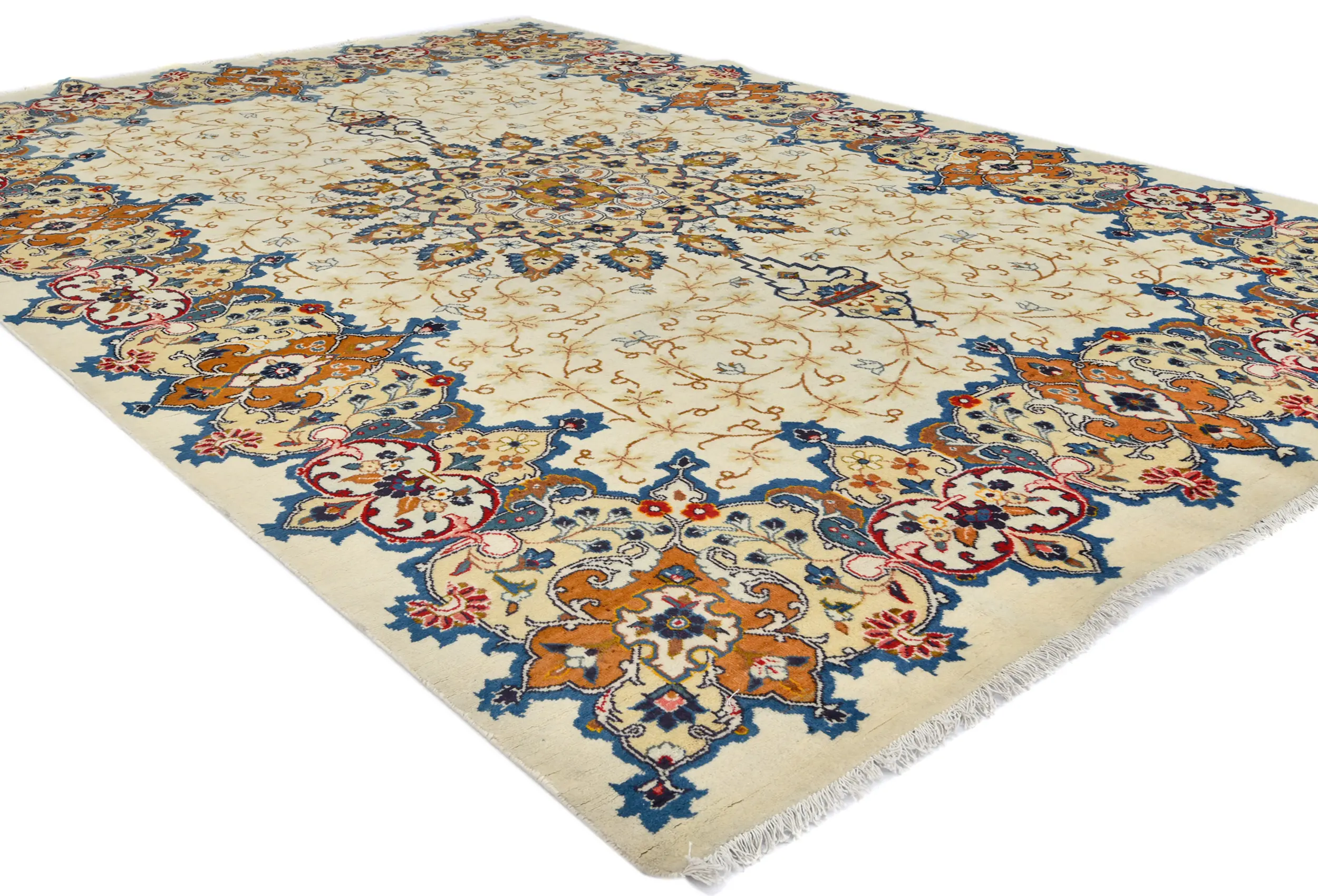 Handmade semi antique 8X11 cream Persian rug made with vegetable dyes (fine wool pile and cotton foundation), superior knot count, and alluring ancient designs. This Oriental rug never will go out of style and would be among your most valuable treasures.