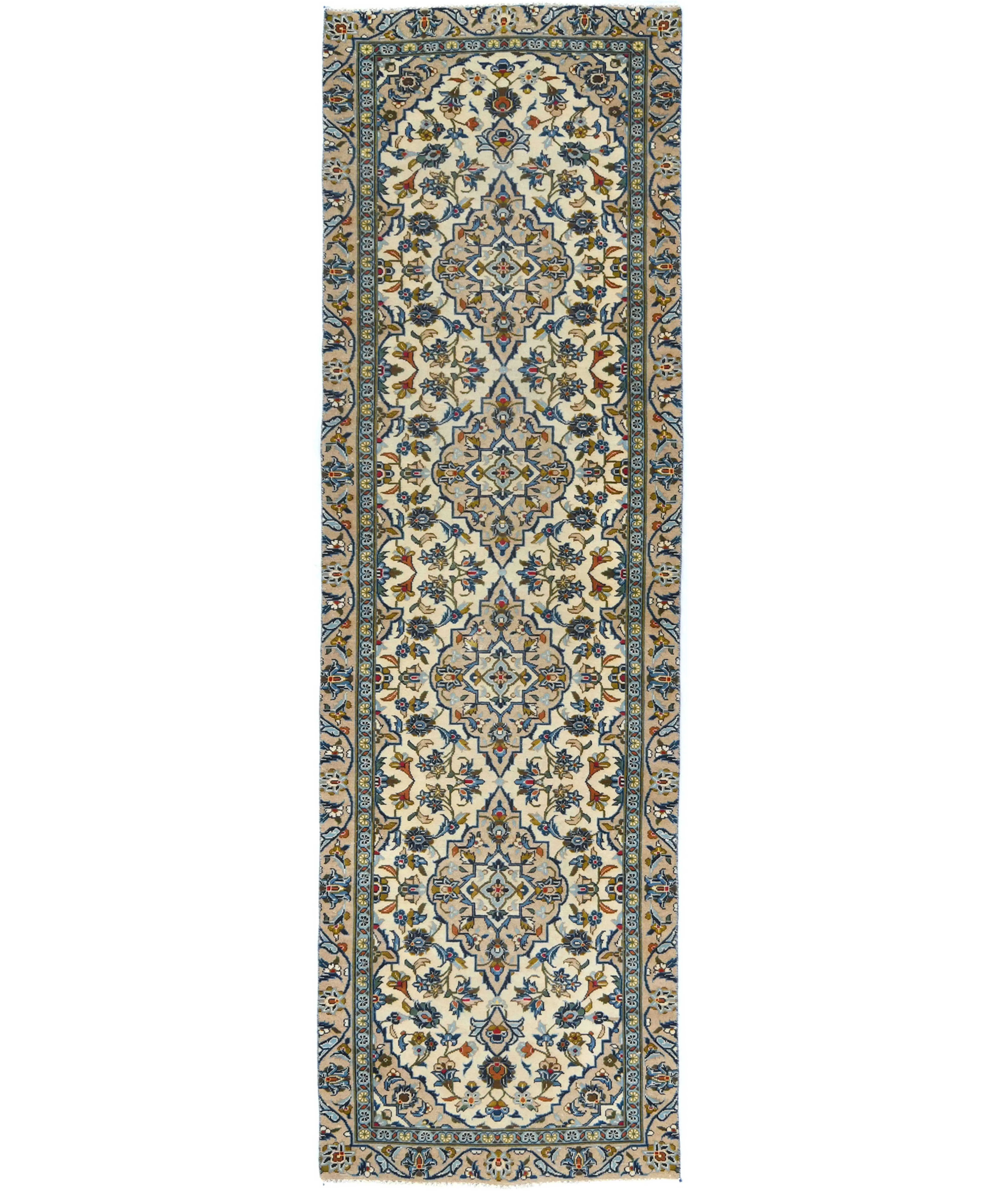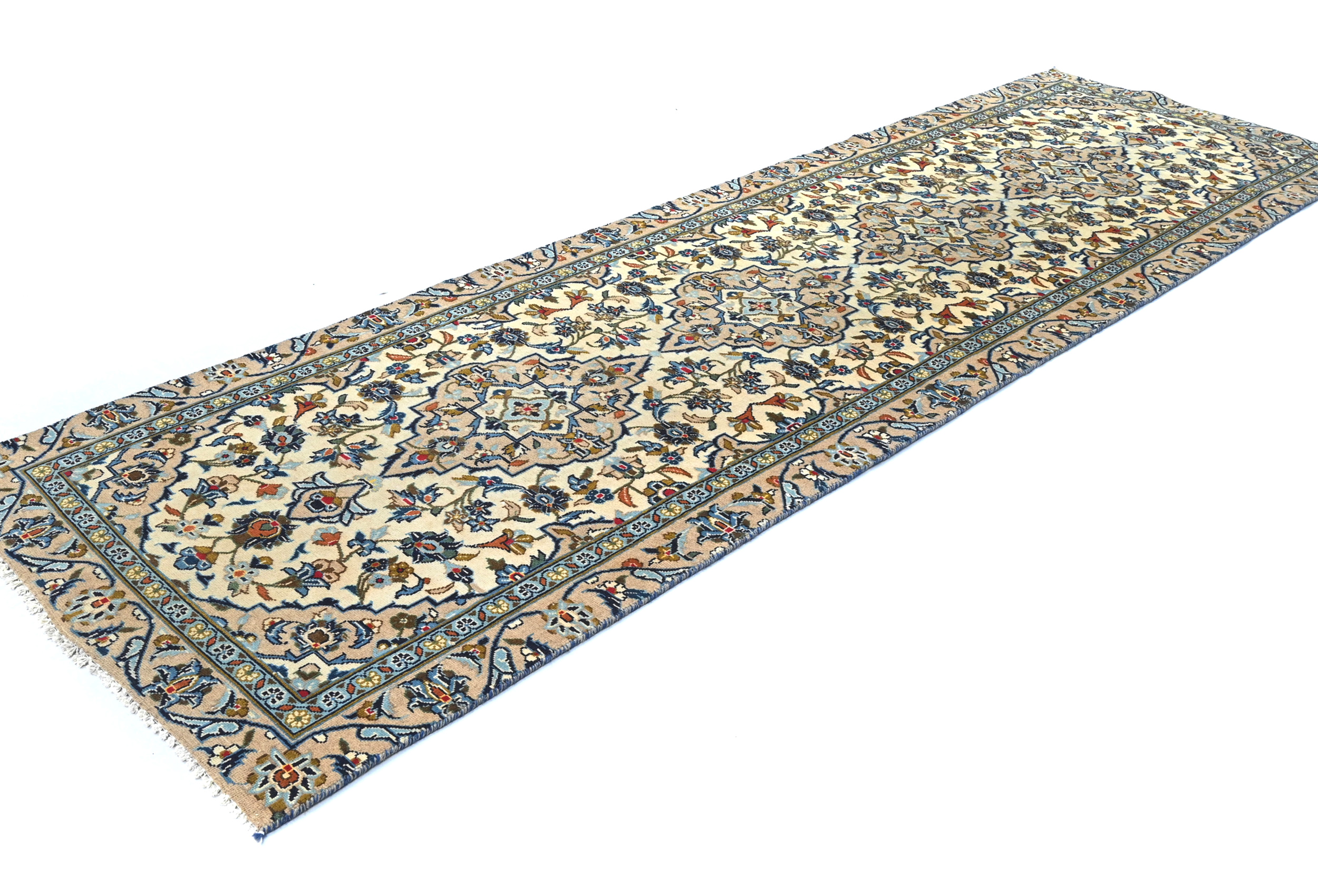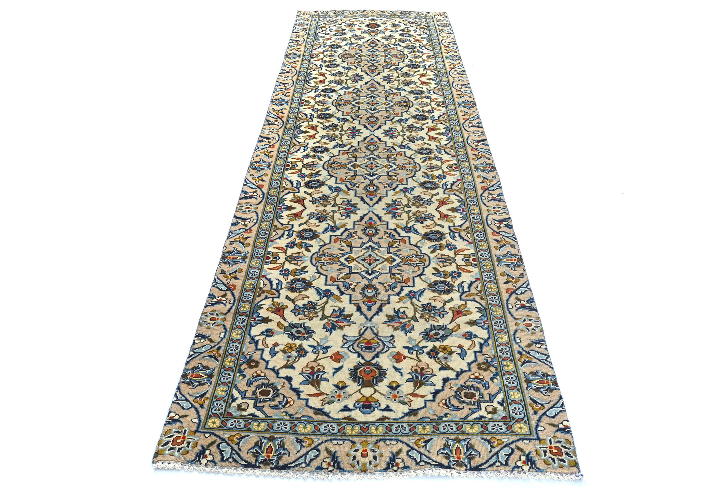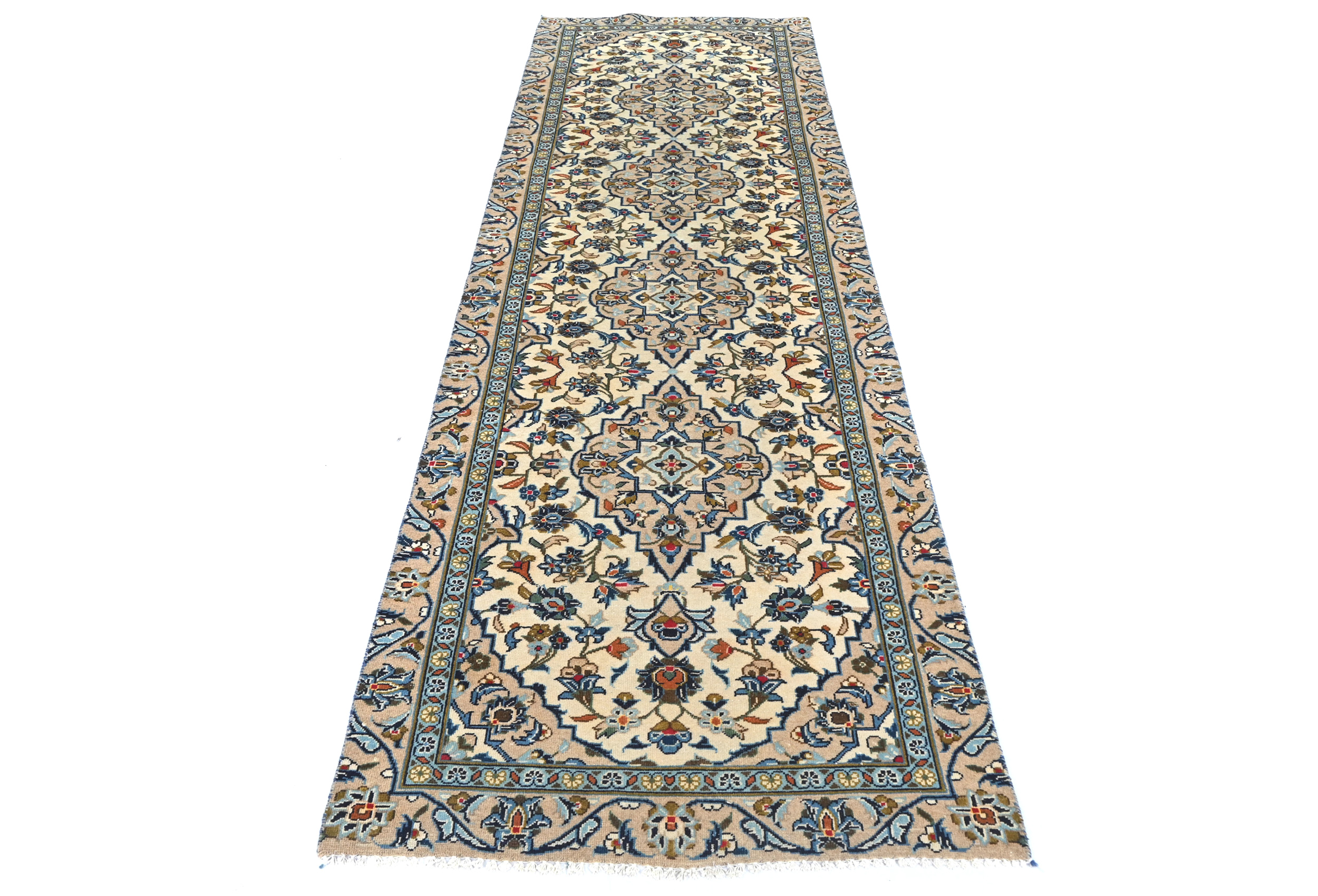 Handmade 3X9 cream oriental runner made with vegetable dyes (fine wool pile and cotton foundation), exceptional knot count, and appealing ancient designs. This Oriental runner never will go out of style and would be among your most valuable treasures.
