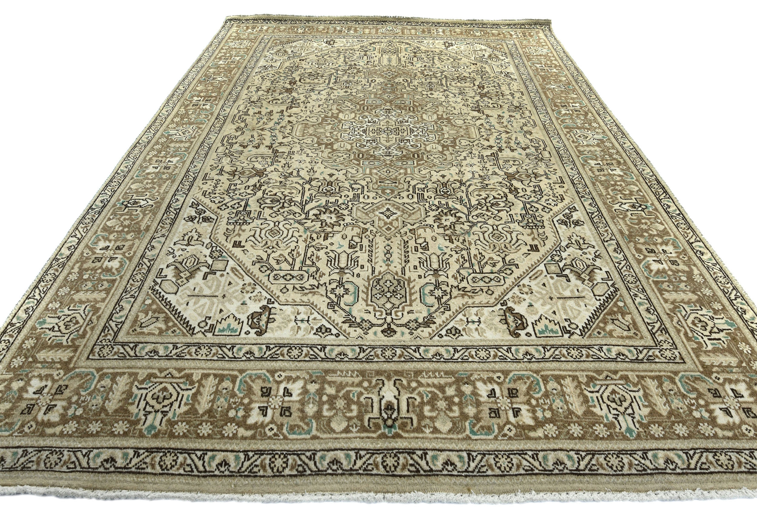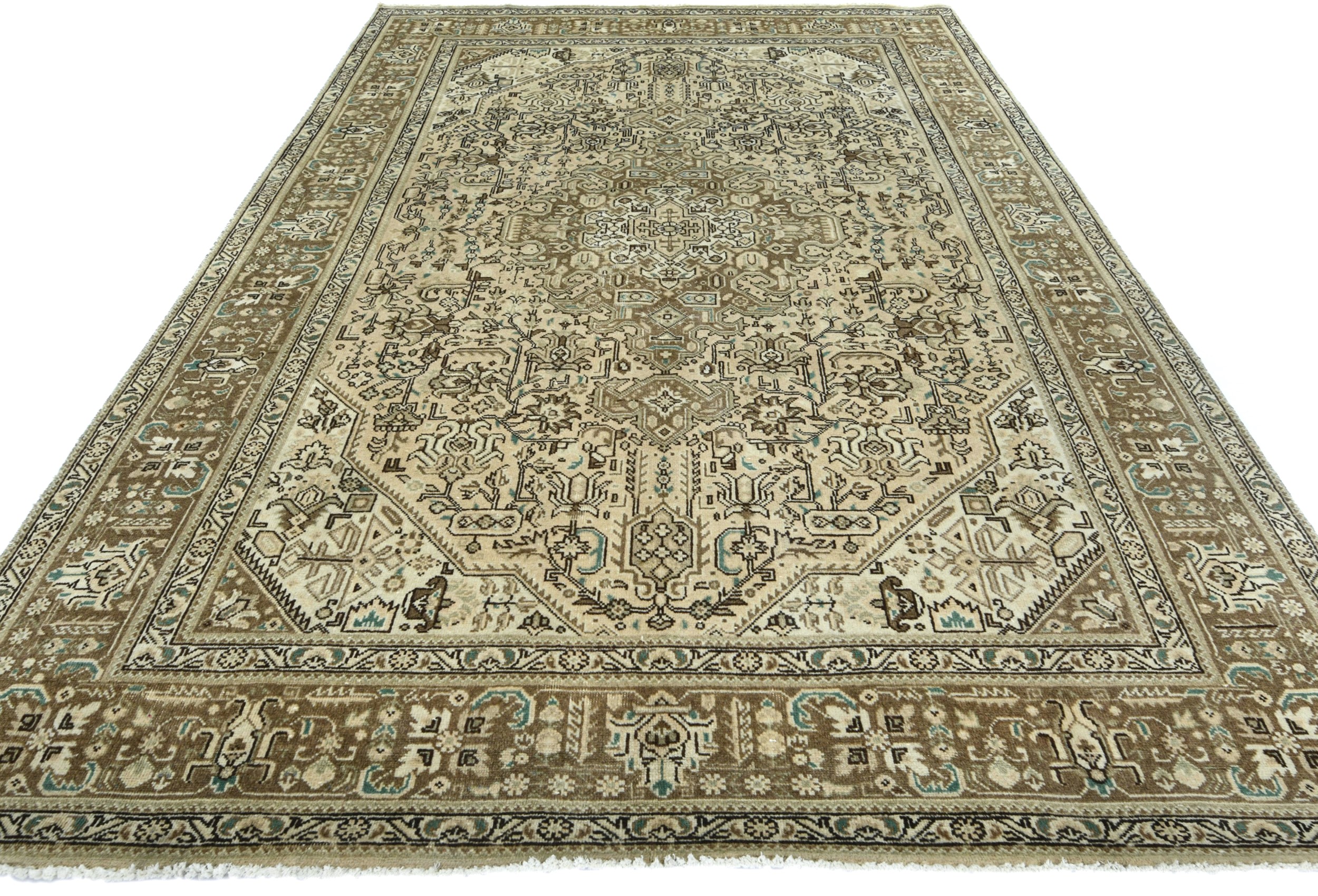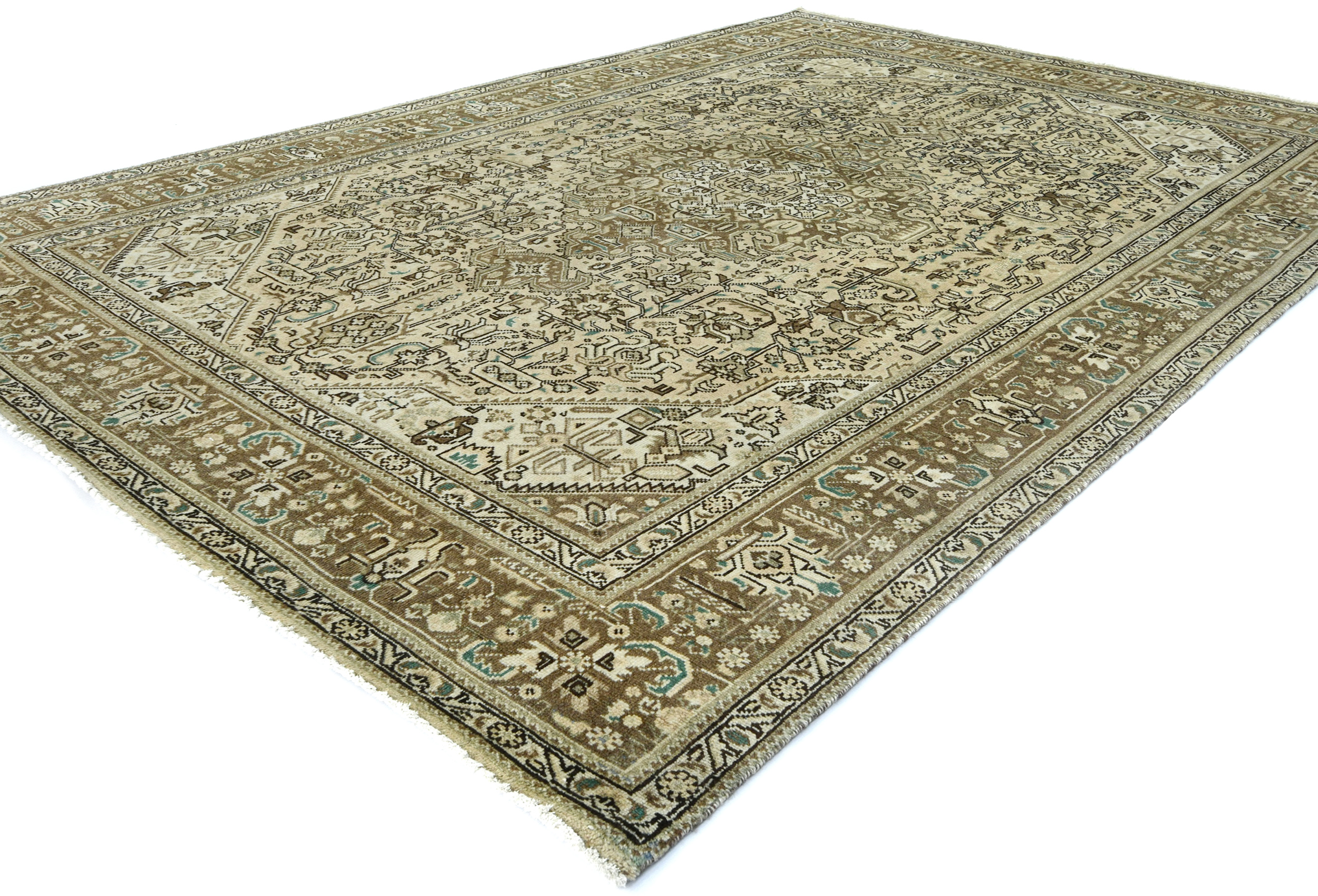 This authentic 6'5X9'6 beige vintage Oriental rug was finely knotted by the hands of weavers influenced by a variety of amazing artistic designs, to recreate the aged look of the exceptional piece with a richness of color and embellished background field. What set this tribal Oriental area rug from the others are the material and dye used (wool pile and cotton foundation), knot count, antique designs, fantastic grades, and its regional historical connection: it has deep roots, from the story of the people who produced it to the meaning of the symbols and colors displayed across its canvas that have been praised for centuries. This home décor carpet will be completely cozy and inviting that never will go out of style! Also, this Oriental rug would be among your most valuable treasures, it is a great investment that increase in value over time, and it will last a lifetime because was woven with high-quality, all-natural wool; it won’t rip, tear, or shed. Eco-friendly, opulent yet affordable; this Persian rug will give you an extra pop of character to help define your home environment with luxury and warmth that will capture the eyes and attention of your audience (homeowners, designers, decorators, family and friends). RT-6245