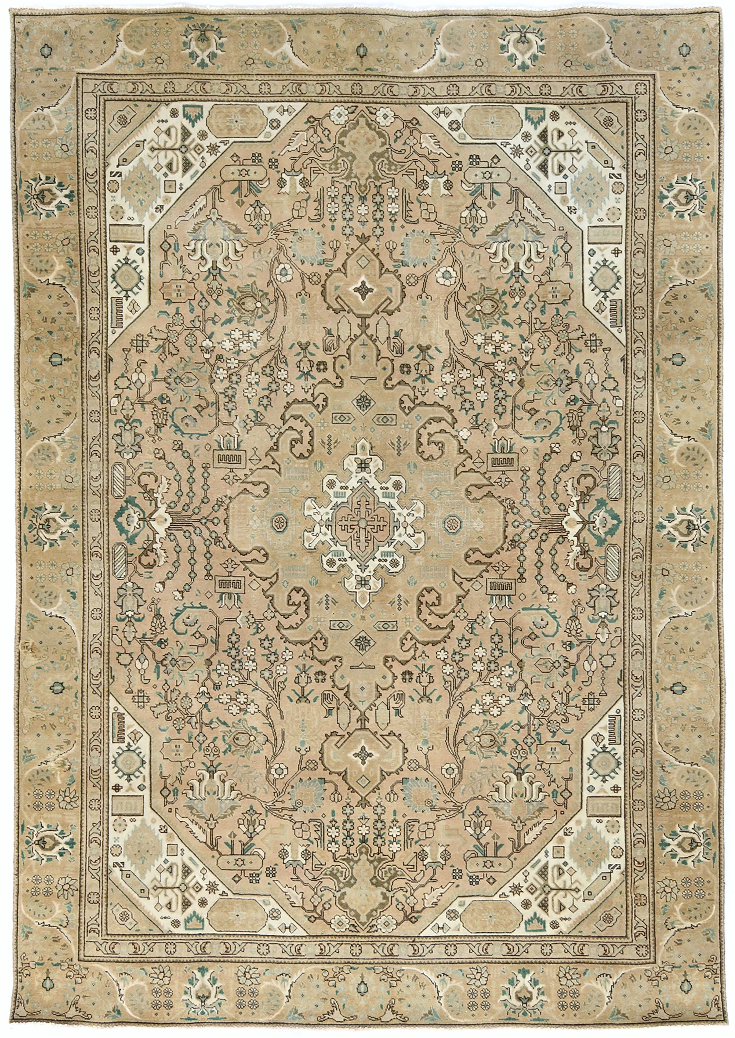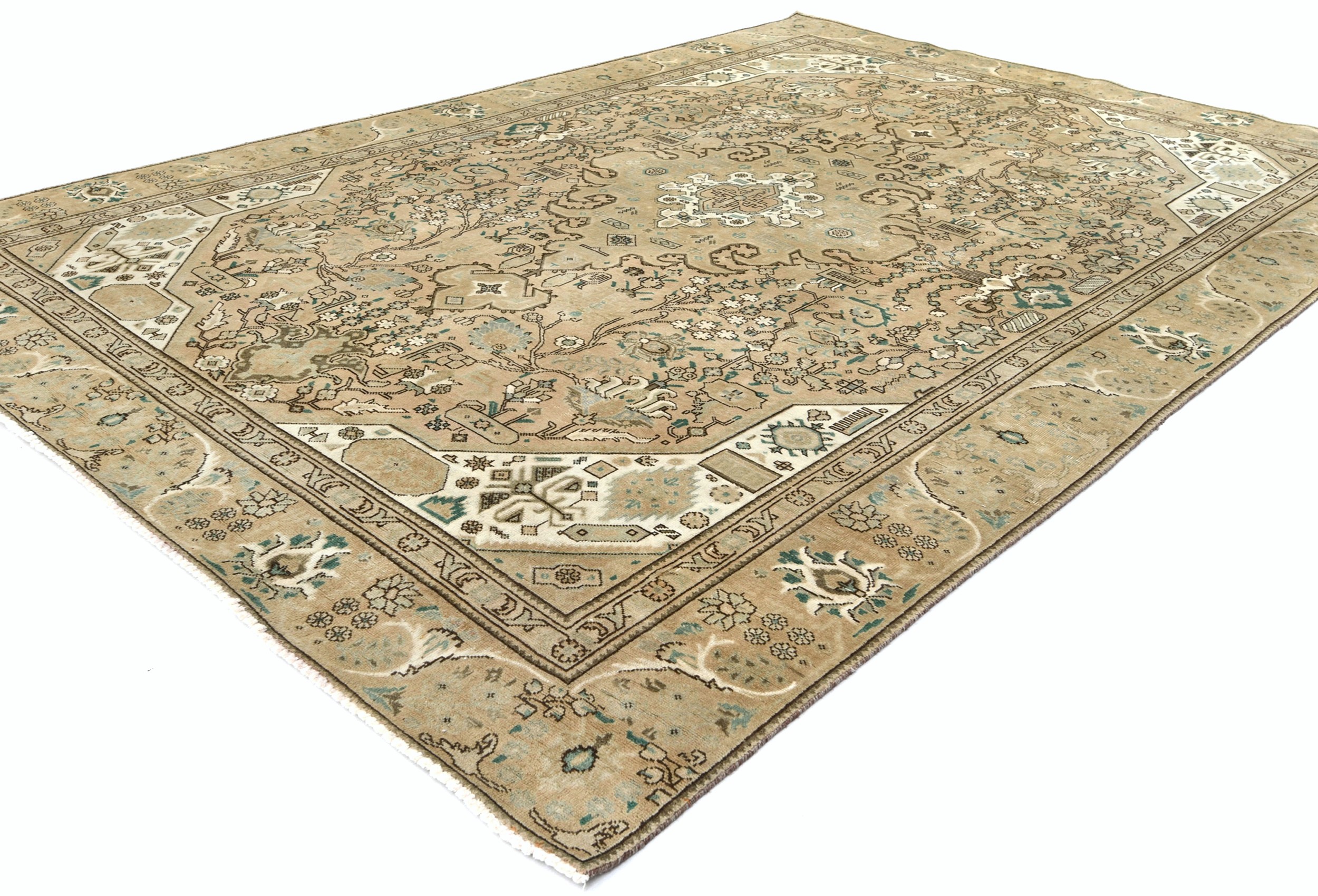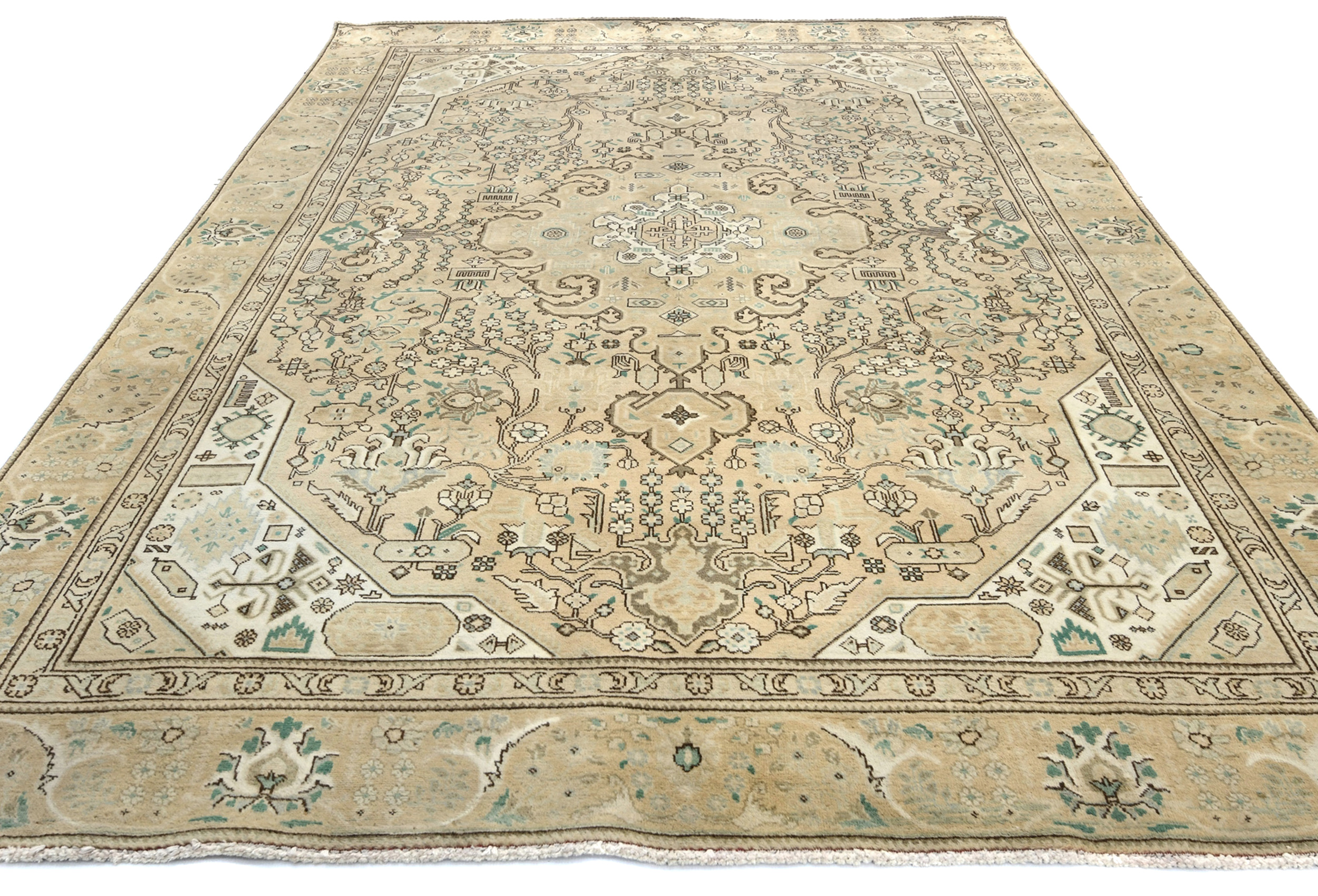 This authentic 7'6X10'8 beige vintage Oriental rug was finely knotted by the hands of weavers influenced by a variety of amazing artistic designs, to recreate the aged look of the exceptional piece with a richness of color and embellished background field. What set this tribal Oriental area rug from the others are the material and dye used (wool pile and cotton foundation), knot count, antique designs, fantastic grades, and its regional historical connection: it has deep roots, from the story of the people who produced it to the meaning of the symbols and colors displayed across its canvas that have been praised for centuries. This home décor carpet will be completely cozy and inviting that never will go out of style! Also, this Oriental rug would be among your most valuable treasures, it is a great investment that increase in value over time, and it will last a lifetime because was woven with high-quality, all-natural wool; it won’t rip, tear, or shed. Eco-friendly, opulent yet affordable; this Persian rug will give you an extra pop of character to help define your home environment with luxury and warmth that will capture the eyes and attention of your audience (homeowners, designers, decorators, family and friends).
