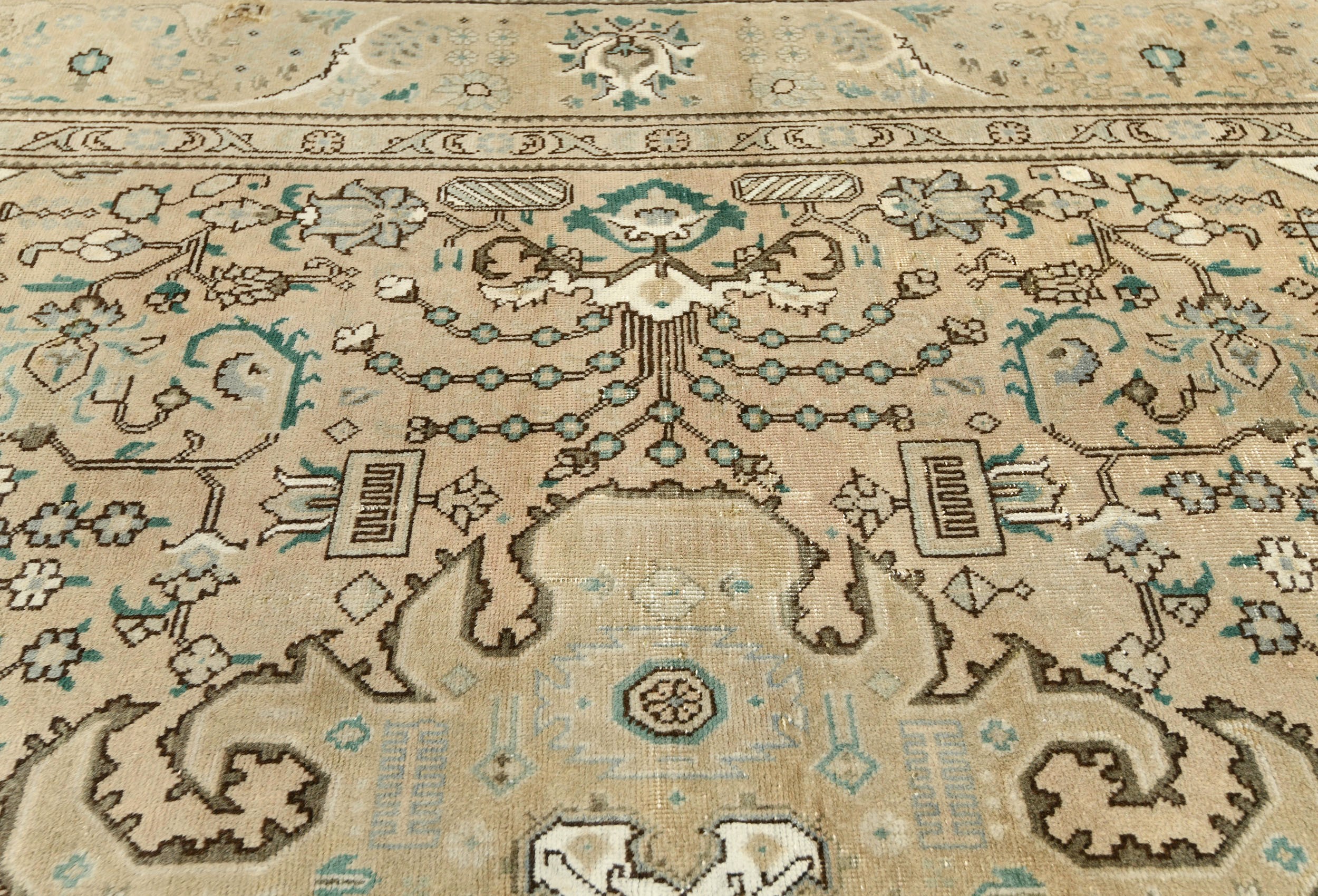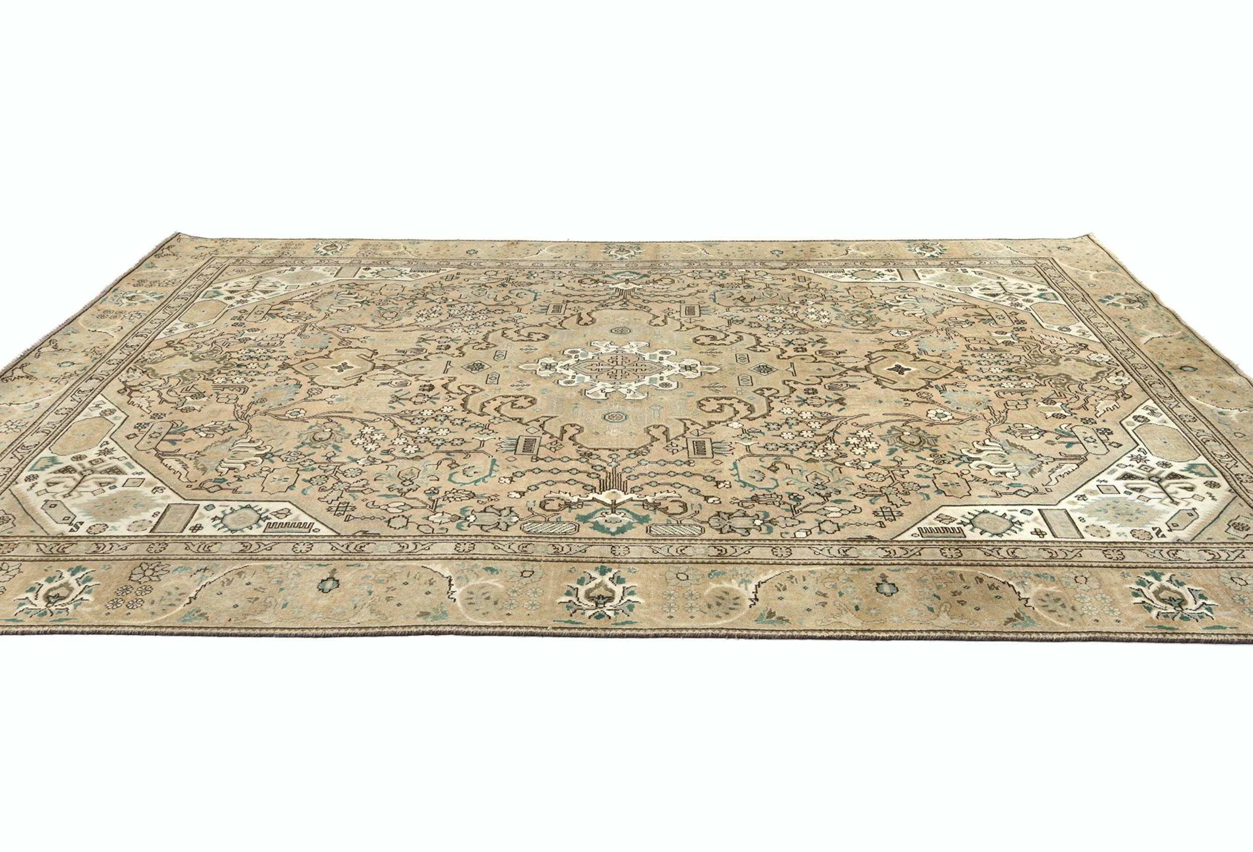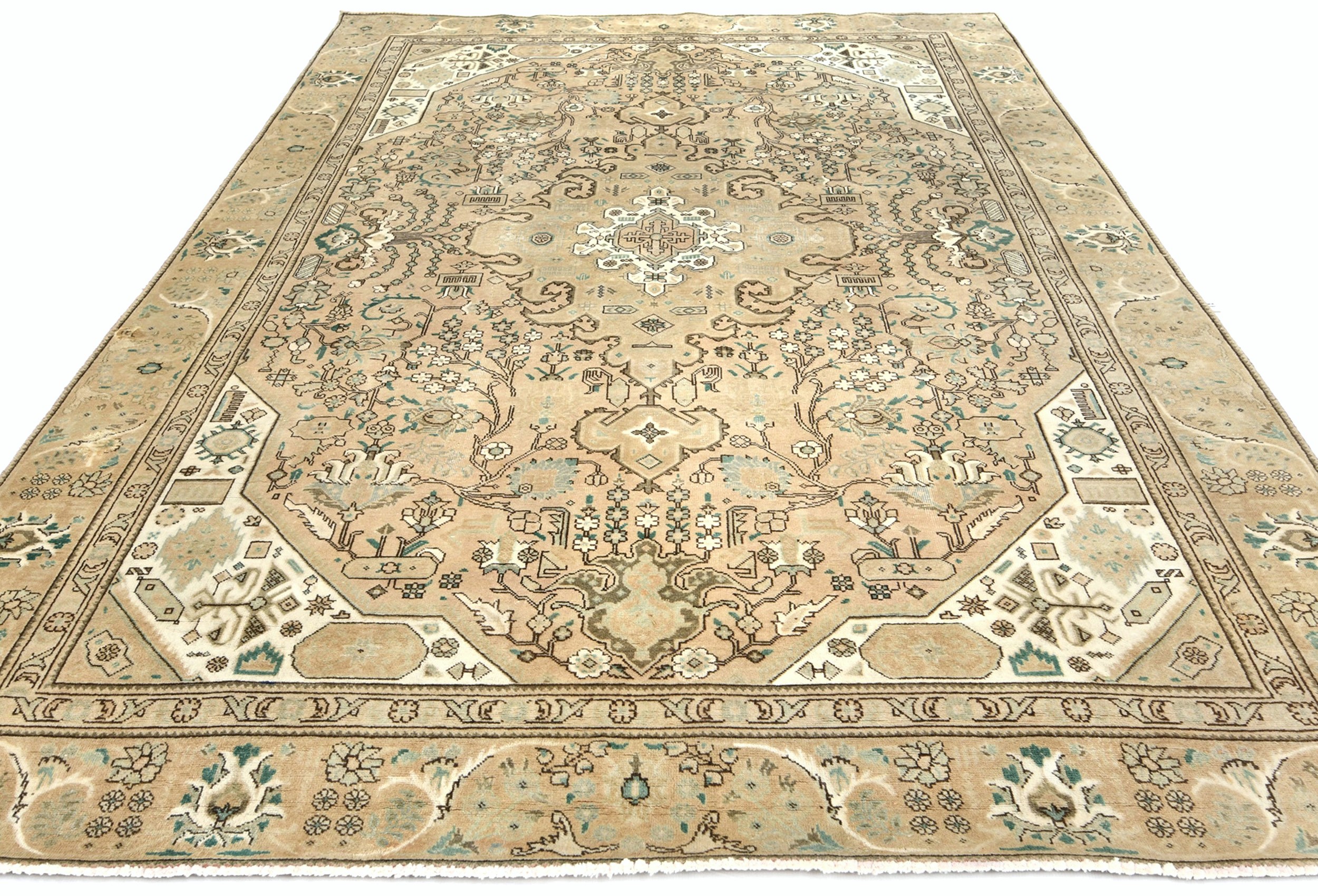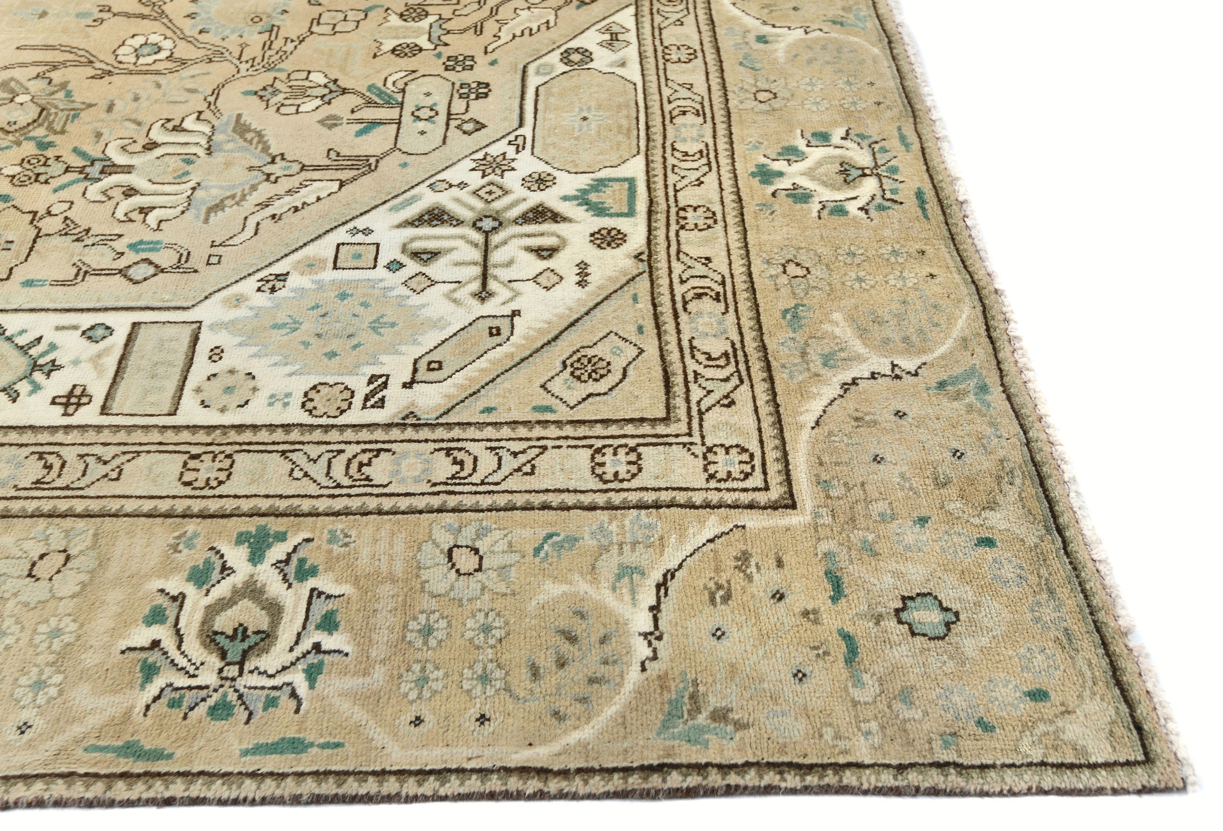 This authentic 7'6X10'8 beige vintage Oriental rug was finely knotted by the hands of weavers influenced by a variety of amazing artistic designs, to recreate the aged look of the exceptional piece with a richness of color and embellished background field. What set this tribal Oriental area rug from the others are the material and dye used (wool pile and cotton foundation), knot count, antique designs, fantastic grades, and its regional historical connection: it has deep roots, from the story of the people who produced it to the meaning of the symbols and colors displayed across its canvas that have been praised for centuries. This home décor carpet will be completely cozy and inviting that never will go out of style! Also, this Oriental rug would be among your most valuable treasures, it is a great investment that increase in value over time, and it will last a lifetime because was woven with high-quality, all-natural wool; it won’t rip, tear, or shed. Eco-friendly, opulent yet affordable; this Persian rug will give you an extra pop of character to help define your home environment with luxury and warmth that will capture the eyes and attention of your audience (homeowners, designers, decorators, family and friends).