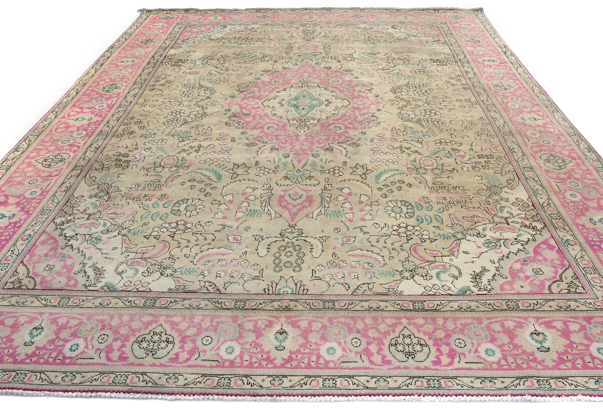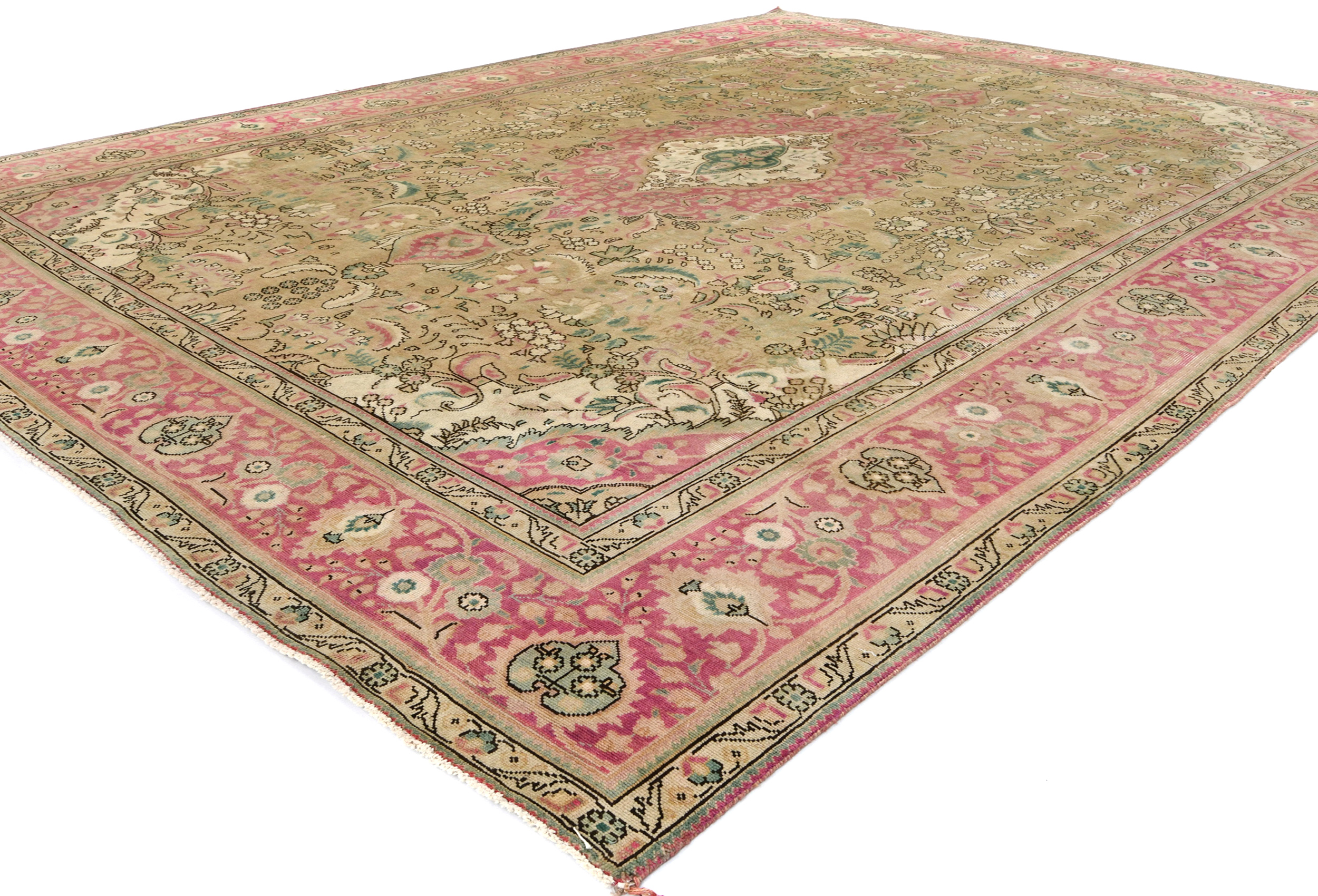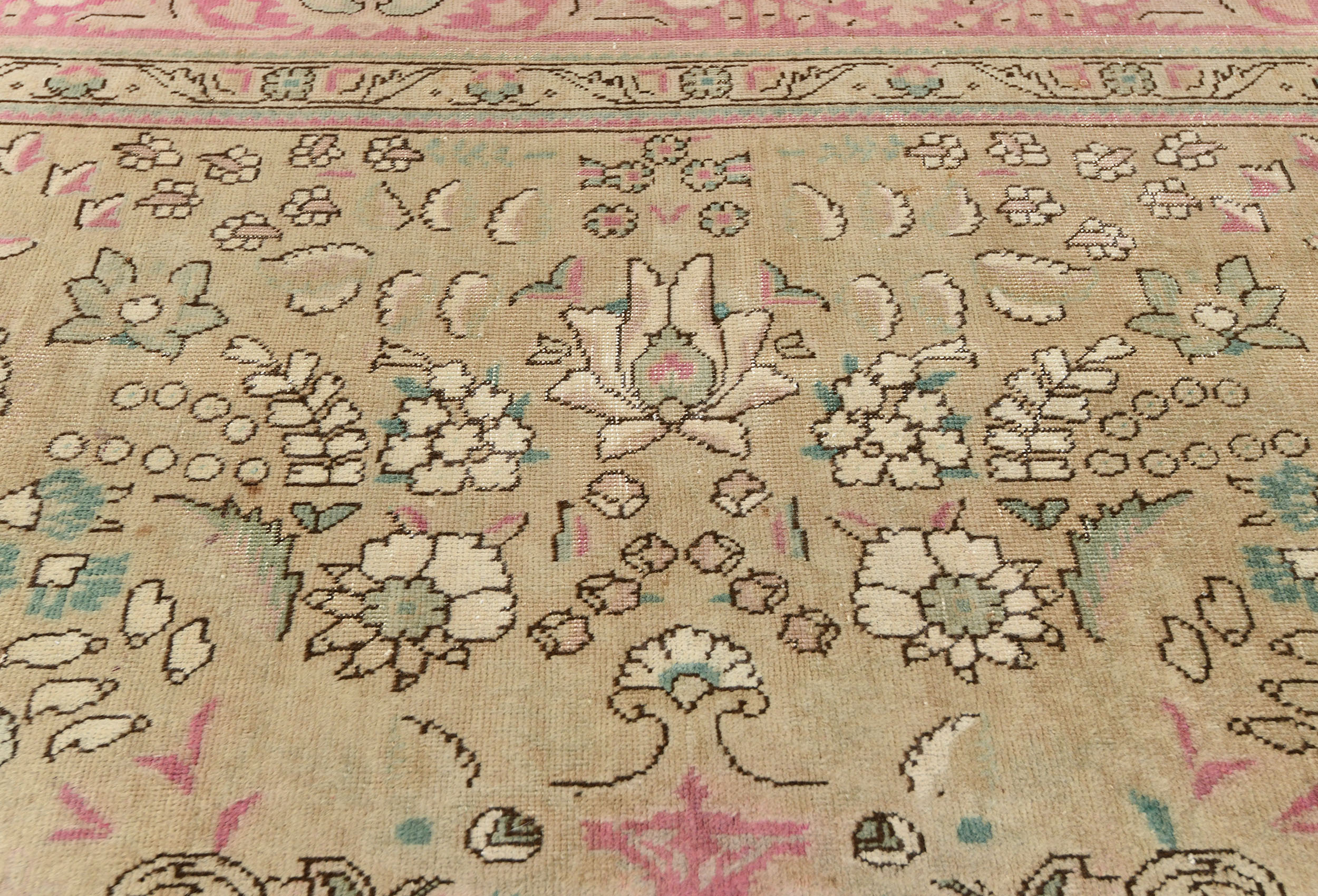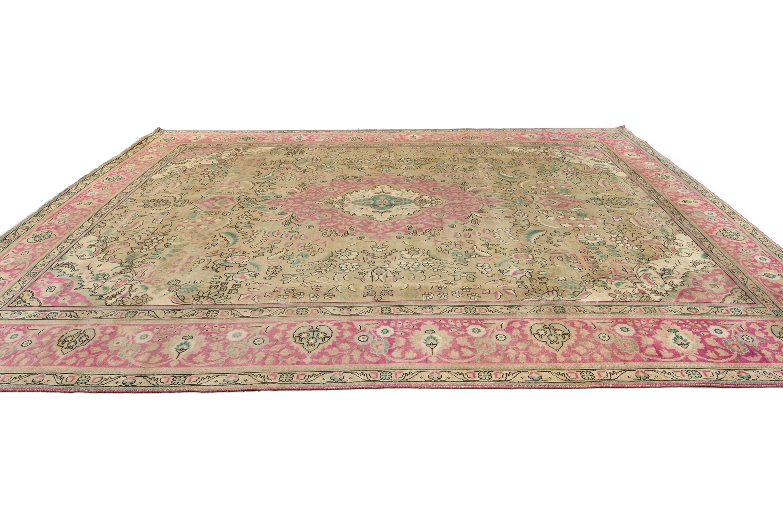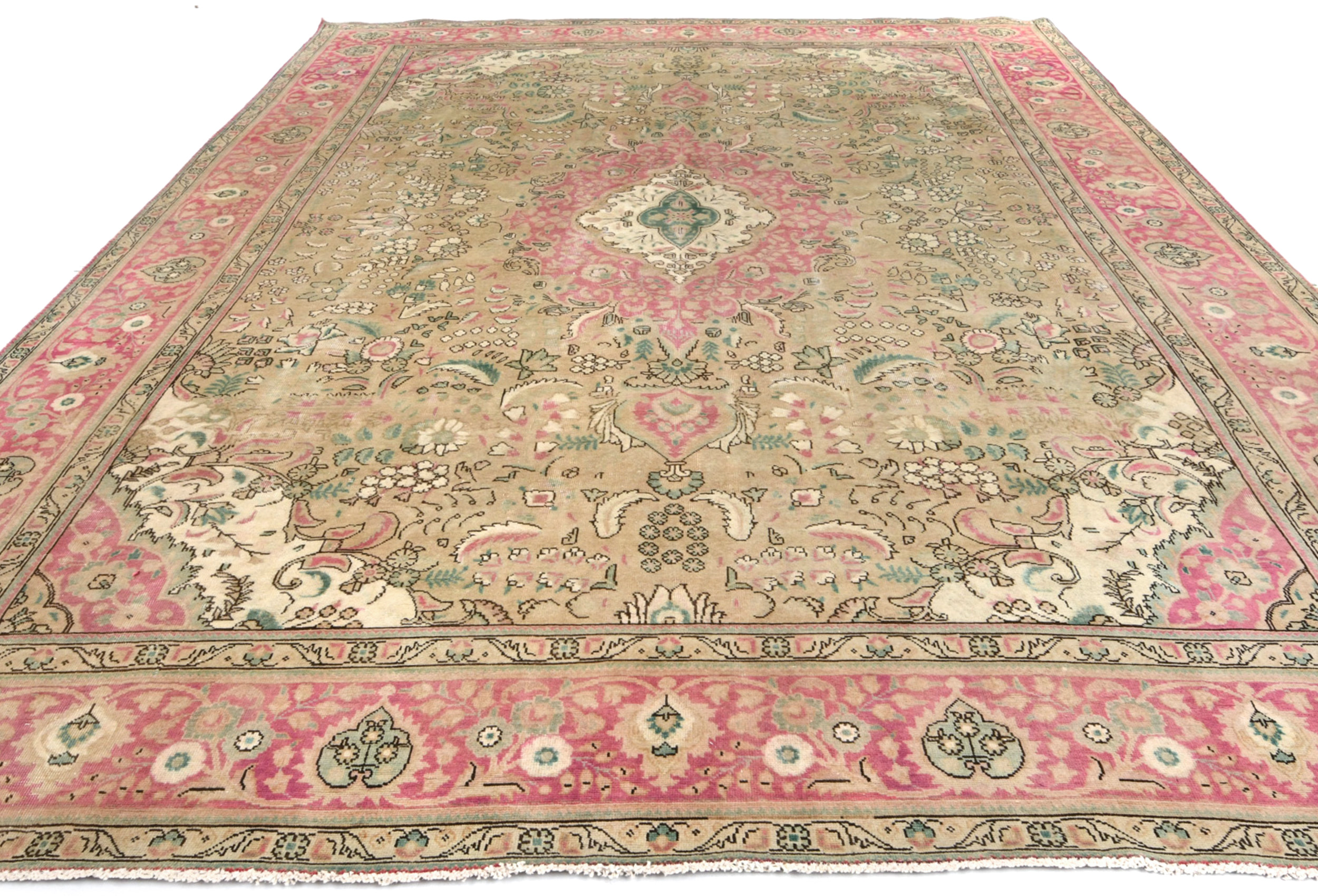 This authentic 10X13 khaki vintage Oriental rug was finely knotted by the hands of weavers influenced by a variety of amazing artistic designs, to recreate the aged look of the exceptional piece with a richness of color and embellished floral background field. What set this traditional Oriental area rug from the others are the material and dye used (wool pile and cotton foundation), knot count, antique designs, fantastic grades, and its regional historical connection: it has deep roots, from the story of the people who produced it to the meaning of the symbols and colors displayed across its canvas that have been praised for centuries. This classic home décor carpet will be completely cozy and inviting that never will go out of style! Also, this Oriental rug would be among your most valuable treasures, it is a great investment that increase in value over time, and it will last a lifetime because was woven with high-quality, all-natural wool; it won’t rip, tear, or shed. Eco-friendly, opulent yet affordable; this Persian rug will give you an extra pop of character to help define your home environment with luxury and warmth that will capture the eyes and attention of your audience (homeowners, designers, decorators, family and friends).