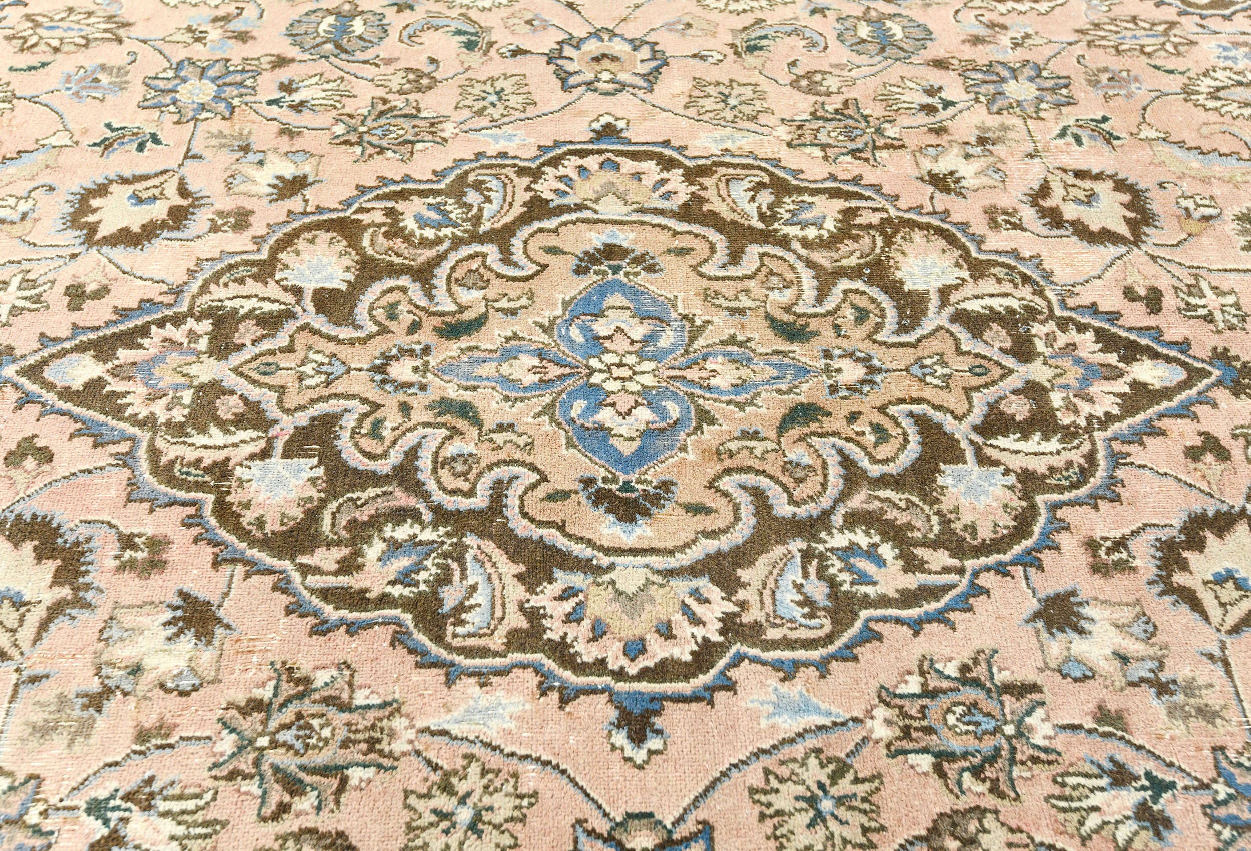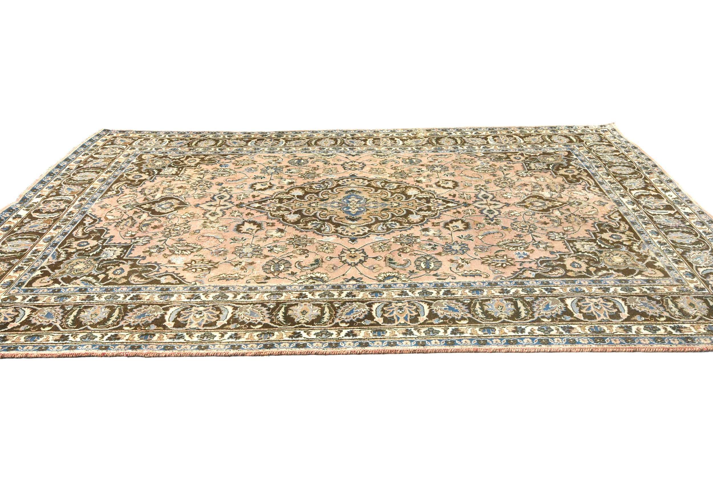 This authentic 6X9'5 light salmon new Oriental rug was crafted by the hands of skilled weavers enthused by a variety of lovely artistic designs, to recreate the aged look of the unique piece with a richness of color and beautifully elaborated background field. What set this vintage style Oriental area rug from the others are the material and dye used (wool pile and cotton foundation), knot count, ancient designs, fantastic grades, and its regional historical connection: it has deep roots, from the story of the people who produced it to the meaning of the symbols and colors displayed across its canvas that have been praised for centuries. This Indian home décor carpet will be completely cozy and inviting that never will go out of style!