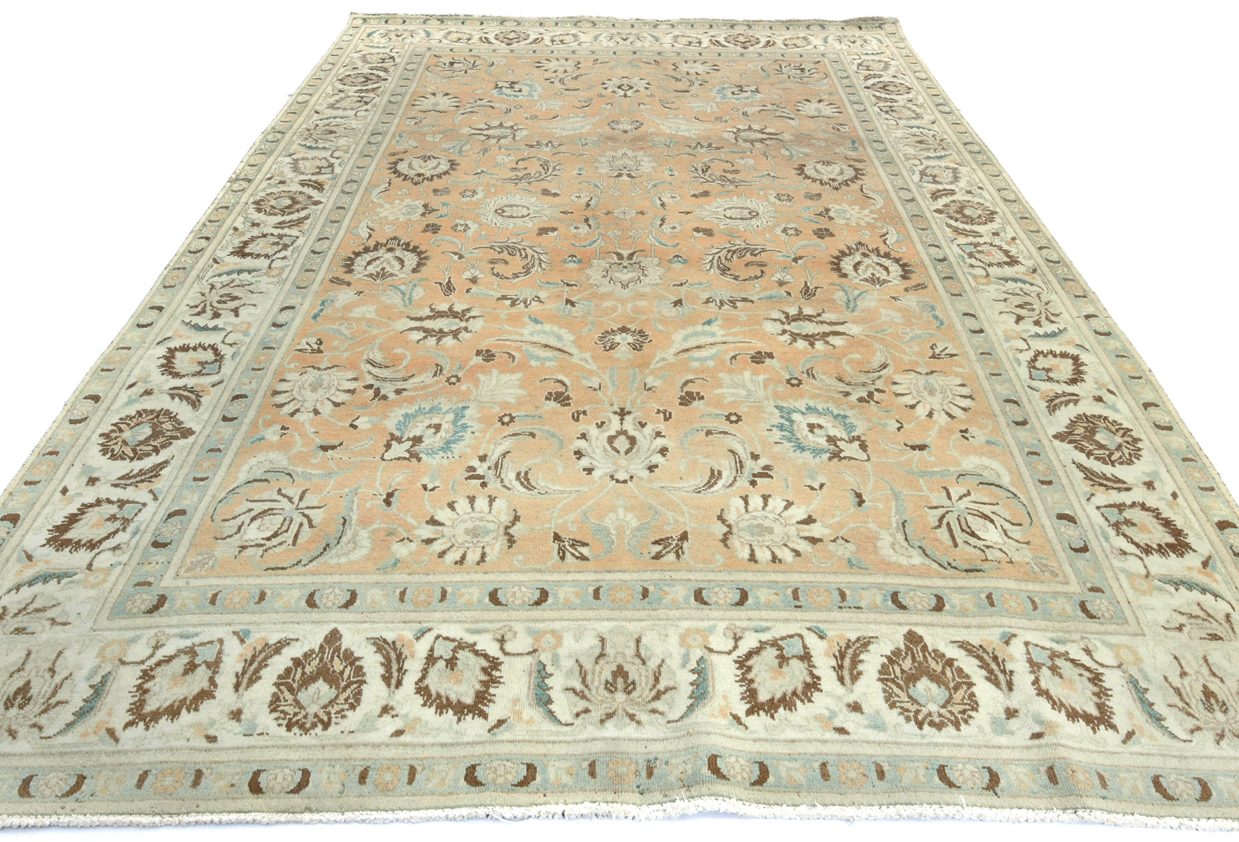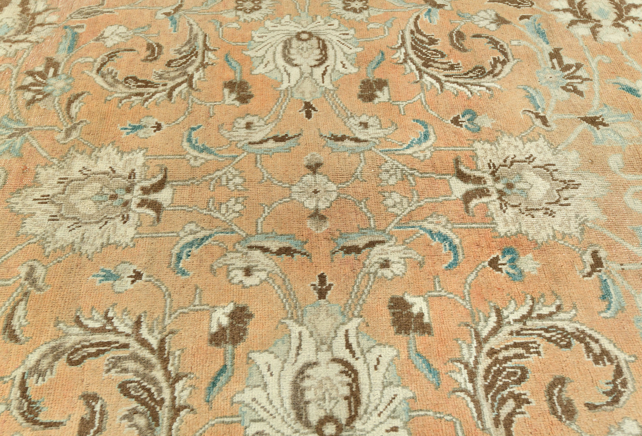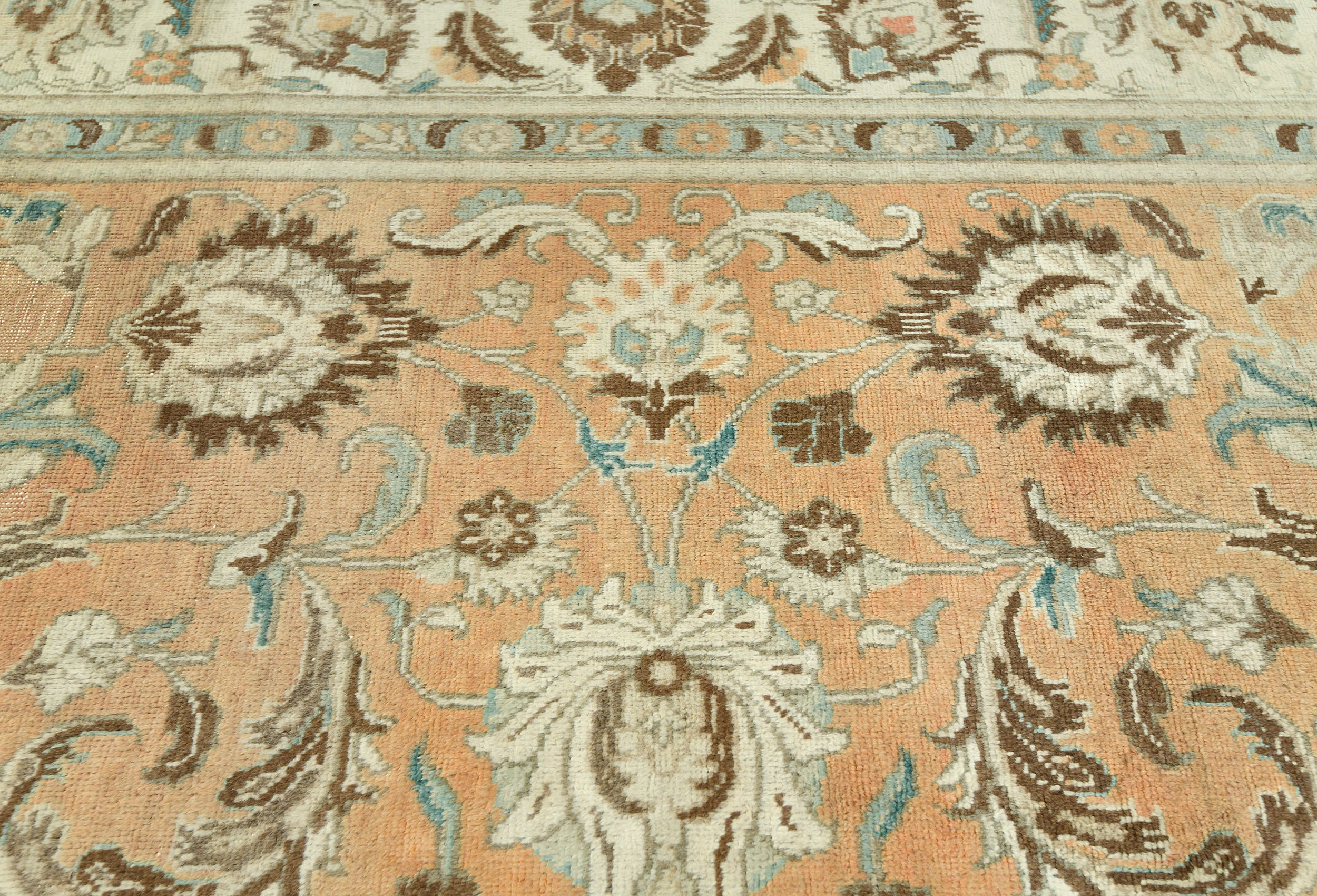 This authentic new 8X12 peach Oriental rug was crafted by the hands of skilled weavers enthused by a variety of lovely artistic designs, to recreate the aged look of the unique piece with a richness of color and beautifully elaborated background field. What set this vintage style Oriental area rug from the others are the material and dye used (wool pile and cotton foundation), knot count, ancient designs, fantastic grades, and its regional historical connection: it has deep roots, from the story of the people who produced it to the meaning of the symbols and colors displayed across its canvas that have been praised for centuries. This Indian home décor carpet will be completely cozy and inviting that never will go out of style!