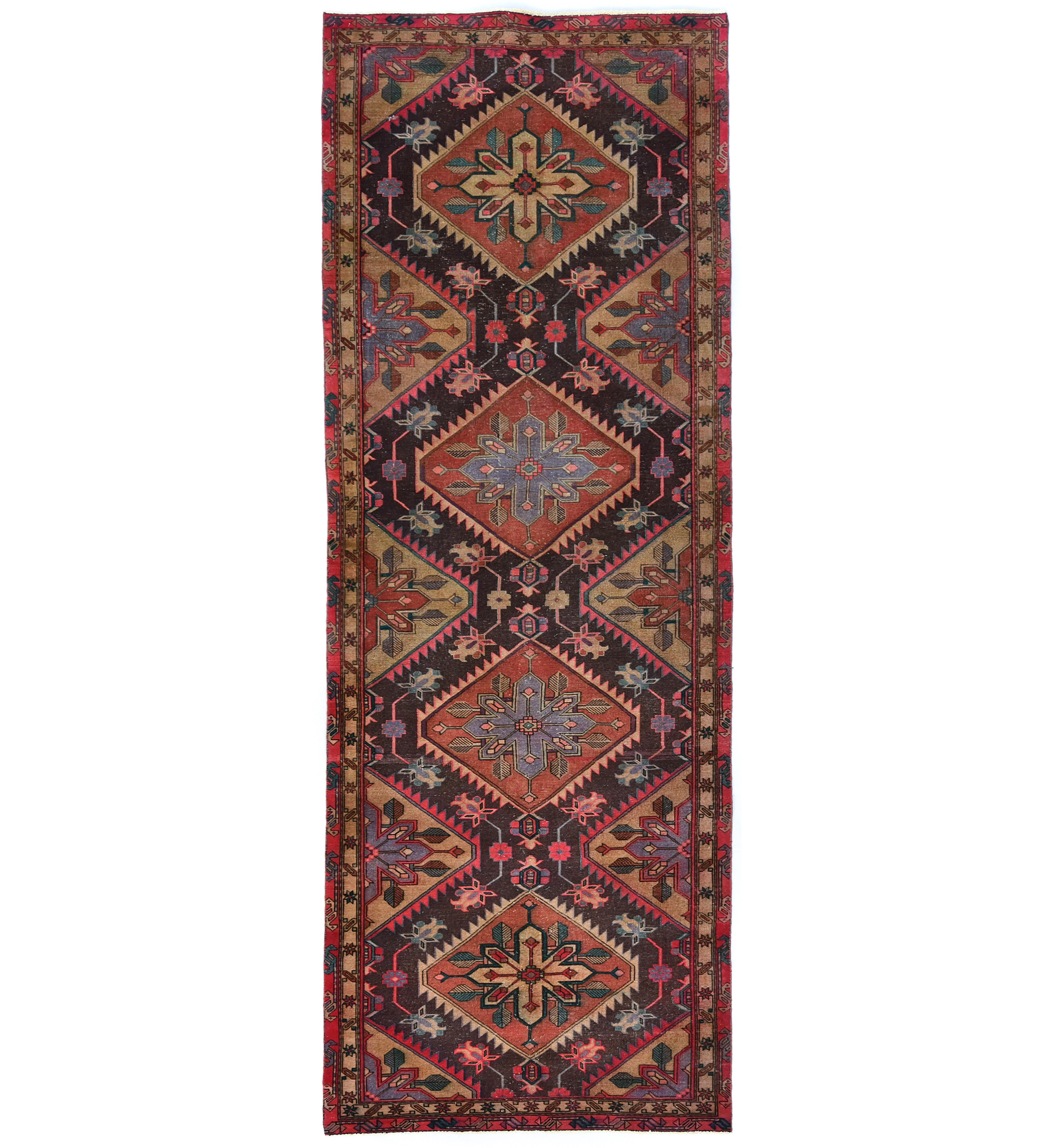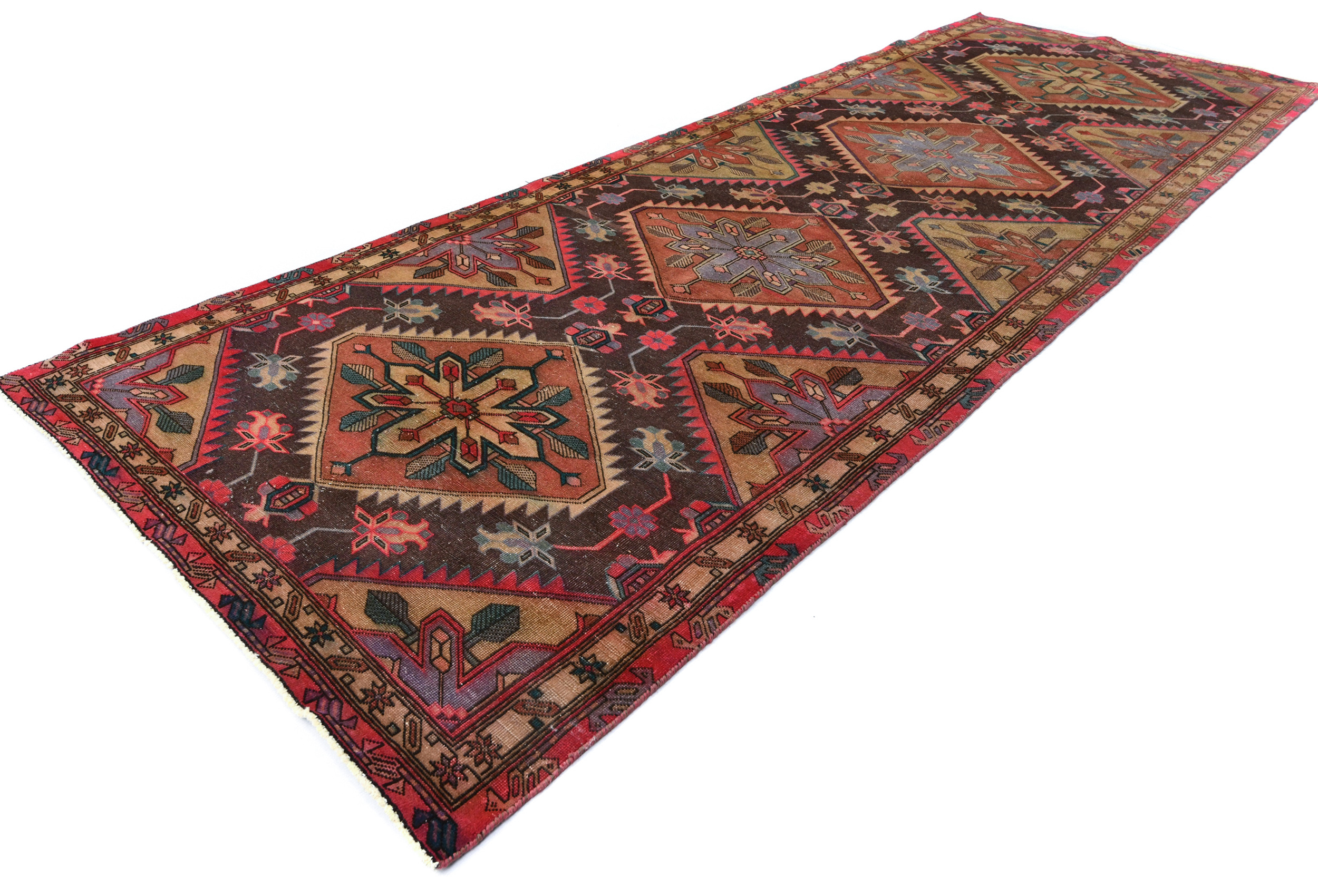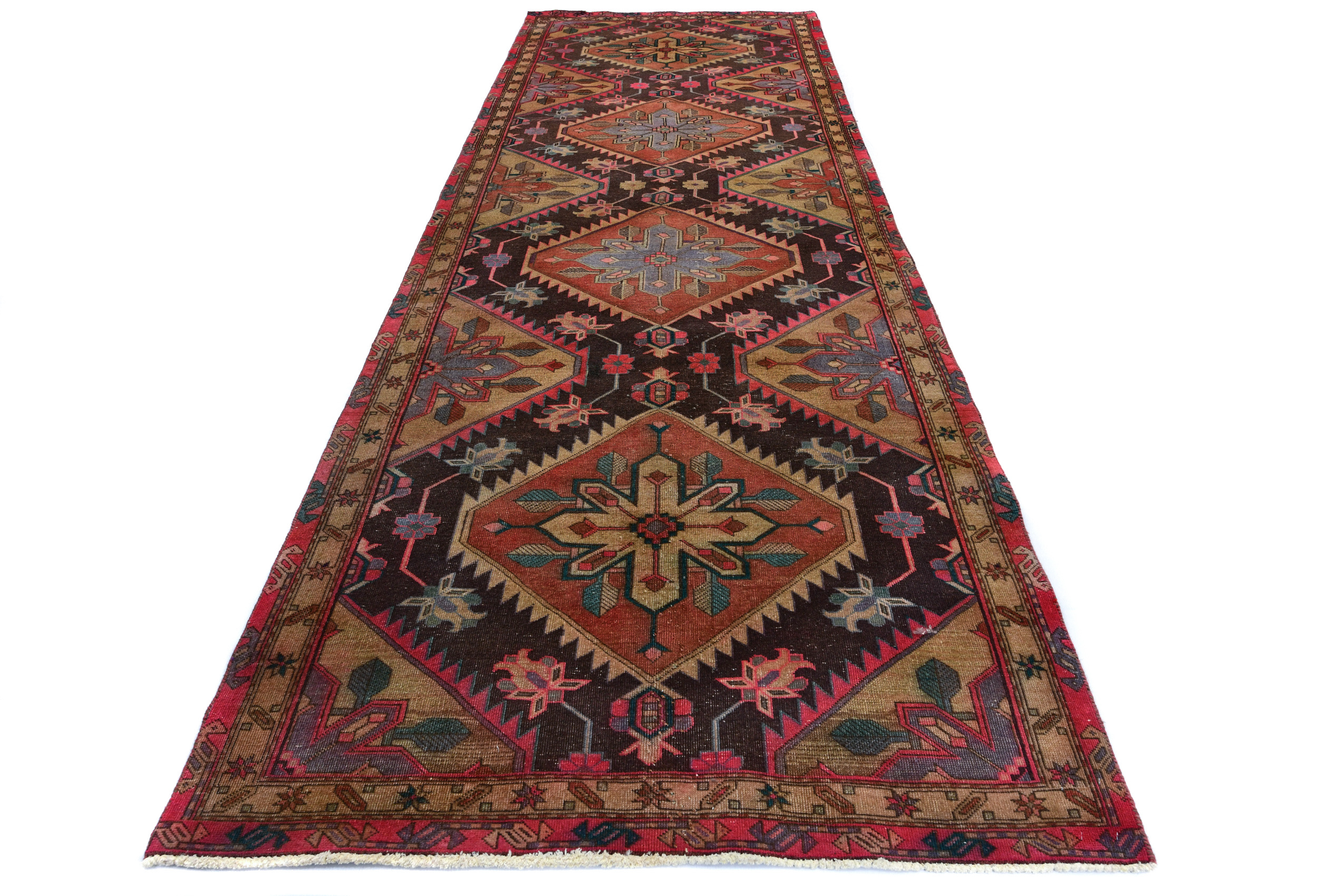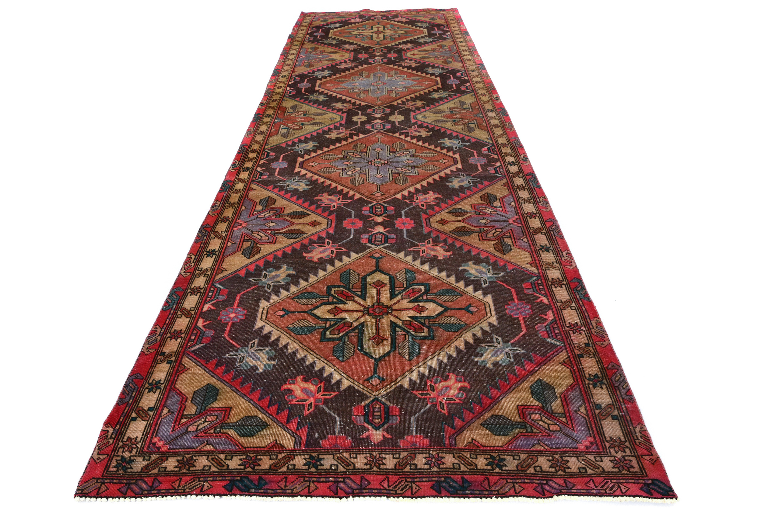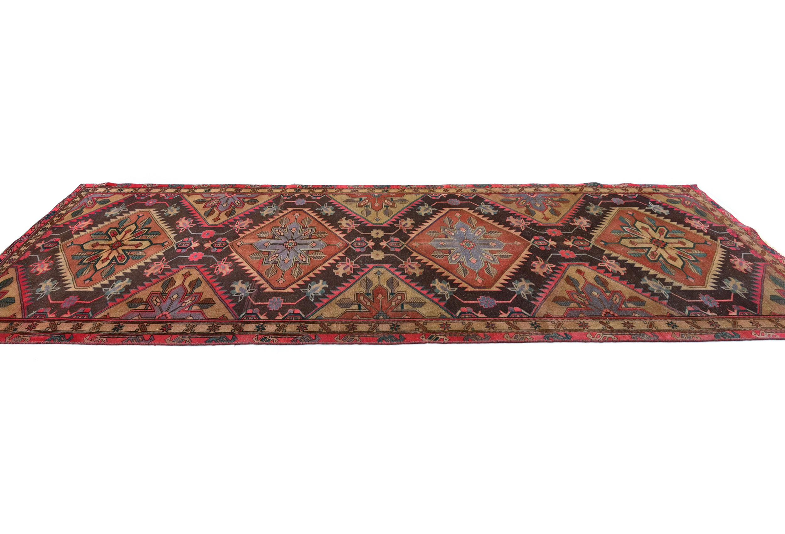 Handmade antique 4'5X12 brown Oriental runner made with vegetable dyes (fine wool pile and cotton foundation), superior knot count, and alluring ancient designs. This Oriental runner never will go out of style and would be among your most valuable treasures.