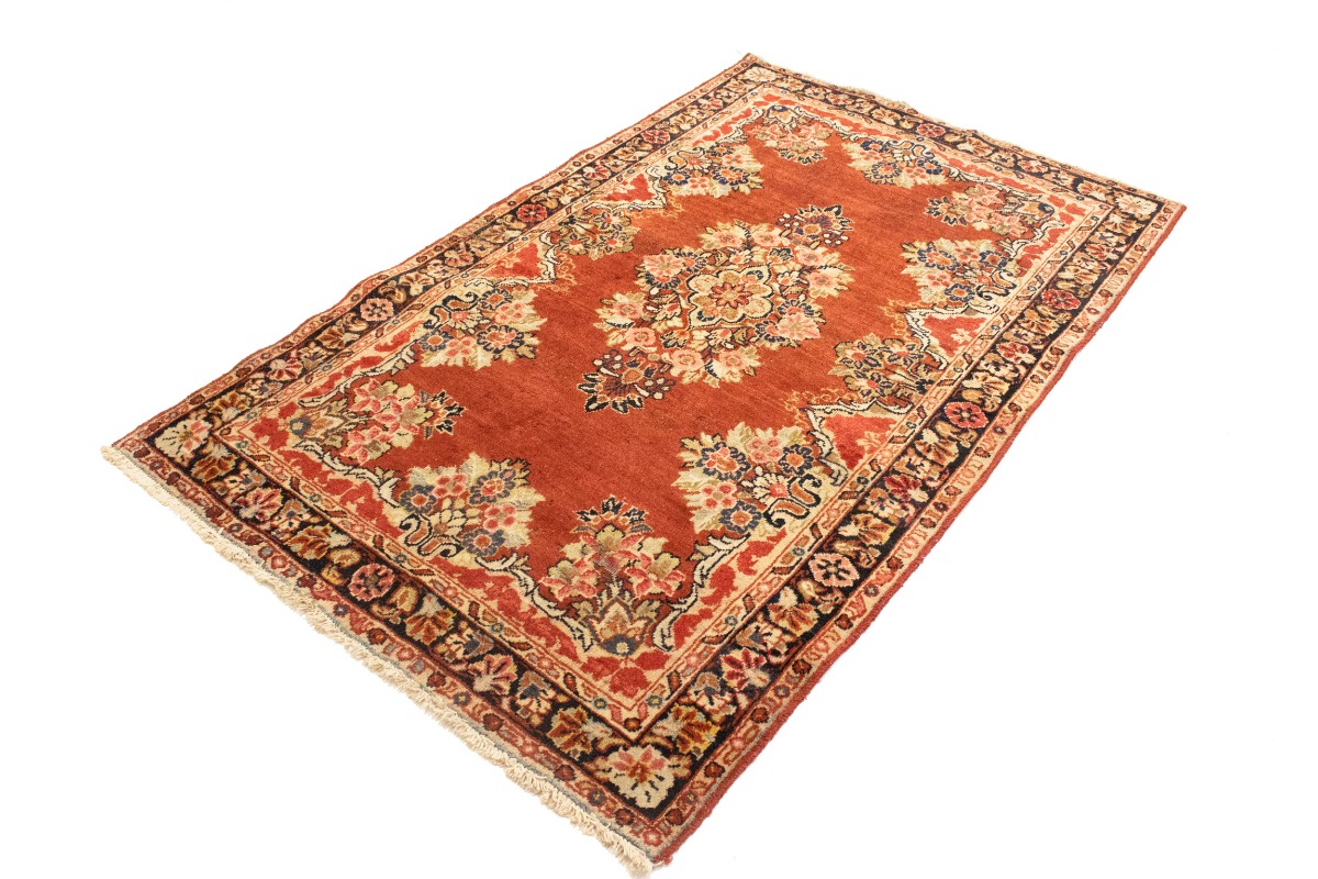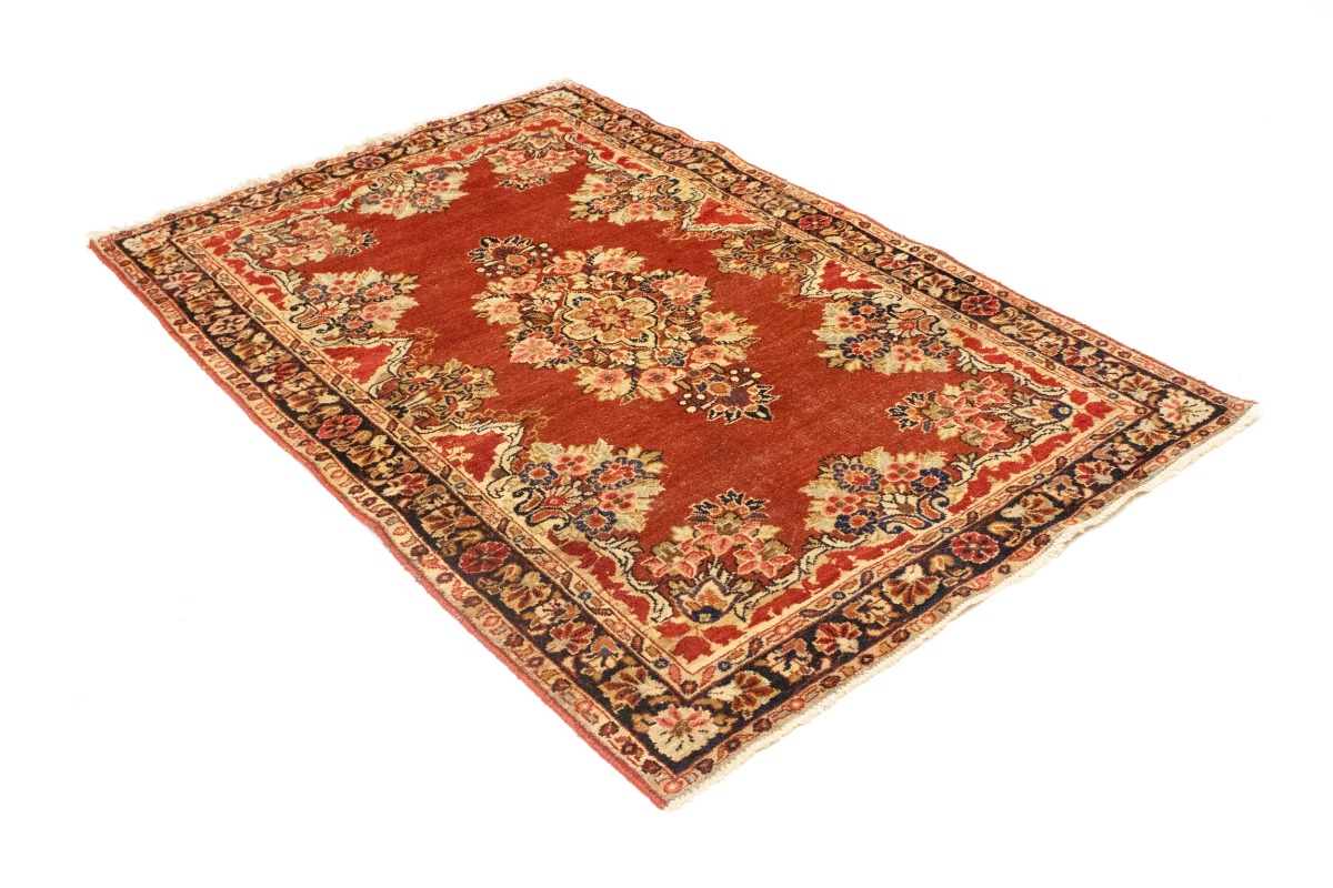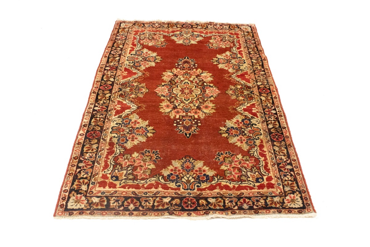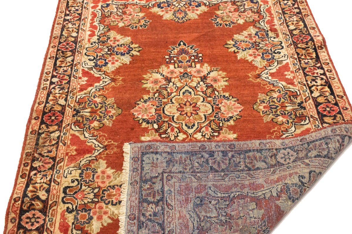Hand Knotted semi antique 4'3X6'9 orange-red Persian rug made with vegetable dyes (fine wool pile and cotton foundation), superior knot count, and appealing ancient designs. This Oriental rug never will go out of style and would be among your most valuable treasures.