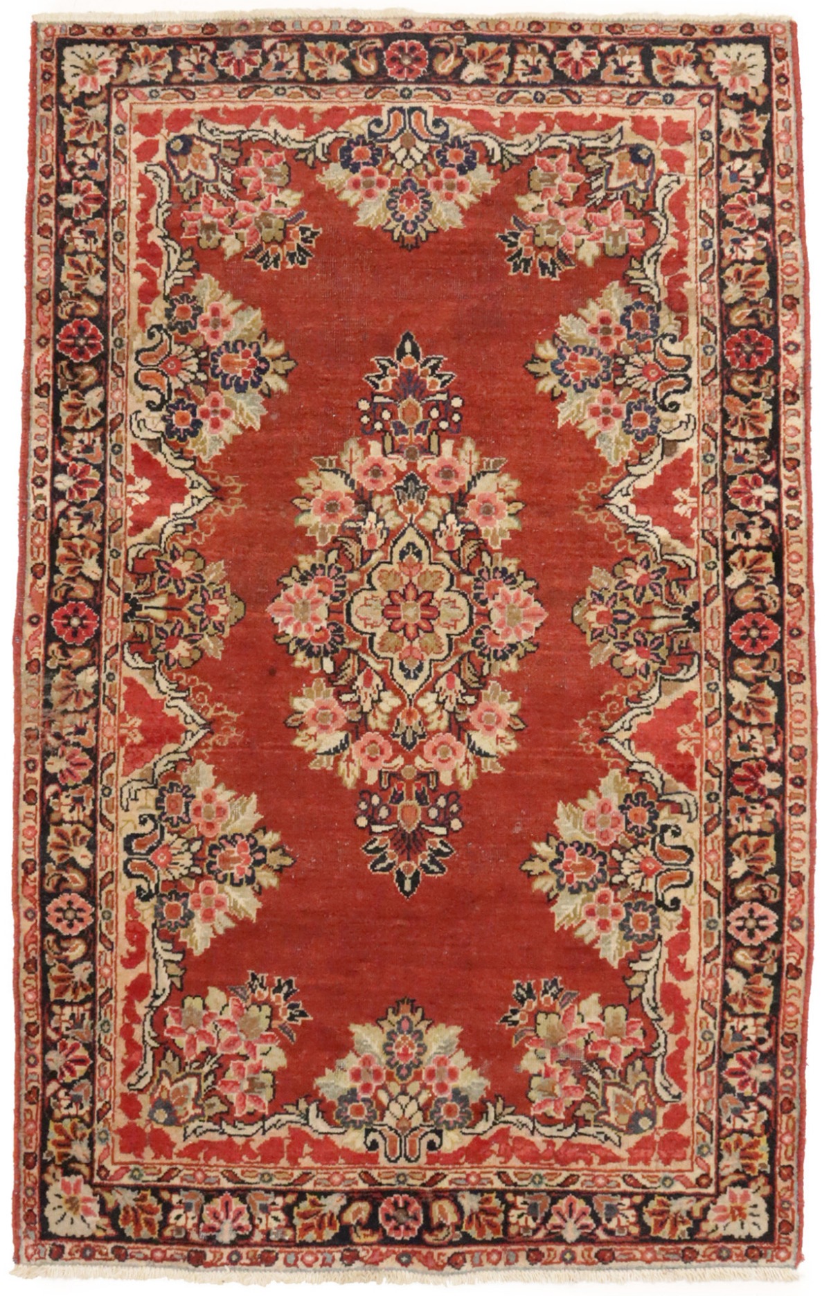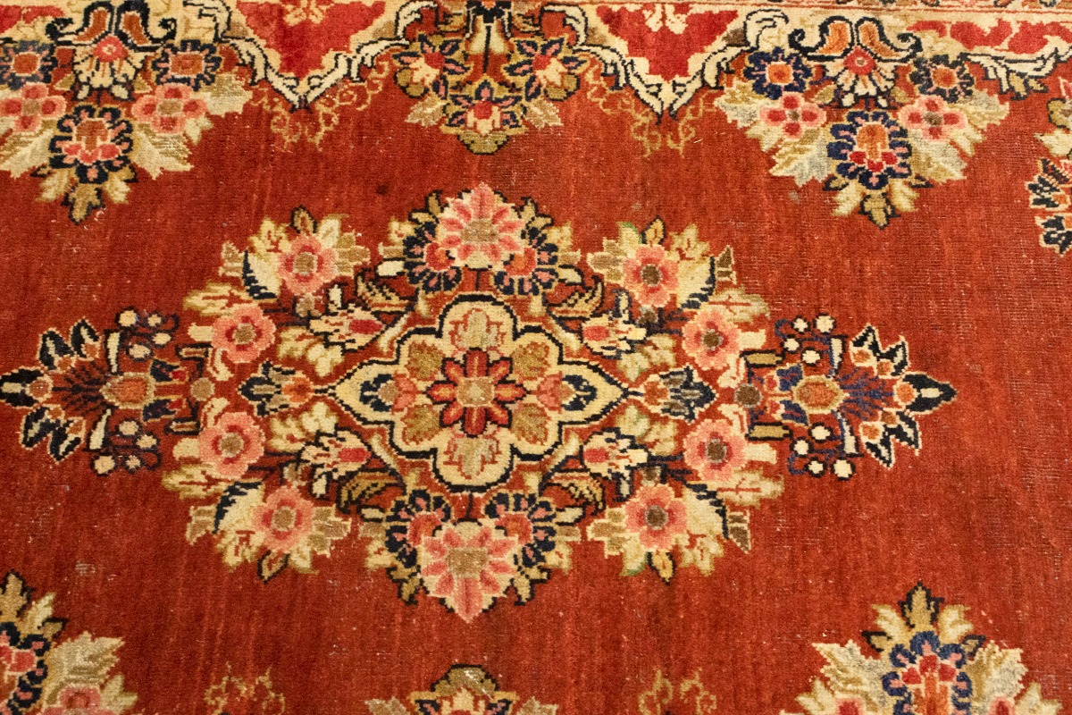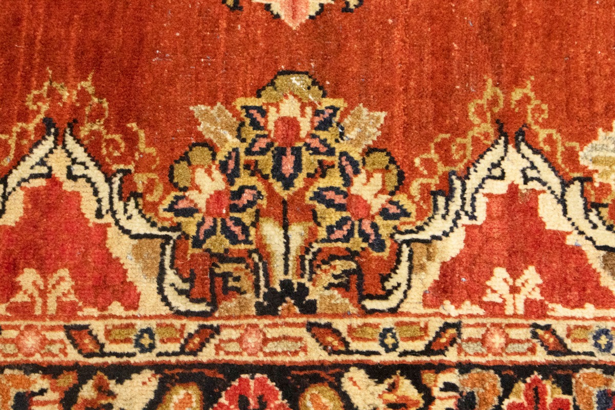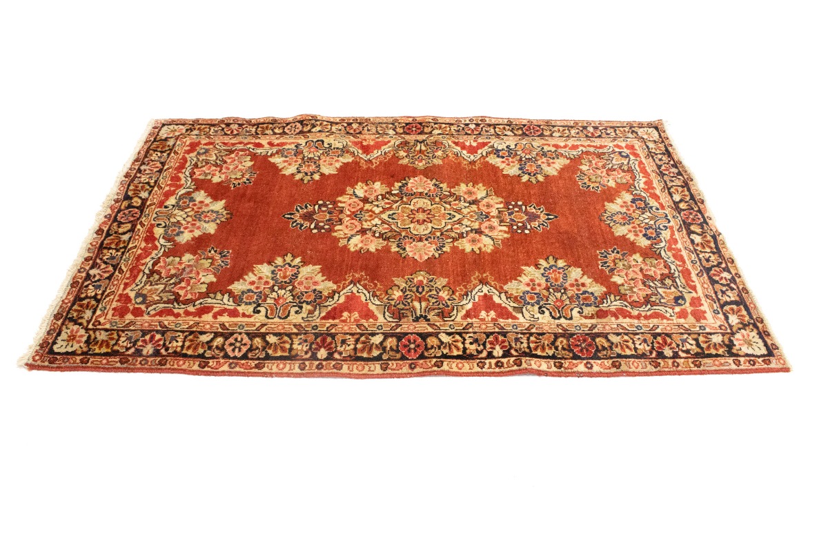 Hand Knotted semi antique 4'3X6'9 orange-red Persian rug made with vegetable dyes (fine wool pile and cotton foundation), superior knot count, and appealing ancient designs. This Oriental rug never will go out of style and would be among your most valuable treasures.
