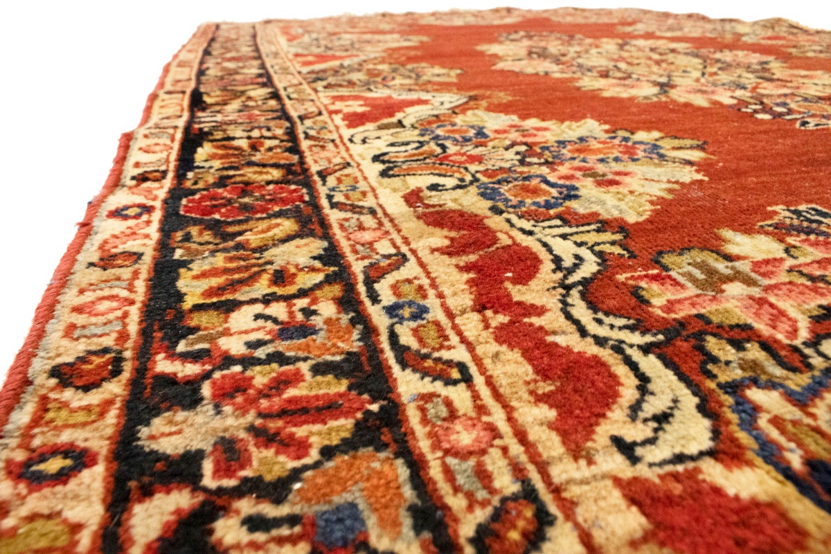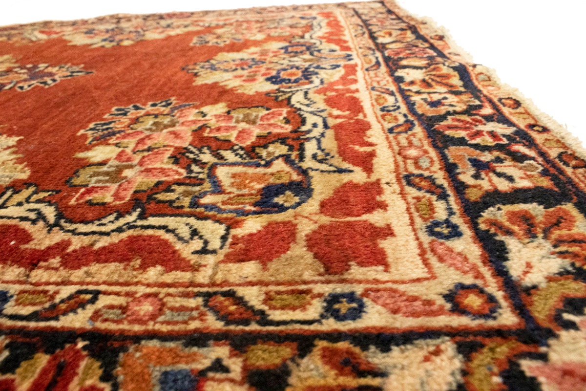This authentic 4'3X6'9 orange-red vintage Persian rug was finely knotted by the hands of weavers influenced by a variety of amazing artistic designs, to recreate the aged look of the exceptional piece with a richness of color and embellished floral background field. What set this traditional Oriental area rug from the others are the material and dye used (wool pile and cotton foundation), knot count, antique designs, fantastic grades, and its regional historical connection: it has deep roots, from the story of the people who produced it to the meaning of the symbols and colors displayed across its canvas that have been praised for centuries. This classic home décor carpet will be completely cozy and inviting that never will go out of style!