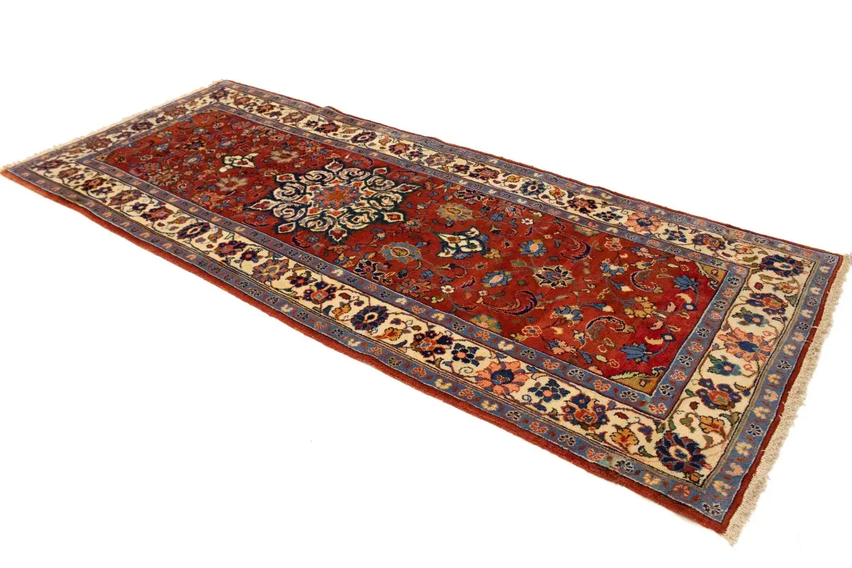 Hand Knotted semi antique 4'5X10'8 red Persian runner made with vegetable dyes (fine wool pile and cotton foundation), exceptional knot count, and appealing ancient designs. This Oriental runner never will go out of style and would be among your most valuable treasures.