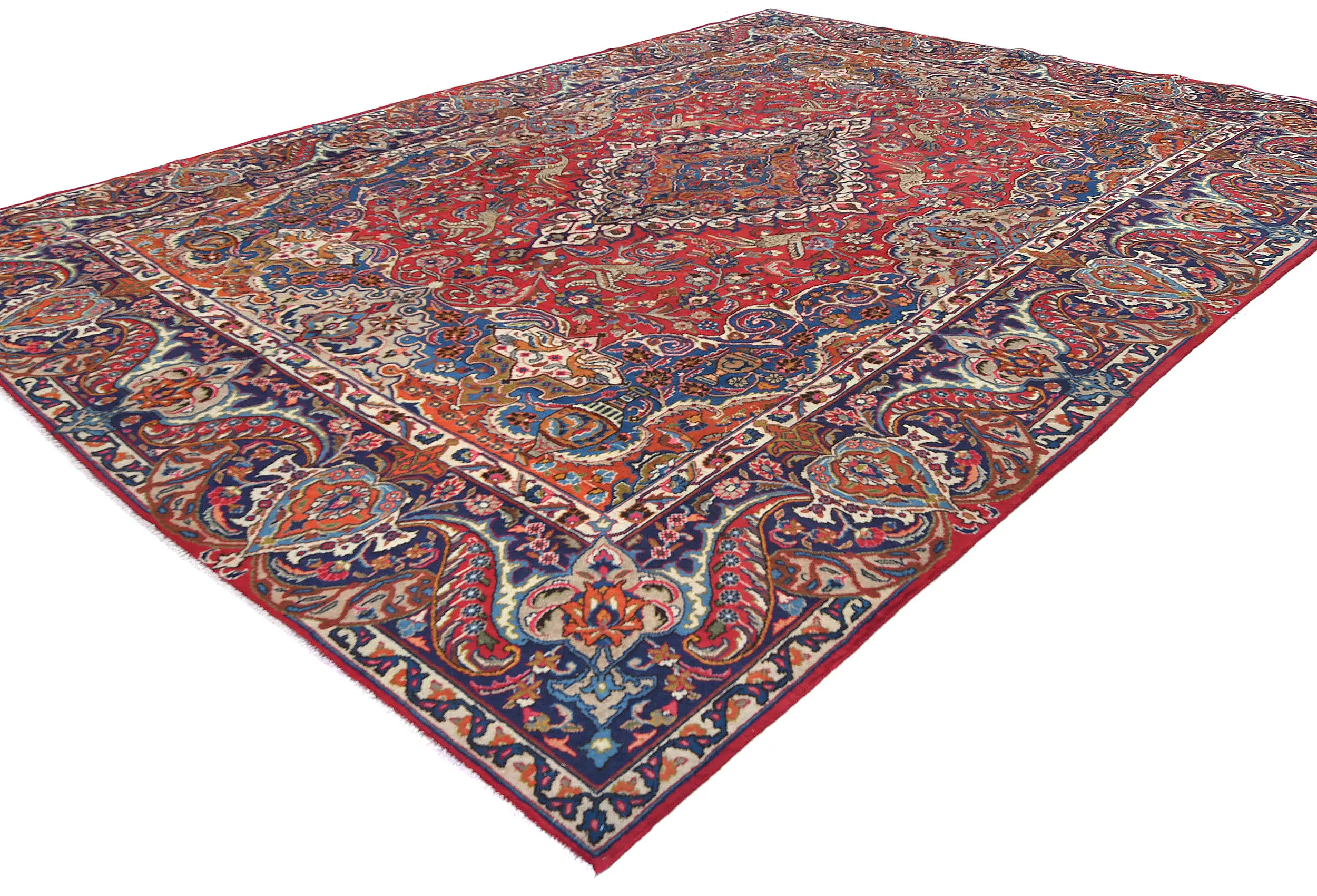 This authentic 10X13 red vintage Persian rug was finely knotted by the hands of weavers influenced by a variety of amazing artistic designs, to recreate the aged look of the exceptional piece with a richness of color and embellished floral background field. What set this traditional Oriental area rug from the others are the material and dye used (wool pile and cotton foundation), knot count, antique designs, fantastic grades, and its regional historical connection: it has deep roots, from the story of the people who produced it to the meaning of the symbols and colors displayed across its canvas that have been praised for centuries. This classic home décor carpet will be completely cozy and inviting that never will go out of style! Also, this Oriental rug would be among your most valuable treasures, it is a great investment that increase in value over time, and it will last a lifetime because was woven with high-quality, all-natural wool; it won’t rip, tear, or shed. Eco-friendly, opulent yet affordable; this Persian rug will give you an extra pop of character to help define your home environment with luxury and warmth that will capture the eyes and attention of your audience (homeowners, designers, decorators, family and friends). RT-7410