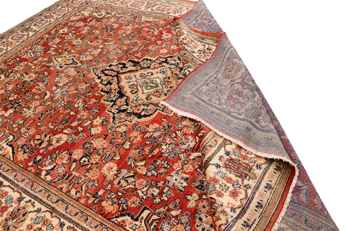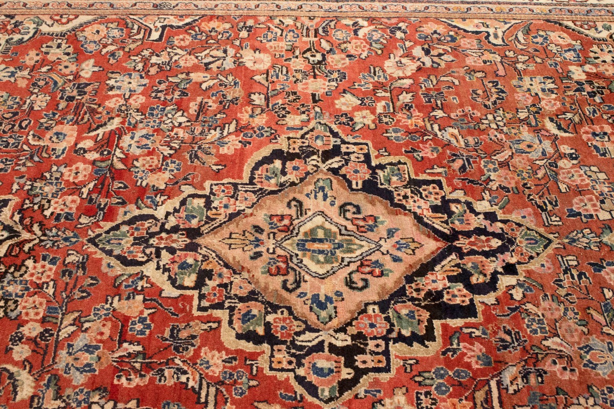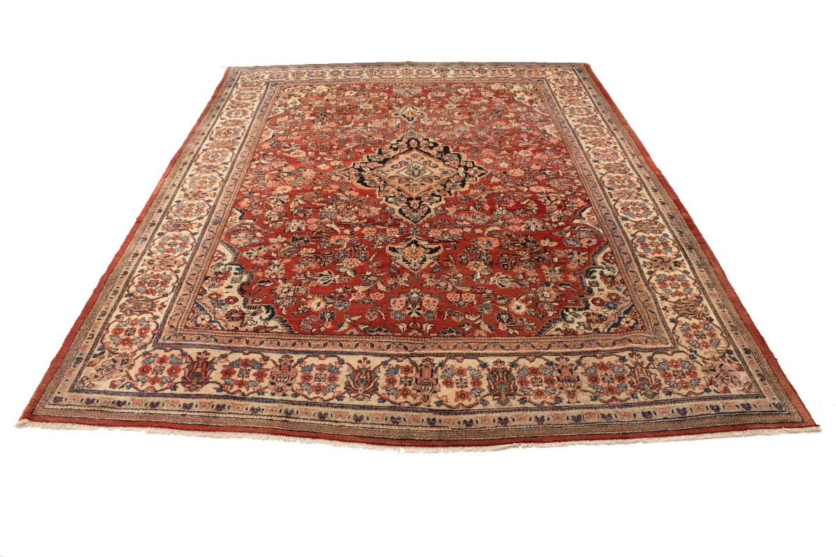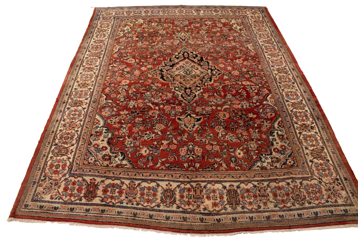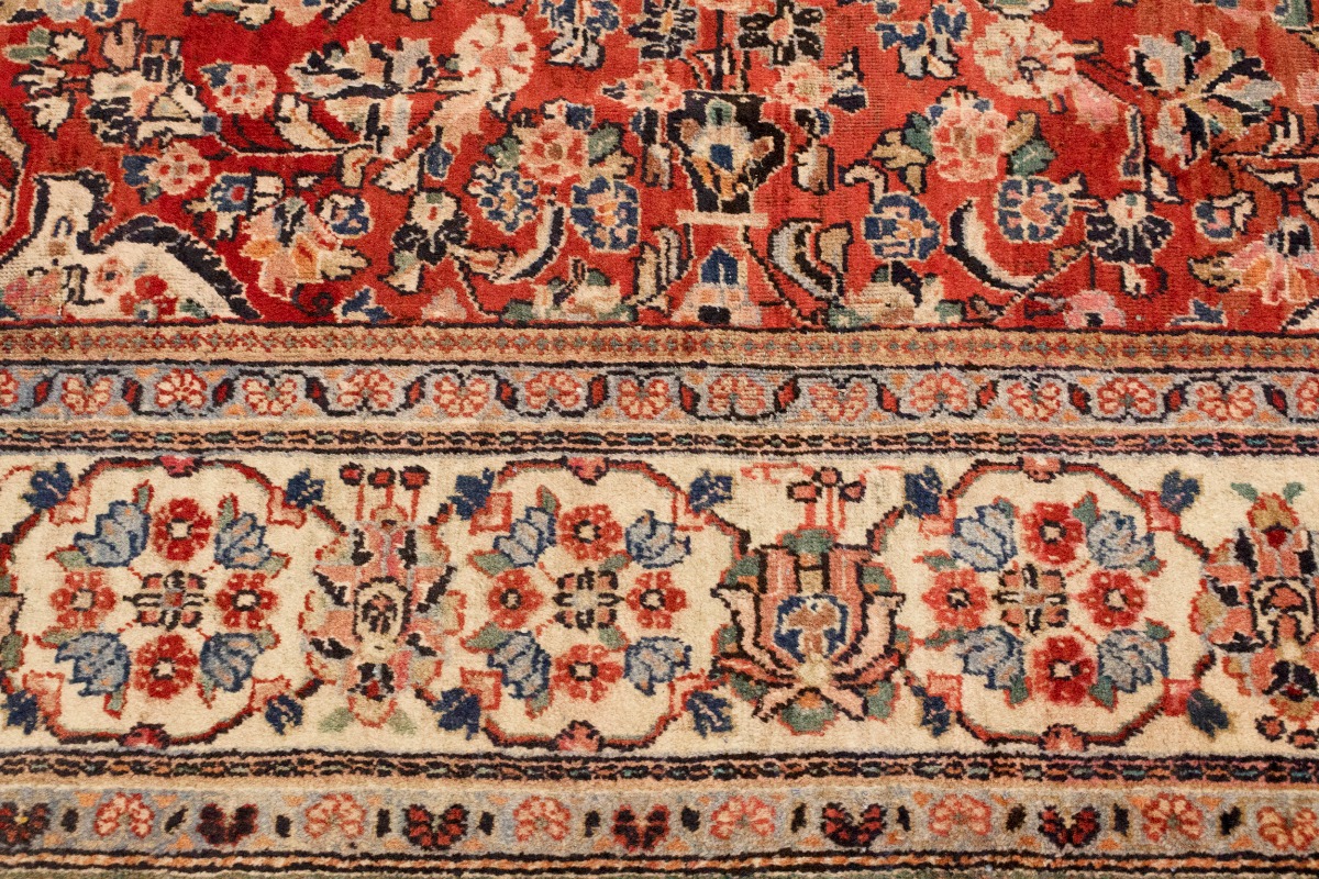Hand Knotted semi antique 10X13 red Persian rug made with vegetable dyes (fine wool pile and cotton foundation), exceptional knot count, and appealing ancient designs. This Oriental rug never will go out of style and would be among your most valuable treasures.
