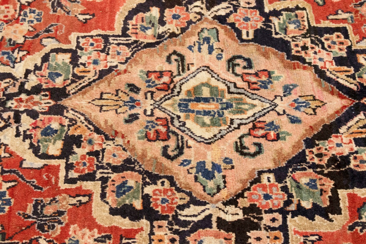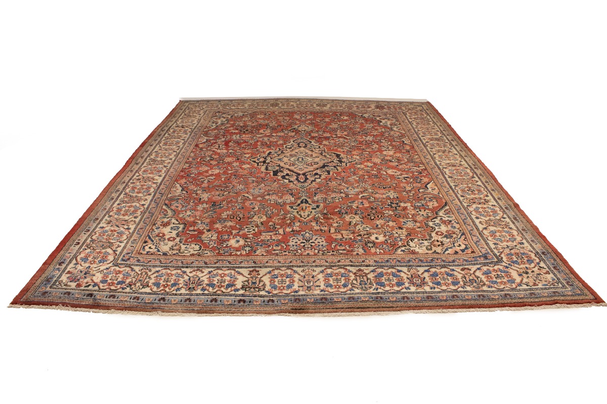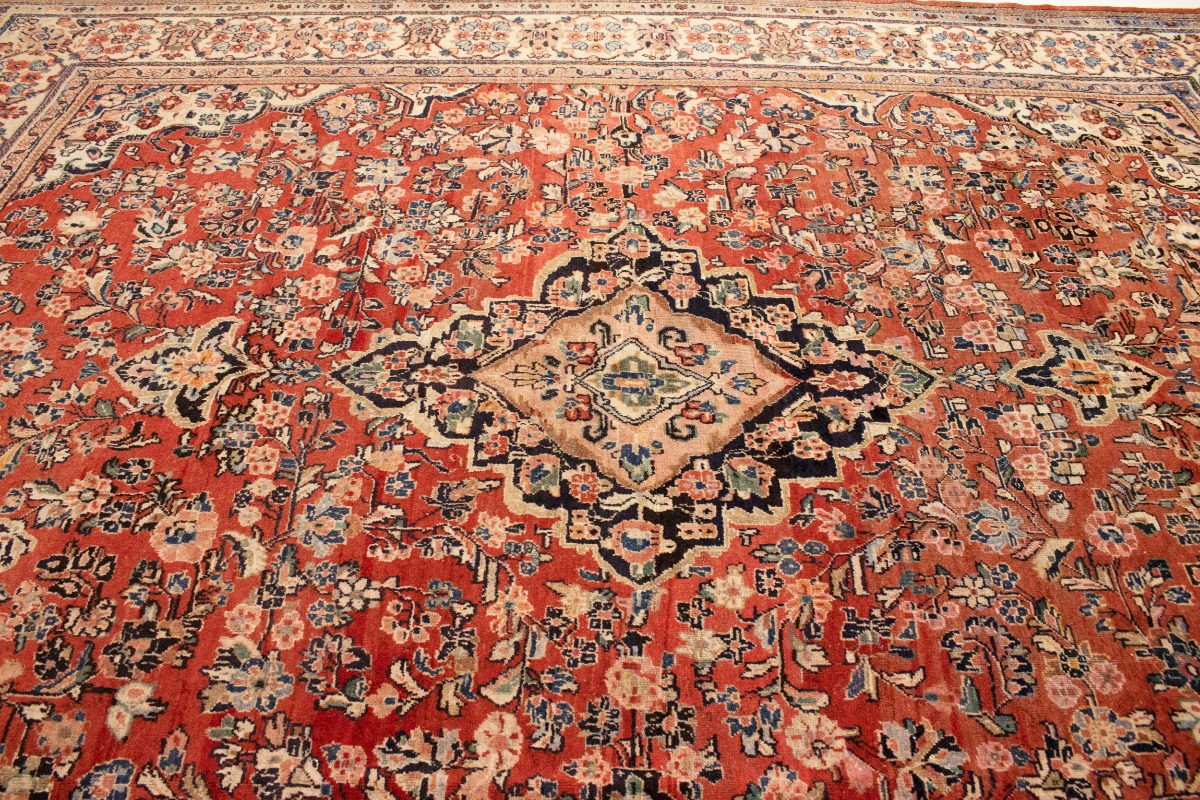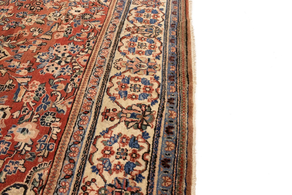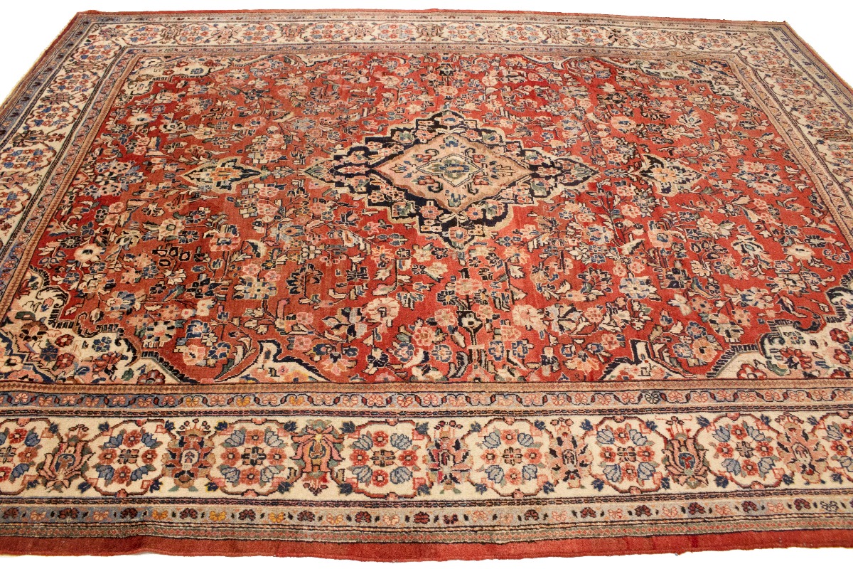This authentic 10X13 red vintage Persian rug was finely knotted by the hands of weavers influenced by a variety of amazing artistic designs, to recreate the aged look of the exceptional piece with a richness of color and embellished floral background field. What set this traditional Oriental area rug from the others are the material and dye used (wool pile and cotton foundation), knot count, antique designs, fantastic grades, and its regional historical connection: it has deep roots, from the story of the people who produced it to the meaning of the symbols and colors displayed across its canvas that have been praised for centuries. This classic home décor carpet will be completely cozy and inviting that never will go out of style!