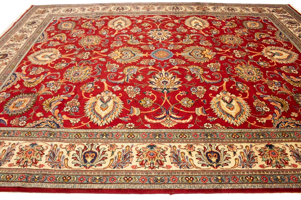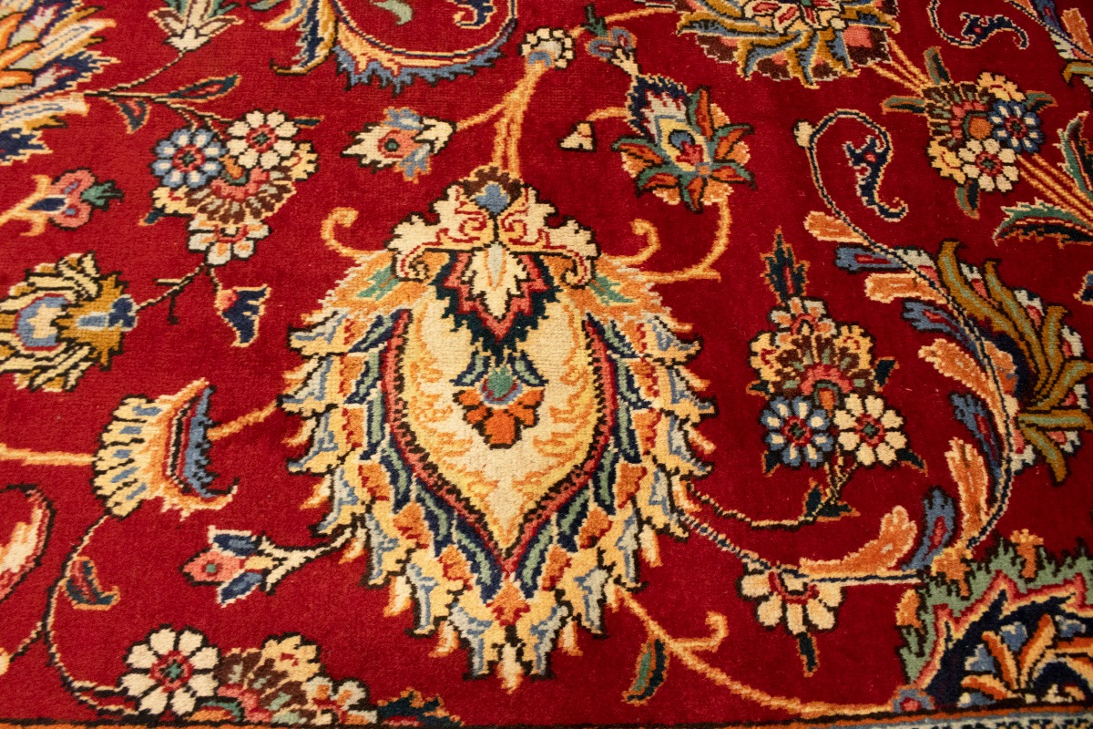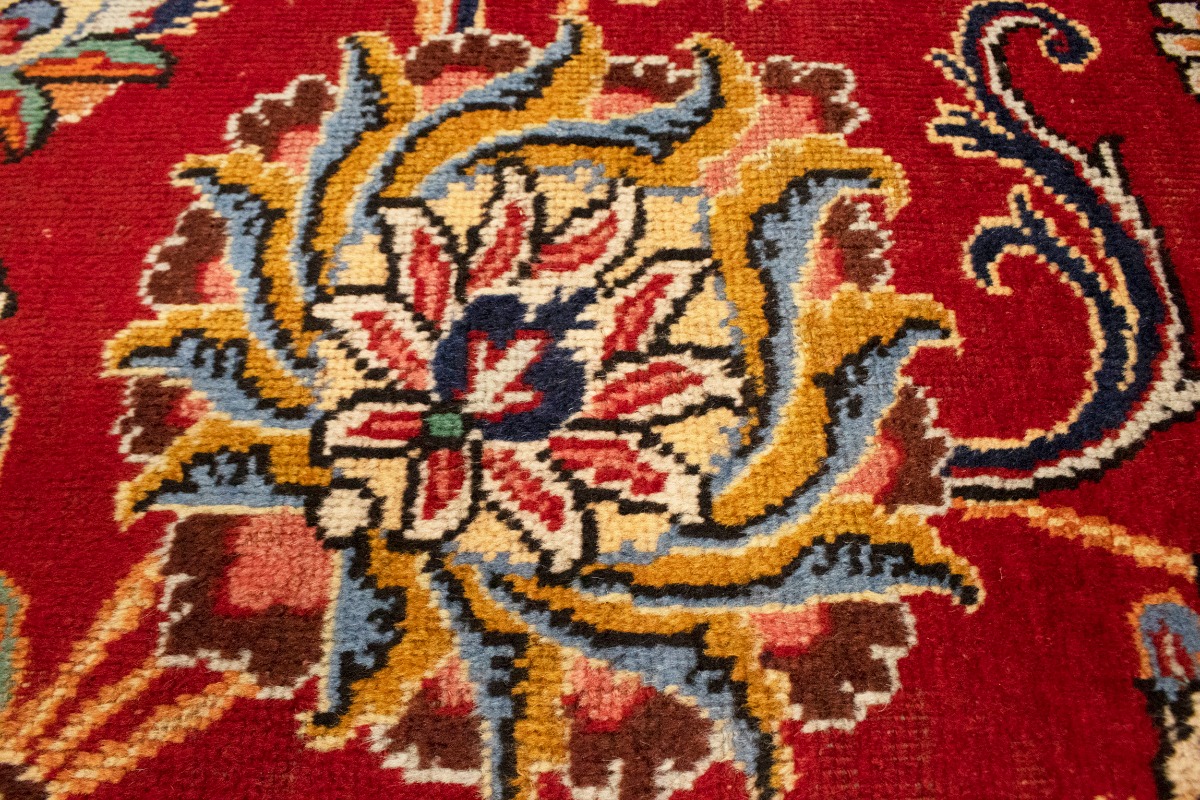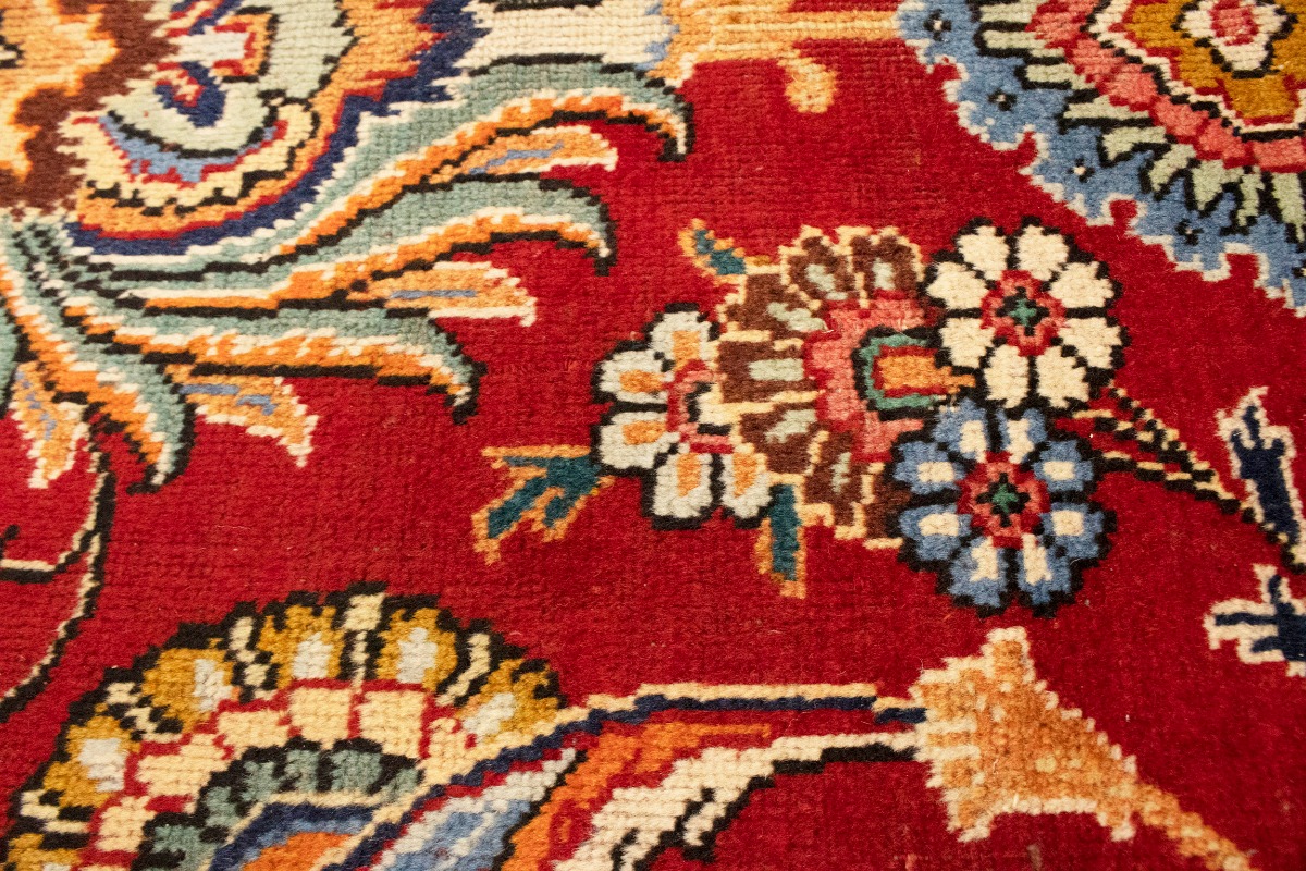 This original 12X15 red vintage Persian rug was crafted by the hands of skilled weavers enthused by a variety of lovely artistic designs, to recreate the aged look of the unique piece with a richness of color and beautifully elaborated floral background field. What set this traditional Oriental area rug from the others are the material and dye used (wool pile and cotton foundation), knot count, ancient designs, fantastic grades, and its regional historical connection: it has deep roots, from the story of the people who produced it to the meaning of the symbols and colors displayed across its canvas that have been praised for centuries. This classic home décor carpet will be completely cozy and inviting that never will go out of style!