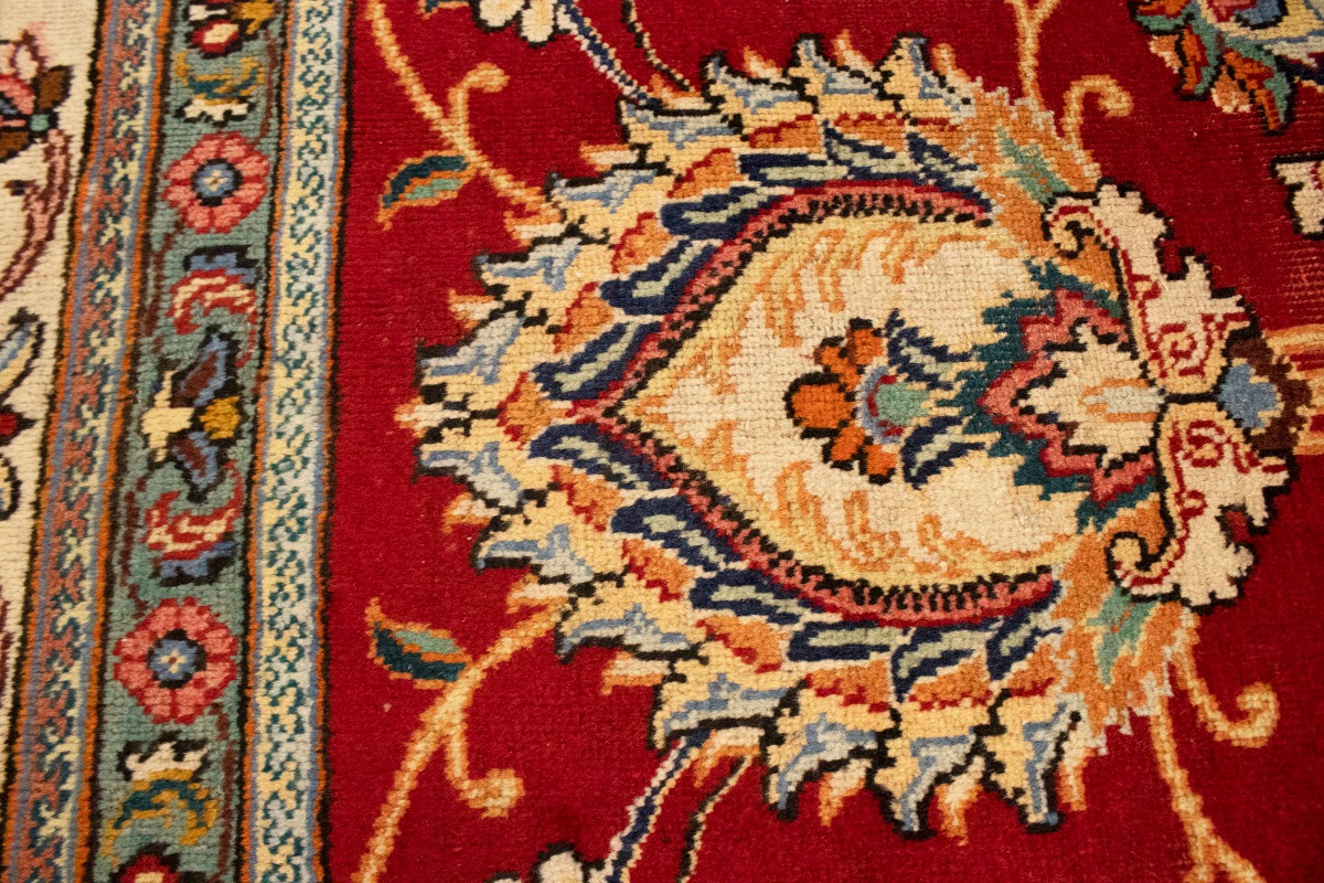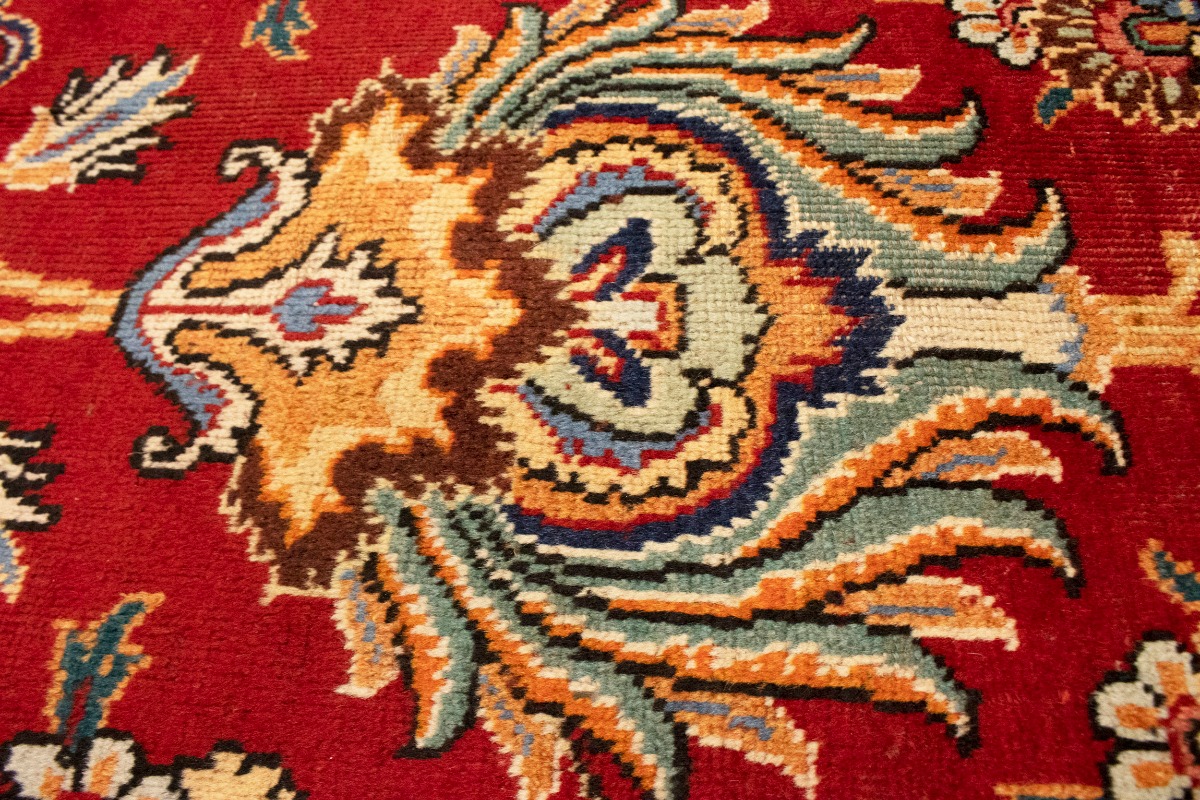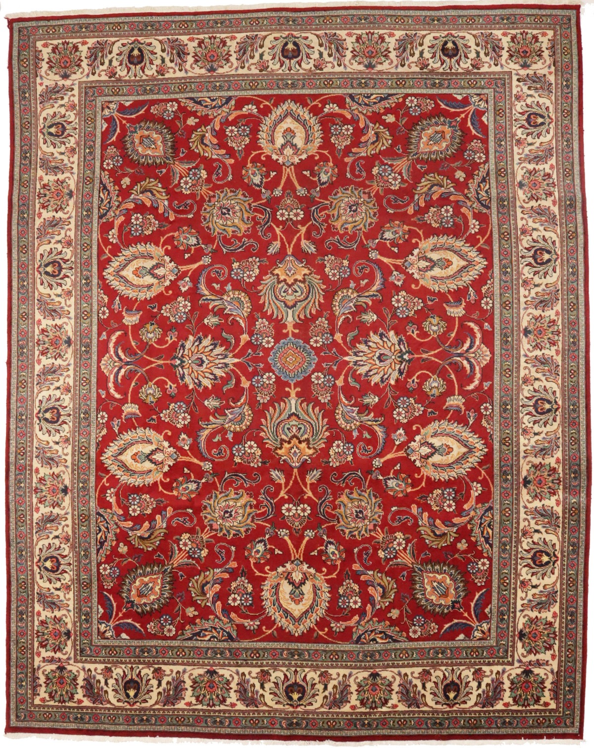 This original 12X15 red vintage Persian rug was crafted by the hands of skilled weavers enthused by a variety of lovely artistic designs, to recreate the aged look of the unique piece with a richness of color and beautifully elaborated floral background field. What set this traditional Oriental area rug from the others are the material and dye used (wool pile and cotton foundation), knot count, ancient designs, fantastic grades, and its regional historical connection: it has deep roots, from the story of the people who produced it to the meaning of the symbols and colors displayed across its canvas that have been praised for centuries. This classic home décor carpet will be completely cozy and inviting that never will go out of style!