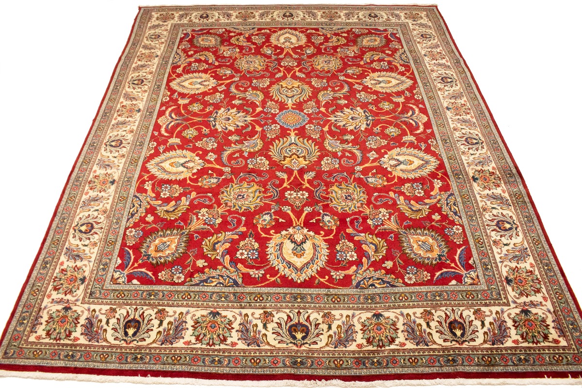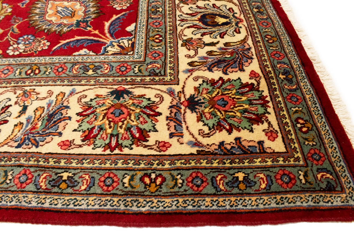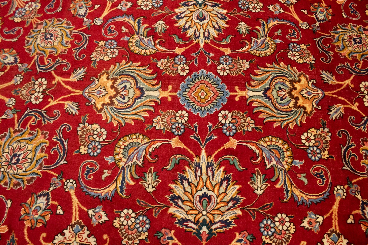 Handmade semi antique 12X15 red Persian rug made with natural dyes (fine wool pile and cotton foundation), superior knot count, and appealing ancient designs. This Oriental rug never will go out of style and would be among your most valuable treasures.
