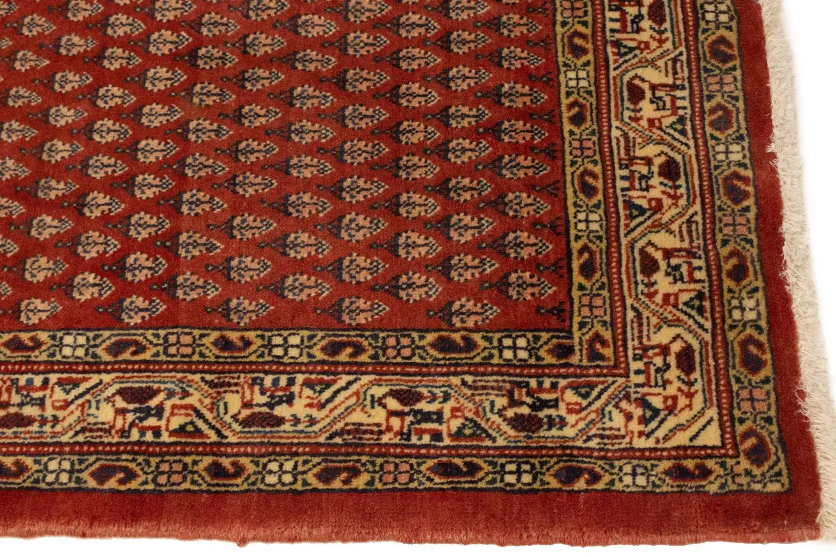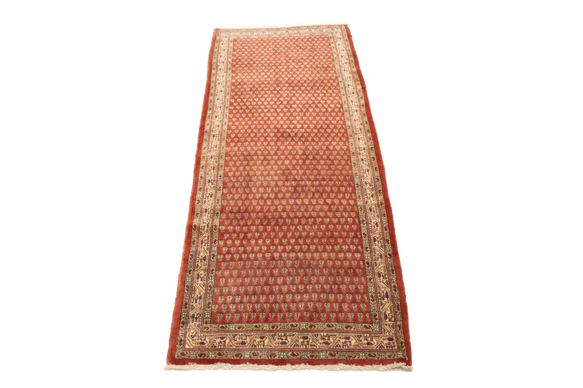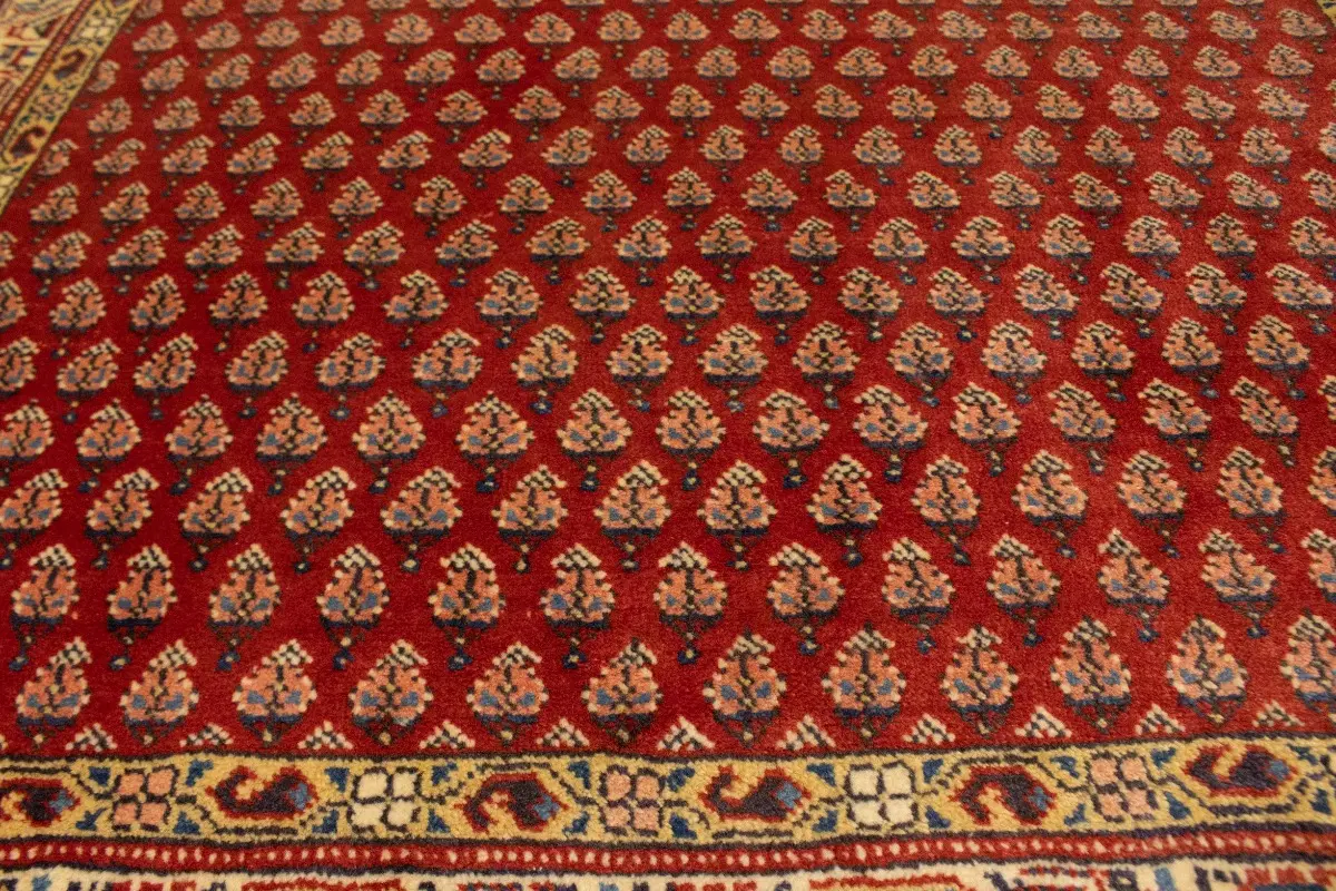Hand Knotted semi antique 4X10 red Persian runner made with vegetable dyes (fine wool pile and cotton foundation), exceptional knot count, and appealing ancient designs. This Oriental runner never will go out of style and would be among your most valuable treasures.