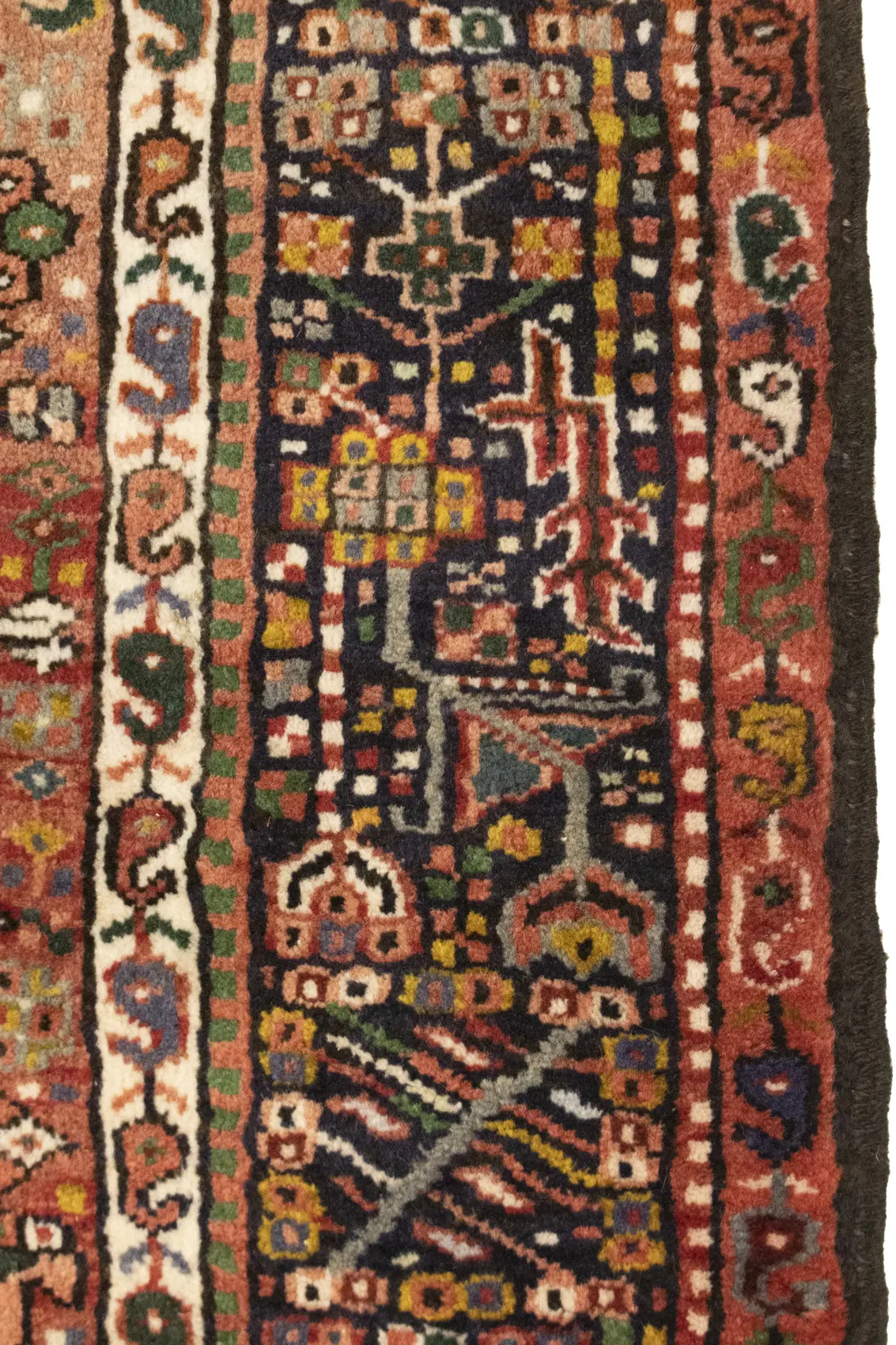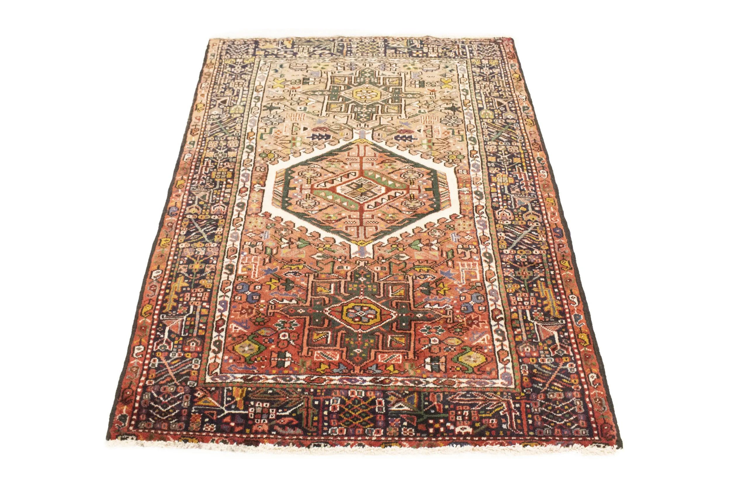 This genuine 4X5 rusty red vintage Persian rug was made by the hands of talented weavers influenced by a variety of gorgeous symmetrical artistic designs, to recreate the aged look of the unique piece with a richness of color and very balanced background field. What set this tribal Oriental area rug from the others are the material and dye used (wool pile and cotton foundation), knot count, antique designs, fantastic grades, and its regional historical connection: it has deep roots, from the story of the people who produced it to the meaning of the symbols and colors displayed across its canvas that have been praised for centuries. This home décor carpet will be completely cozy and inviting that never will go out of style!