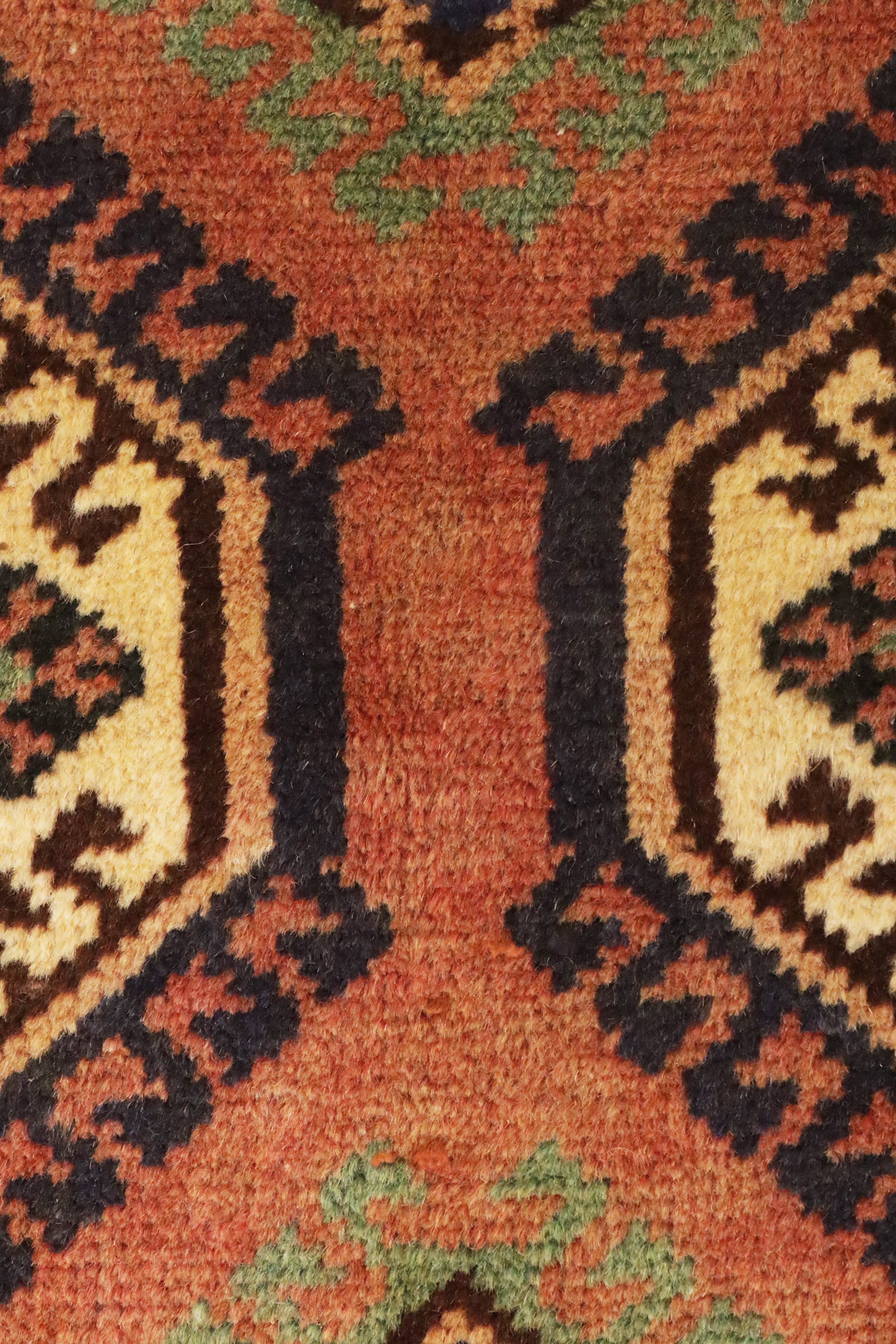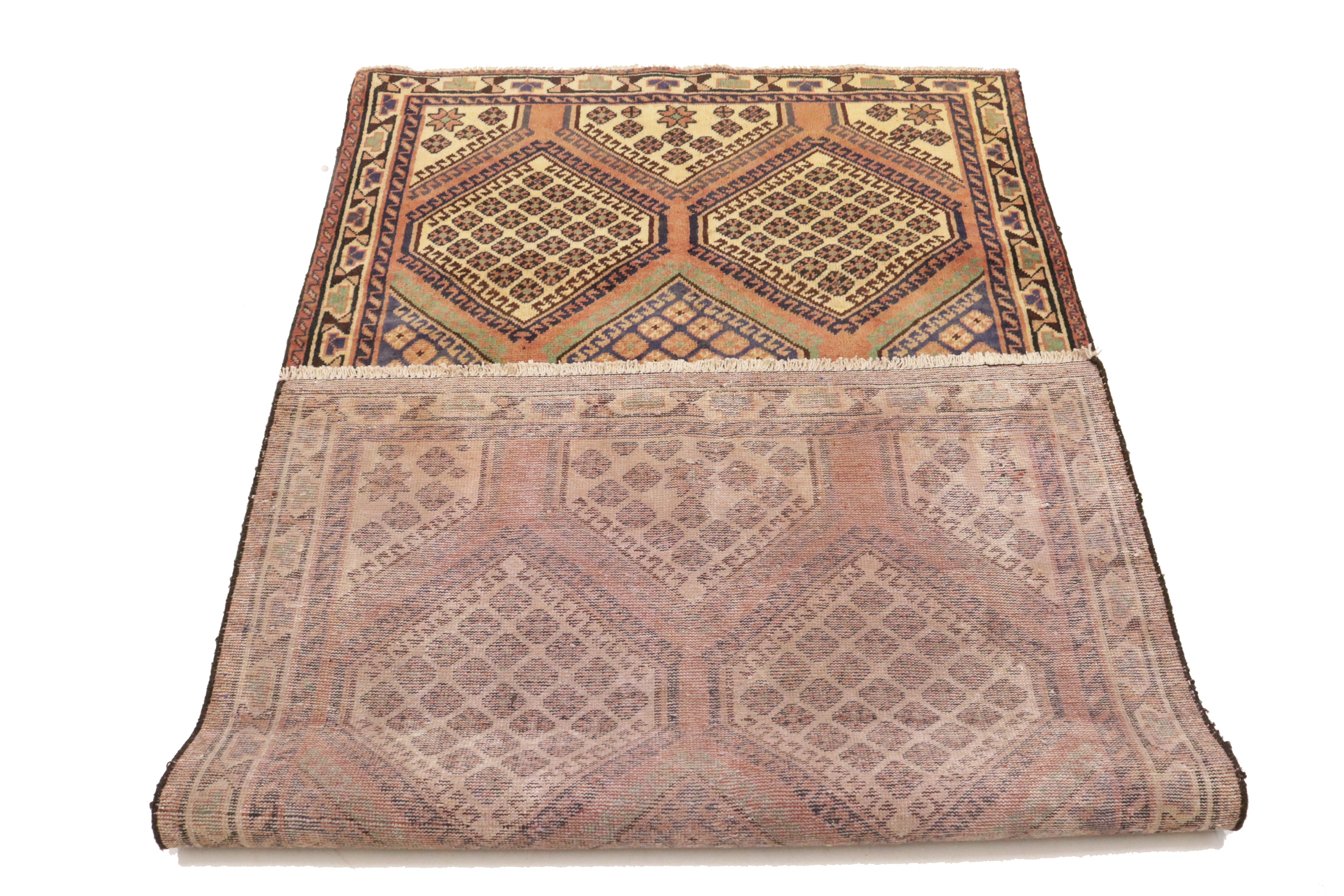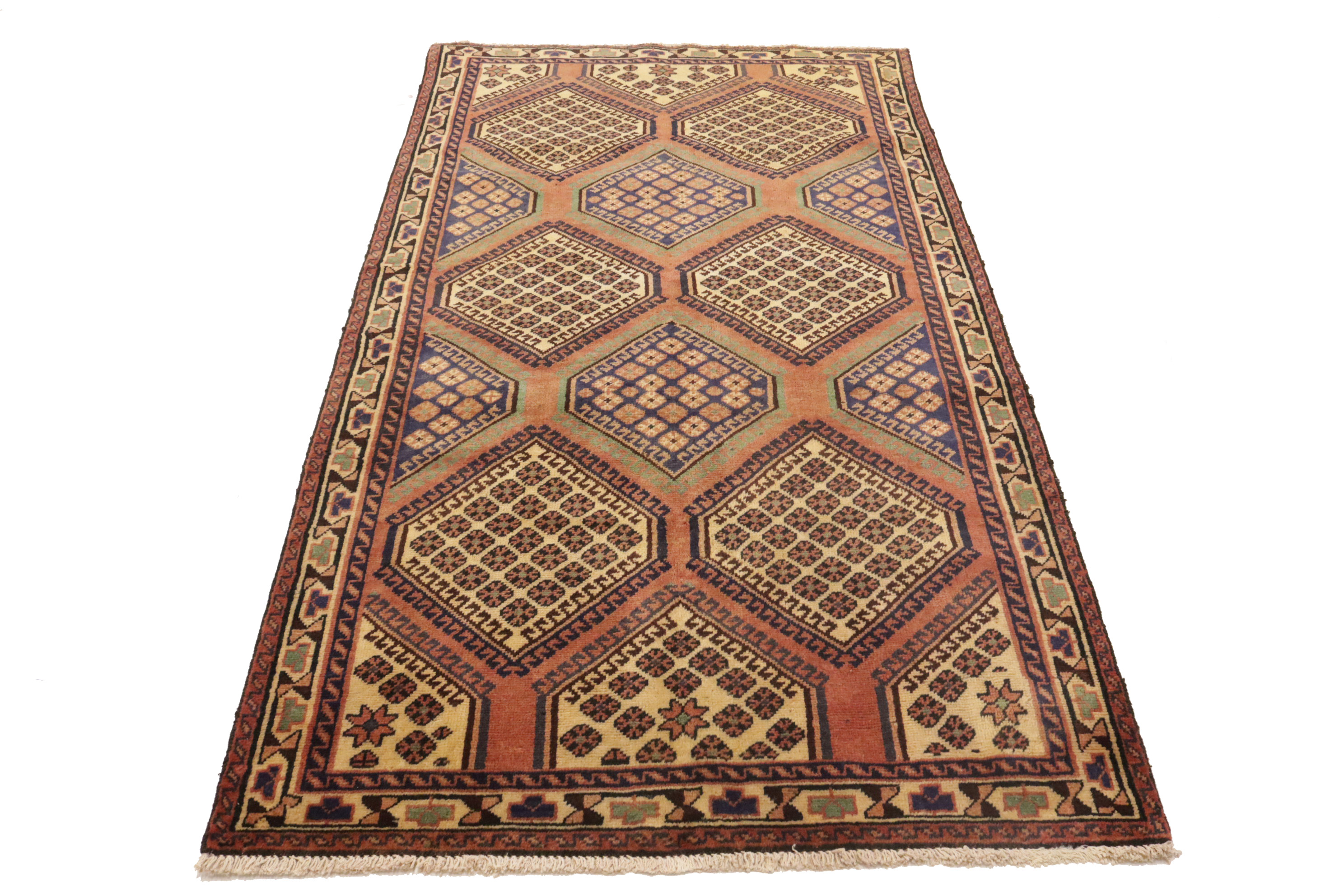 This genuine 4X7 red vintage Persian rug was made by the hands of talented weavers influenced by a variety of gorgeous symmetrical artistic designs, to recreate the aged look of the unique piece with a richness of color and very balanced background field. What set this tribal Oriental area rug from the others are the material and dye used (wool pile and cotton foundation), knot count, antique designs, fantastic grades, and its regional historical connection: it has deep roots, from the story of the people who produced it to the meaning of the symbols and colors displayed across its canvas that have been praised for centuries. This home décor carpet will be completely cozy and inviting that never will go out of style!