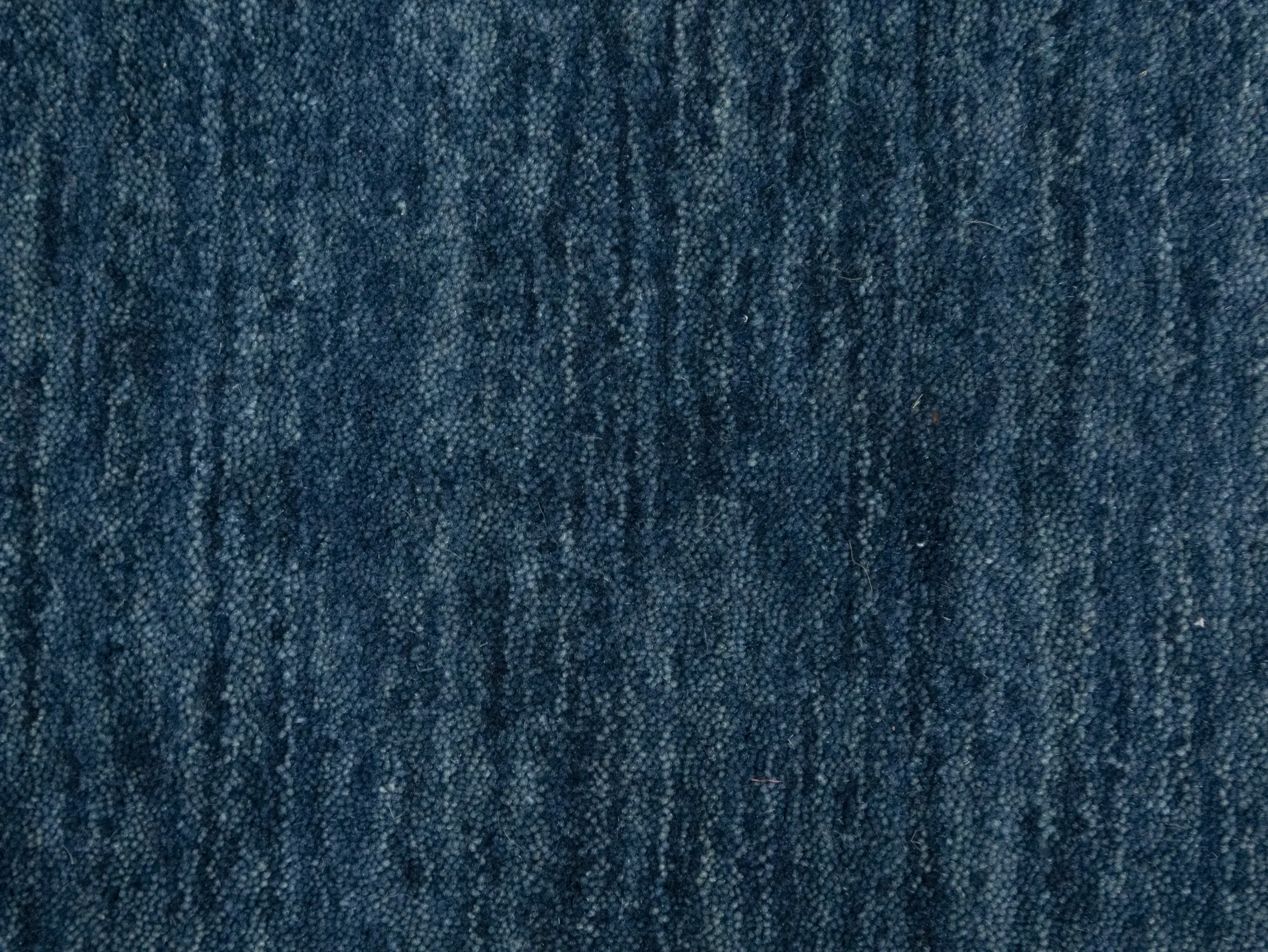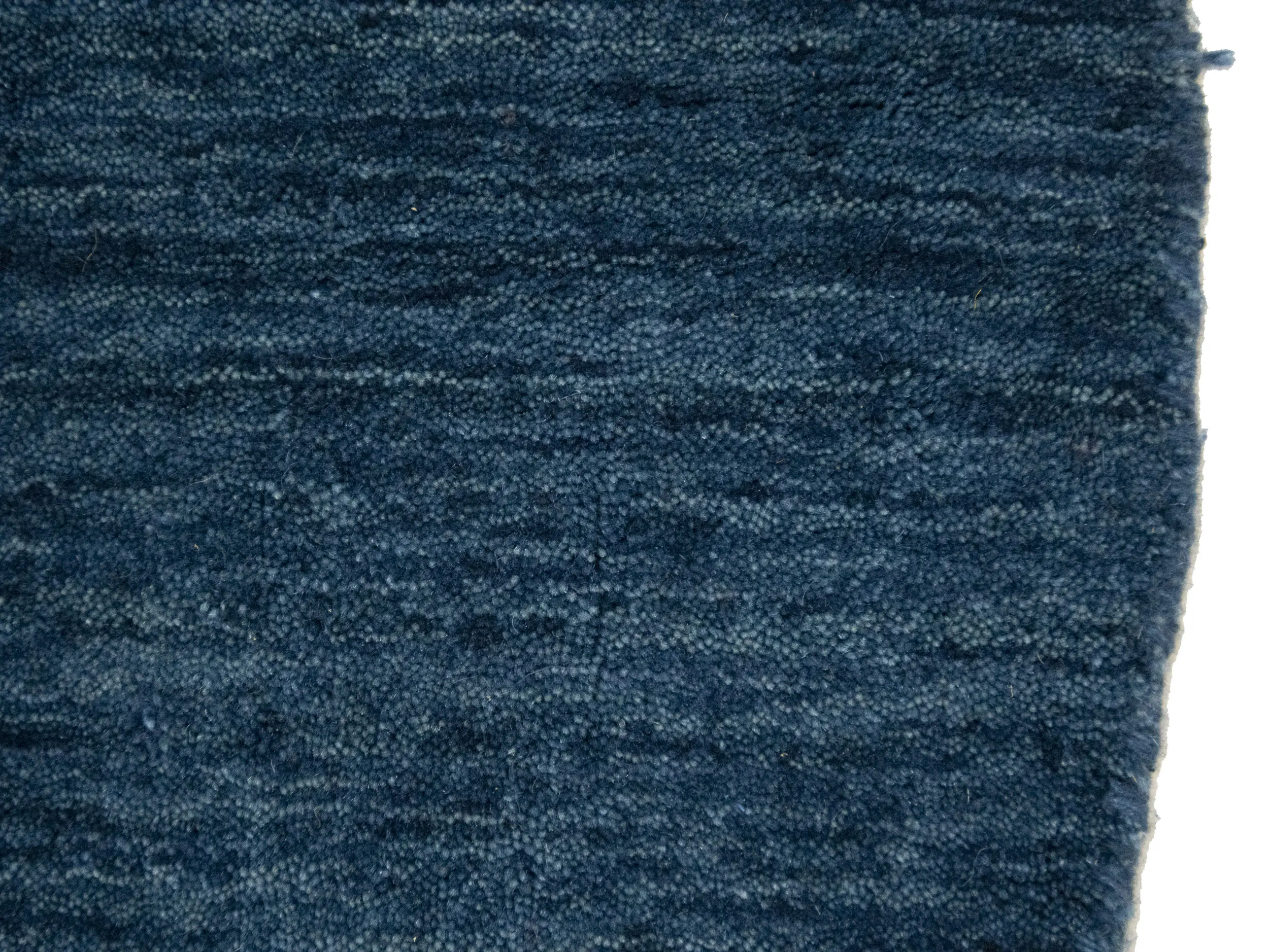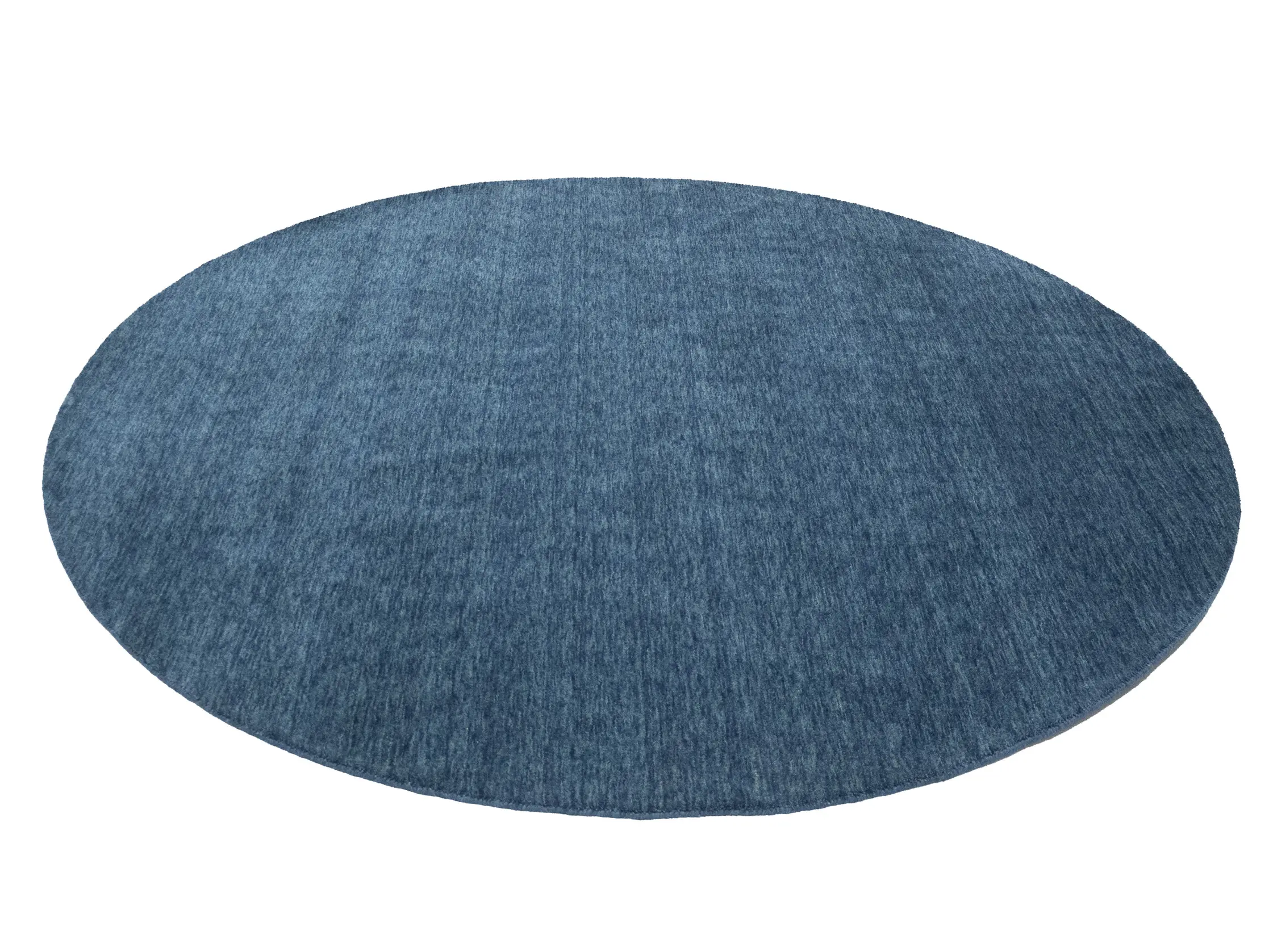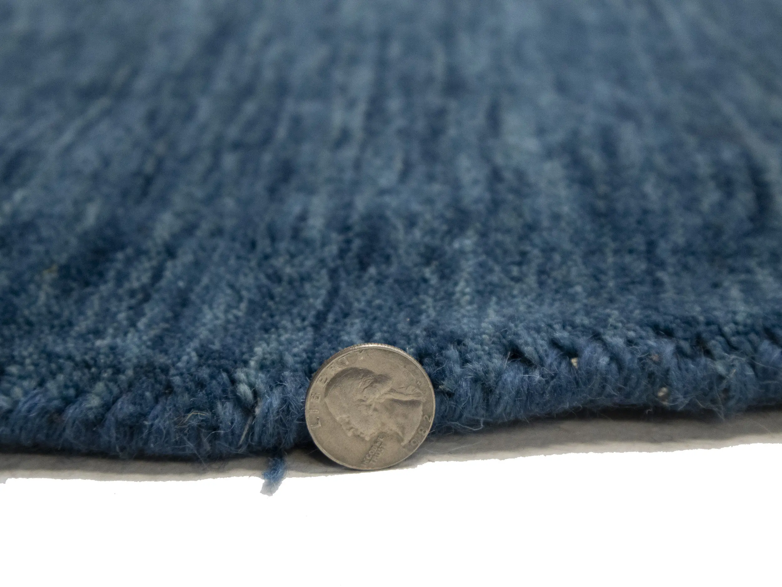 This hand-loomed 6X6 Steel Blue Oriental Round rug from India features a modern, Solid design that seamlessly integrates traditional craftsmanship with contemporary style, showcasing a striking Steel Blue primary color. It provides a luxuriant softness and durability underfoot, as it is constructed from premium wool with a cotton foundation. The rug is optimized for high-traffic areas due to its medium pile height and knot density of 100 knots per square inch, which ensures durability and comfort. This rug, which is in exceptional condition and was recently manufactured, is an ideal complement to any contemporary setting, providing both versatility and timeless elegance.