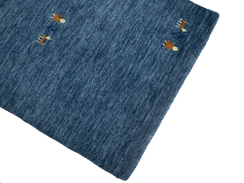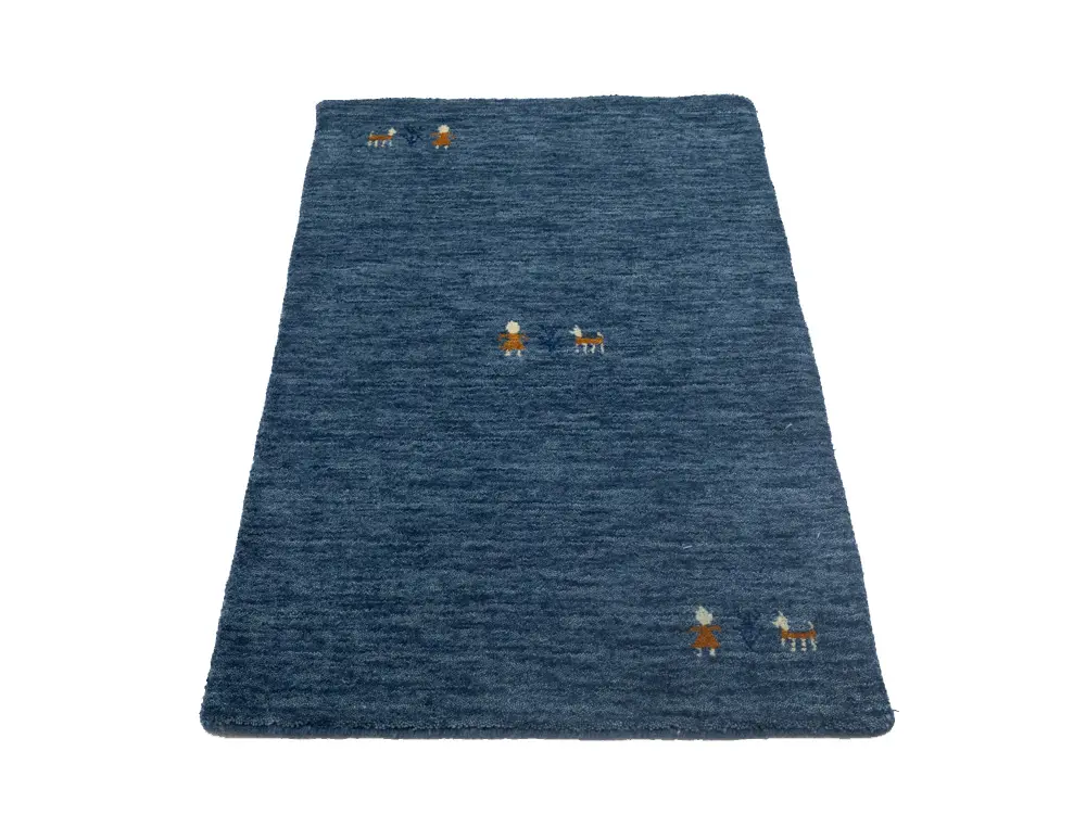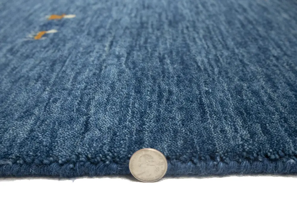 This hand-loomed Oriental rug from India features a modern, Pictorial design that seamlessly integrates traditional craftsmanship with contemporary style, showcasing a striking blue primary color. It provides a luxuriant softness and durability underfoot, as it is constructed from premium wool with a cotton foundation. The rug is optimized for high-traffic areas due to its medium pile height and knot density of 100 knots per square inch, which ensures durability and comfort. This rug, which is in exceptional condition and was recently manufactured, is an ideal complement to any contemporary setting, providing both versatility and timeless elegance.