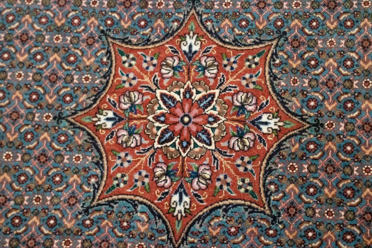 Handmade 4X4 teal blue Persian rug made with vegetable dyes (fine wool pile and cotton foundation), superior knot count, and appealing ancient designs. This Oriental rug never will go out of style and would be among your most valuable treasures.