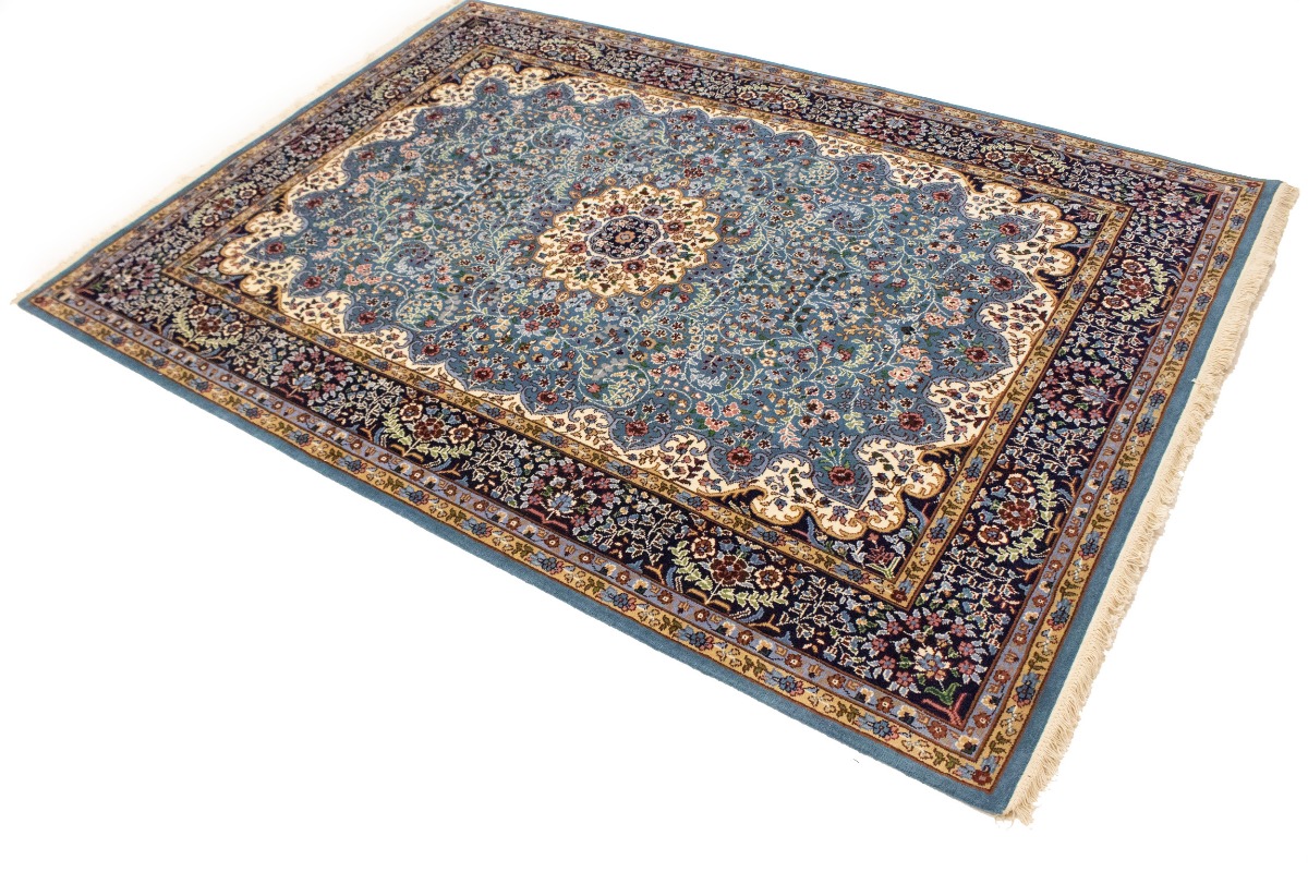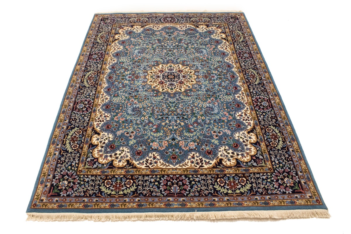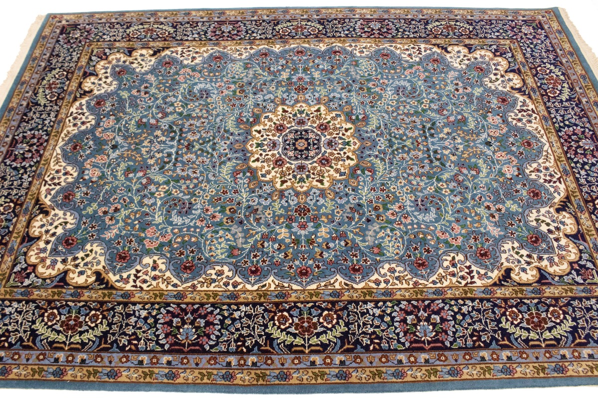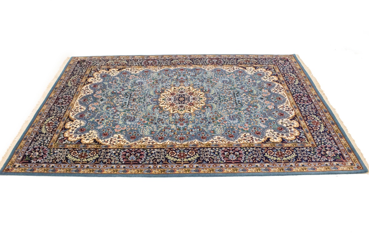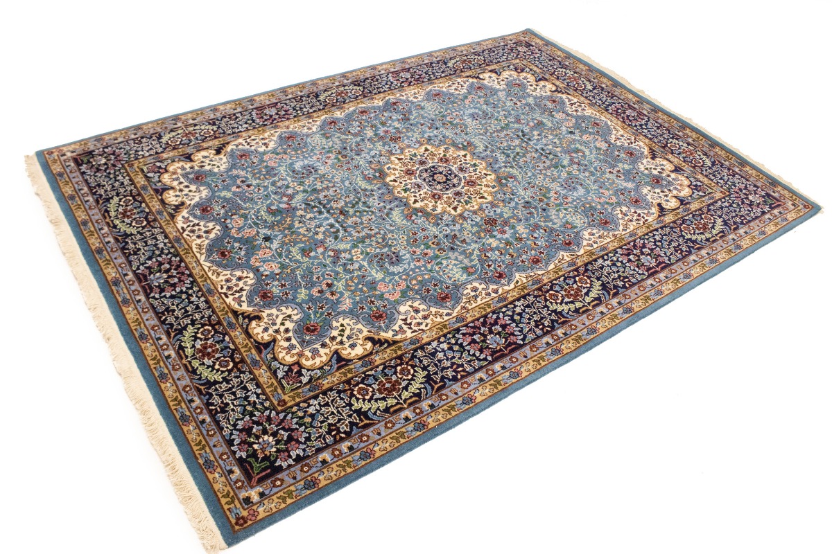 Handmade 6X8 blue Oriental rug made with natural dyes (fine wool pile and cotton foundation), superior knot count, and appealing ancient designs. This Oriental rug never will go out of style and would be among your most valuable treasures.