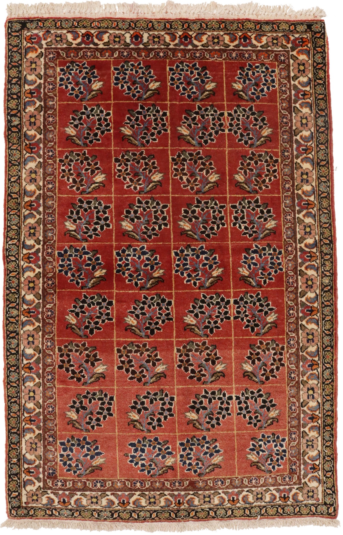 Hand Knotted vintage 3X5 red Persian rug made with natural dyes (fine wool pile and cotton foundation), superior knot count, and alluring ancient designs. This Oriental rug never will go out of style and would be among your most valuable treasures.
