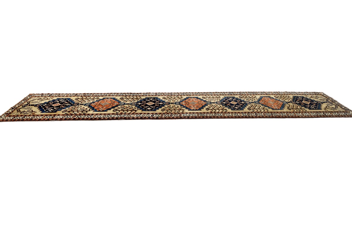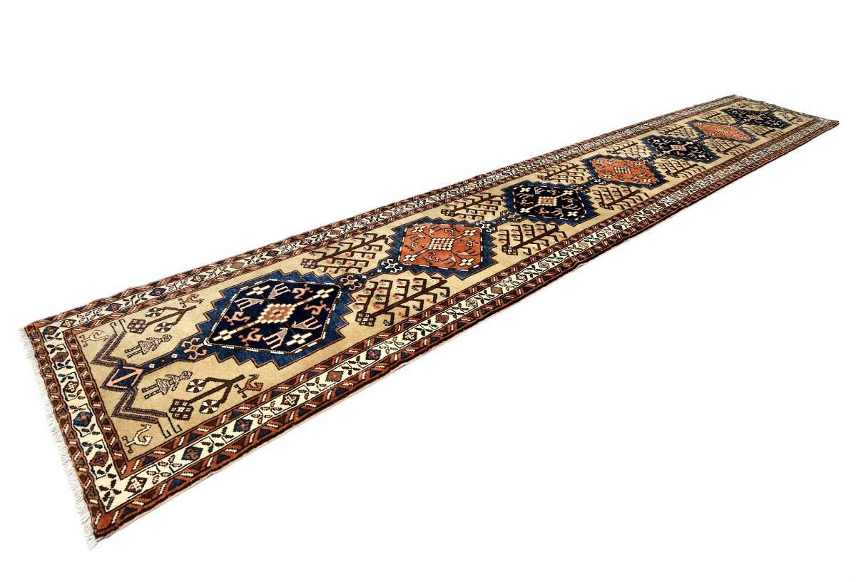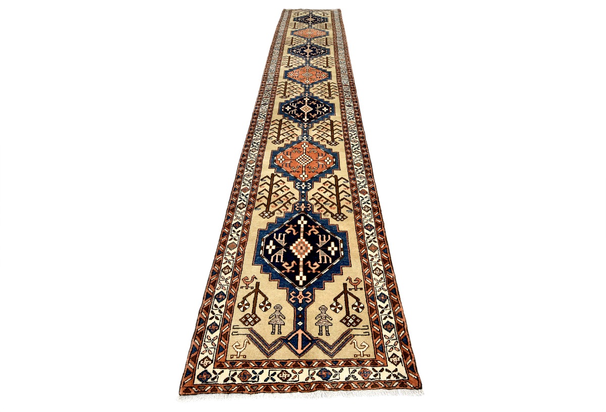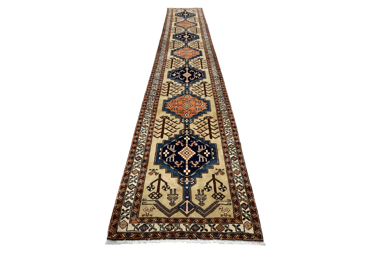 Handmade vintage Persian 3X18 beige runner made with vegetable dyes (fine wool pile and cotton foundation), superior knot count, and alluring ancient designs. This Oriental runner never will go out of style and would be among your most valuable treasures.