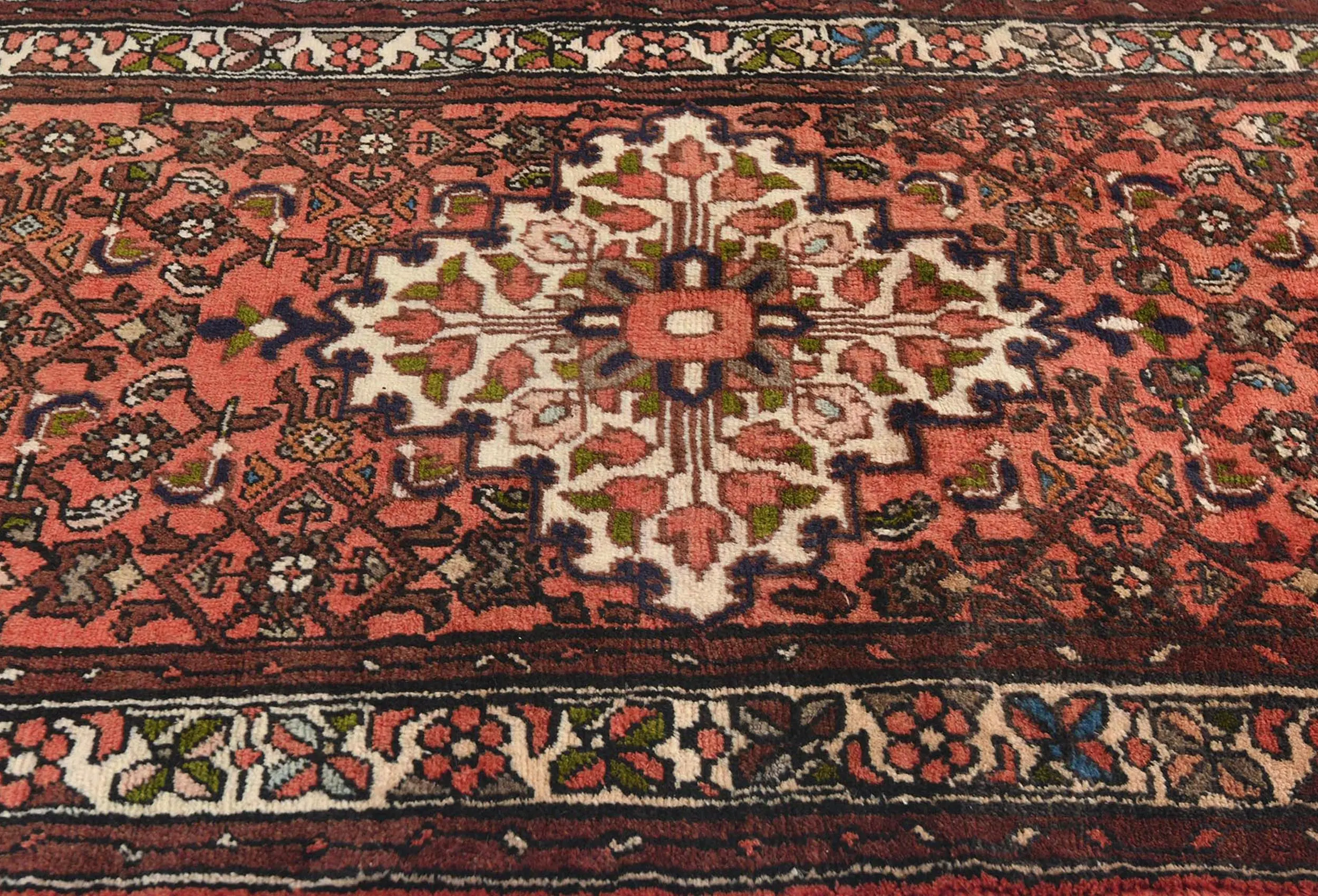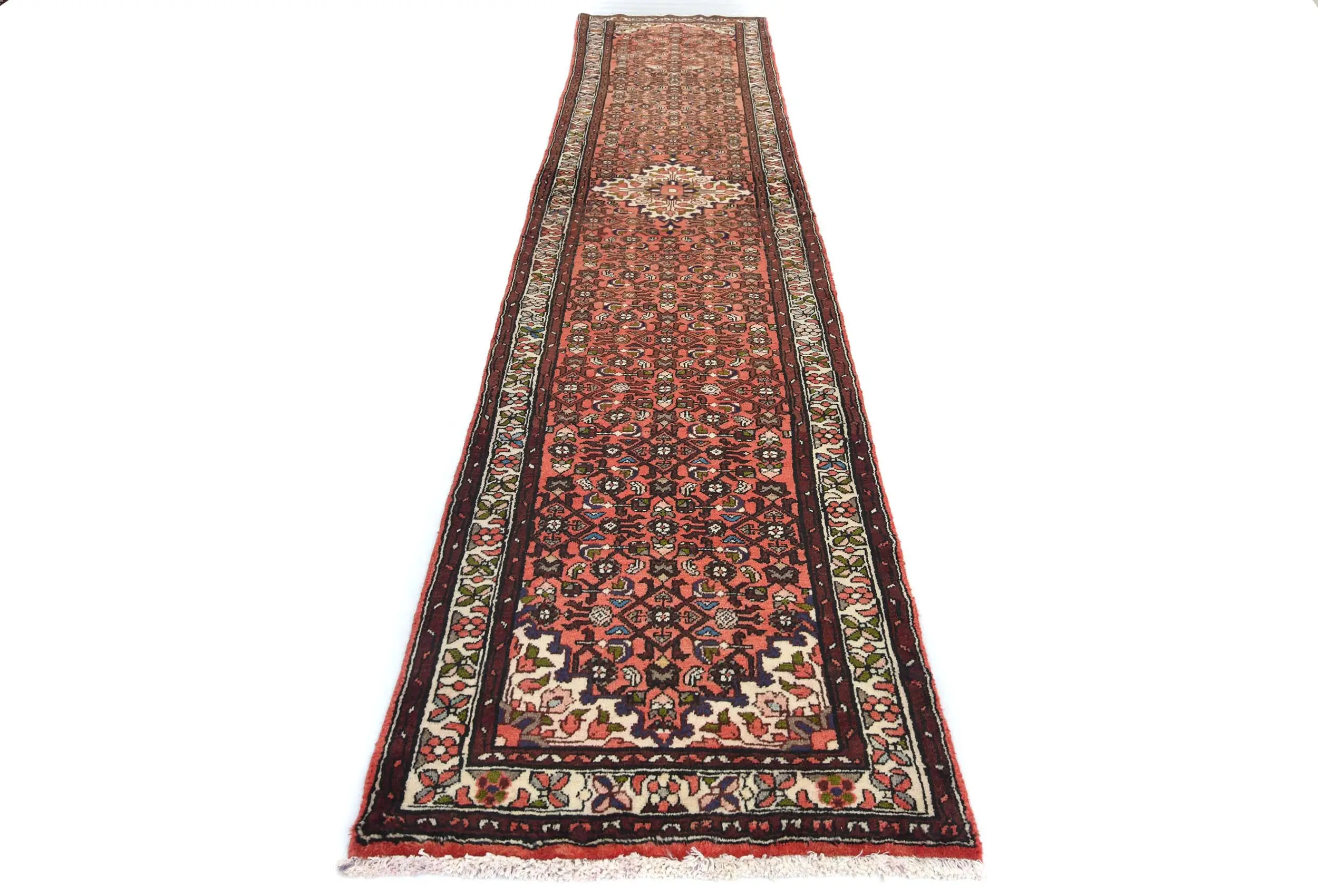 Handmade vintage 2'6X12'5 Bittersweet red Persian runner made with vegetable dyes (fine wool pile and cotton foundation), exceptional knot count, and appealing ancient designs. This Oriental runner never will go out of style and would be among your most valuable treasures.
