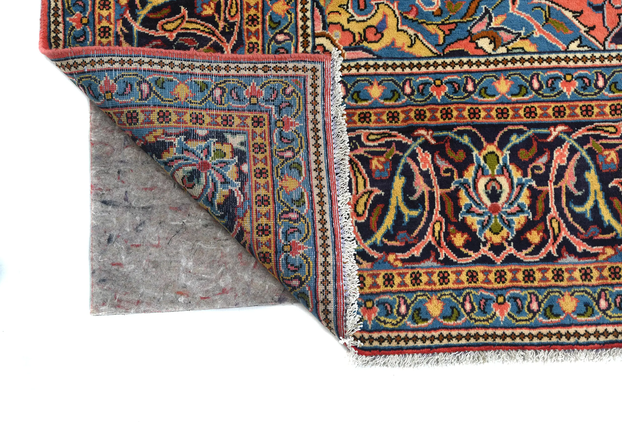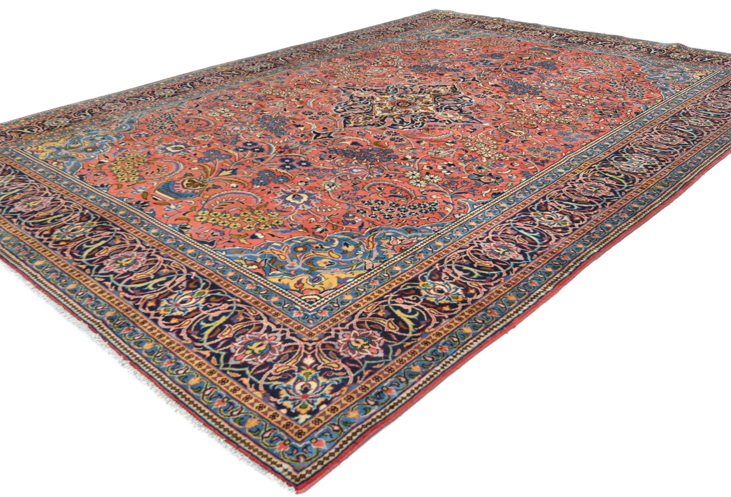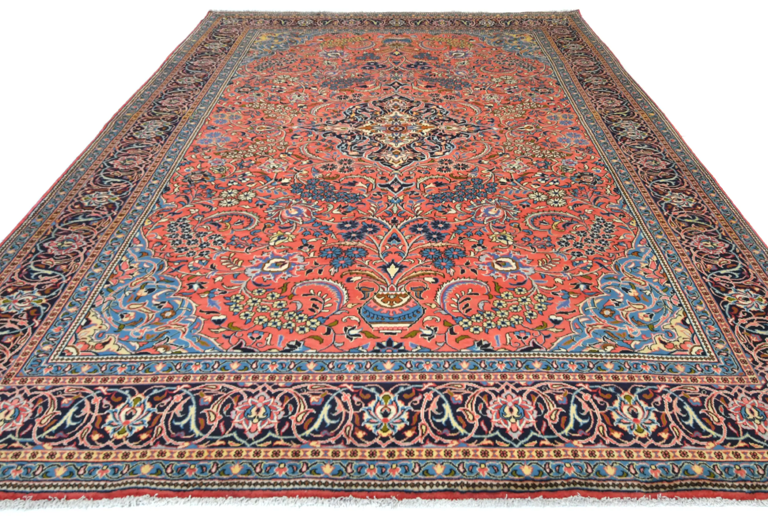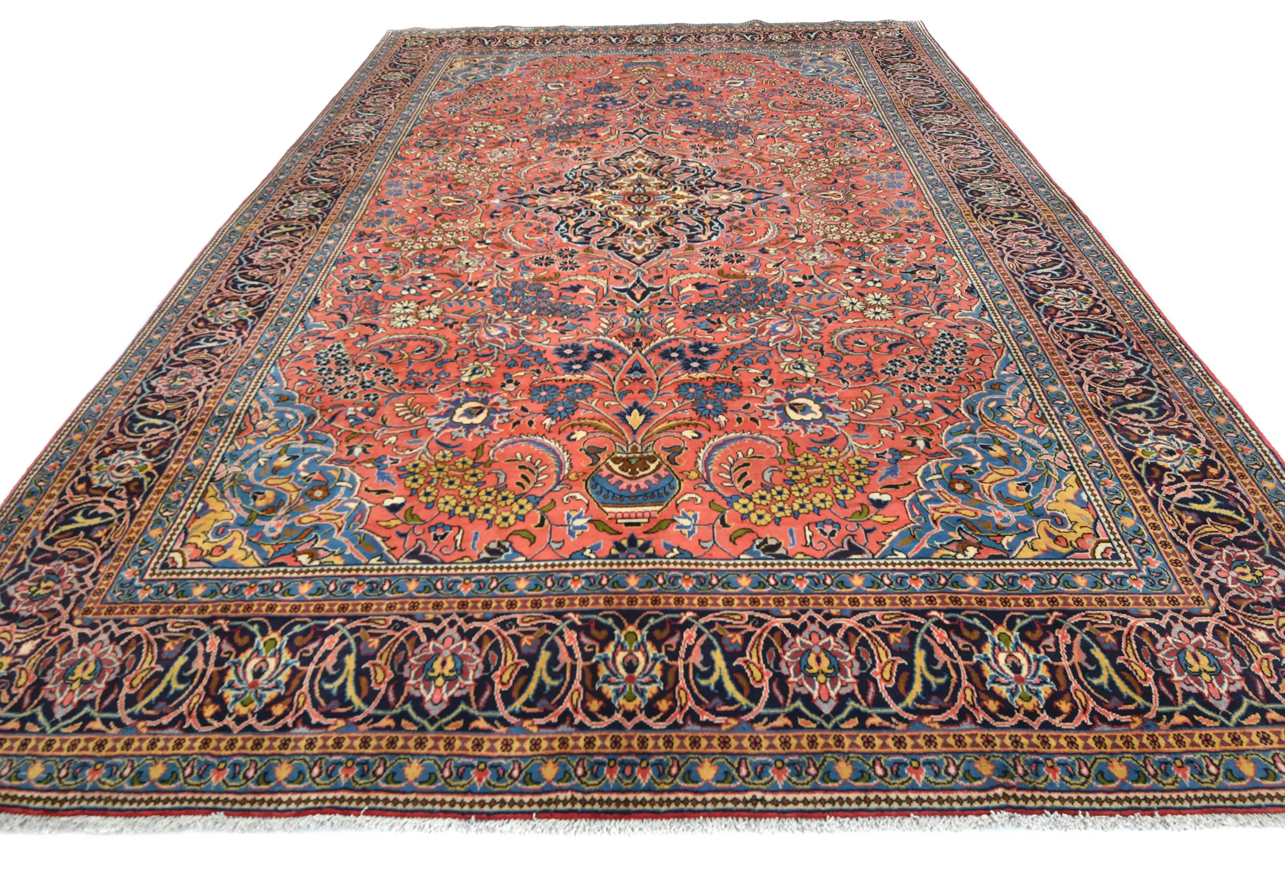 This authentic 9X13 coral pink vintage Persian rug was finely knotted by the hands of weavers influenced by a variety of amazing artistic designs, to recreate the aged look of the exceptional piece with a richness of color and embellished floral background field. What set this traditional Oriental area rug from the others are the material and dye used (wool pile and cotton foundation), knot count, antique designs, fantastic grades, and its regional historical connection: it has deep roots, from the story of the people who produced it to the meaning of the symbols and colors displayed across its canvas that have been praised for centuries. This classic home décor carpet will be completely cozy and inviting that never will go out of style! Also, this Oriental rug would be among your most valuable treasures, it is a great investment that increase in value over time, and it will last a lifetime because was woven with high-quality, all-natural wool; it won’t rip, tear, or shed. Eco-friendly, opulent yet affordable; this Persian rug will give you an extra pop of character to help define your home environment with luxury and warmth that will capture the eyes and attention of your audience (homeowners, designers, decorators, family and friends). RT-7544