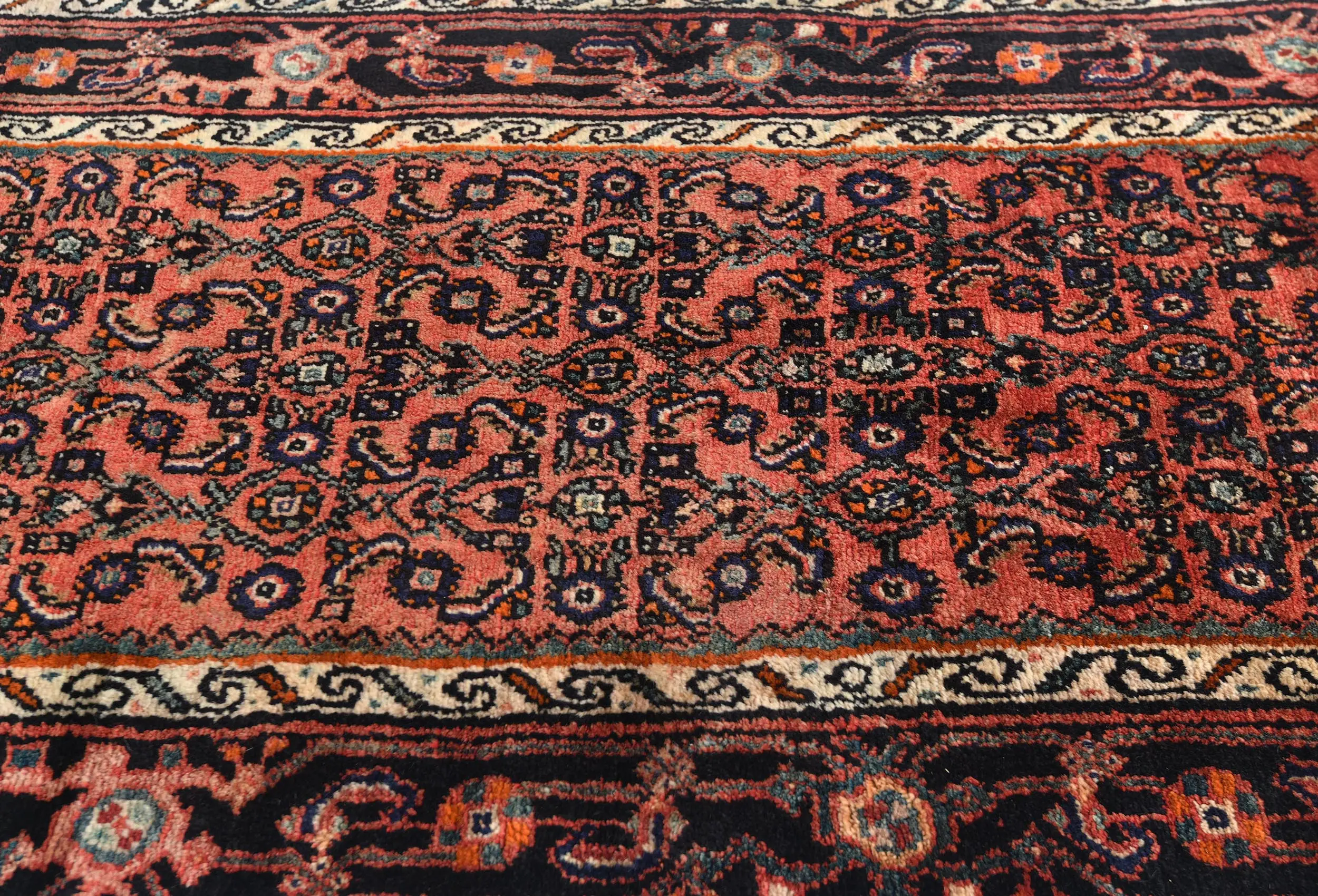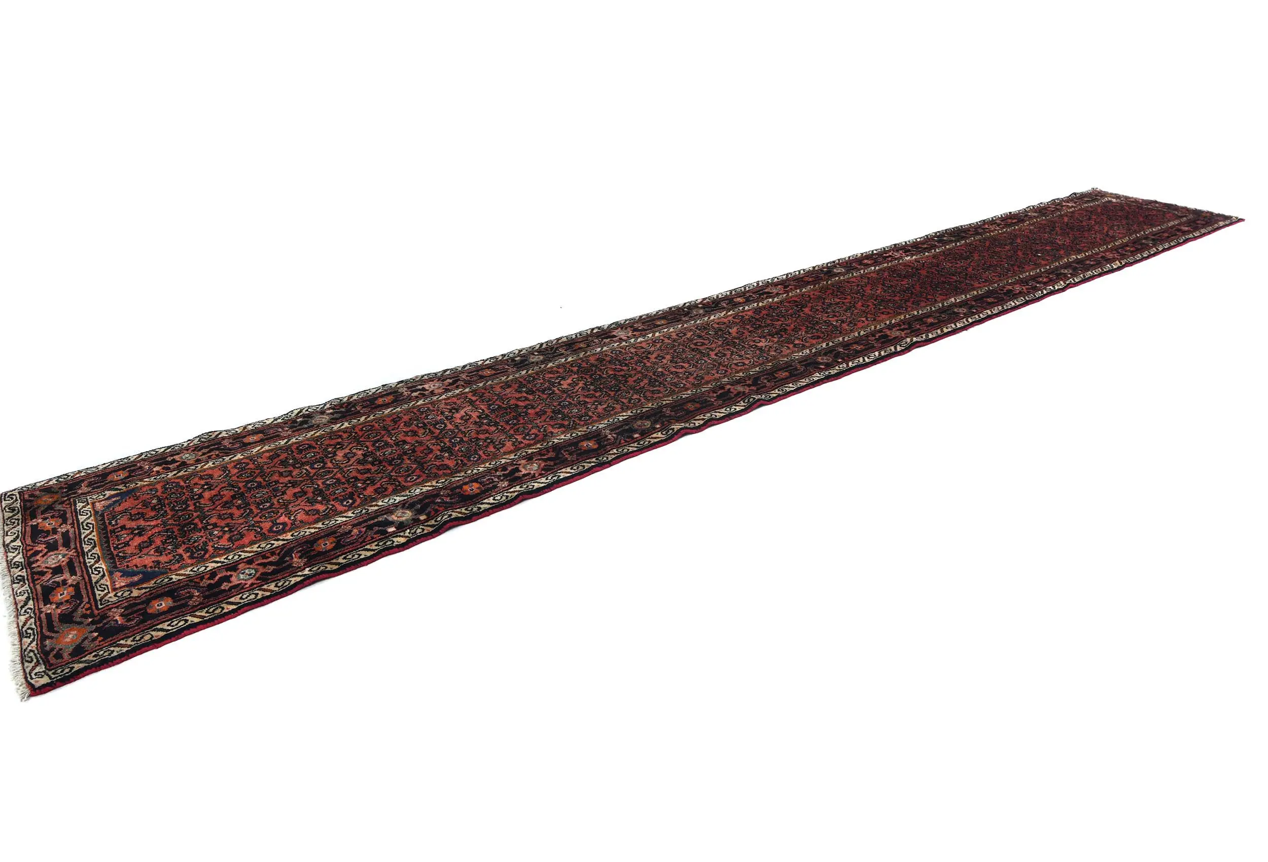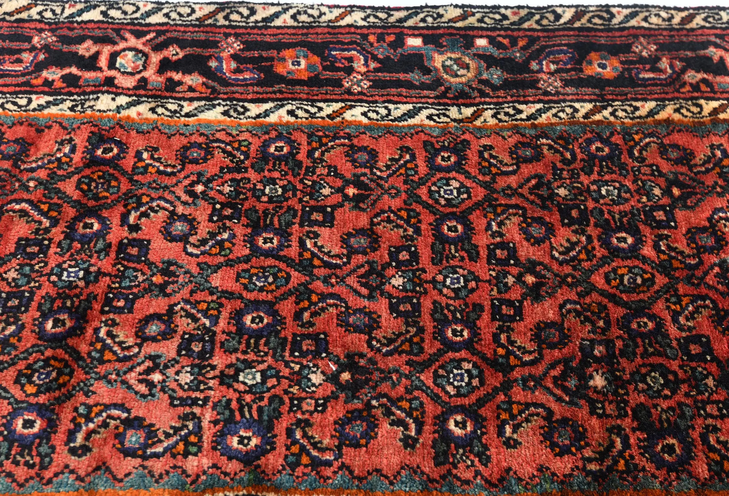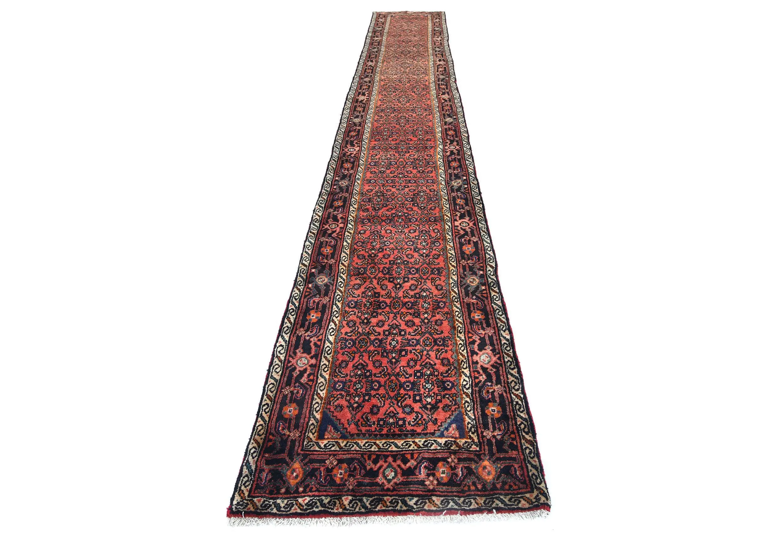 Handmade vintage 3X16 coral red Persian runner made with vegetable dyes (fine wool pile and cotton foundation), exceptional knot count, and appealing ancient designs. This Oriental runner never will go out of style and would be among your most valuable treasures.