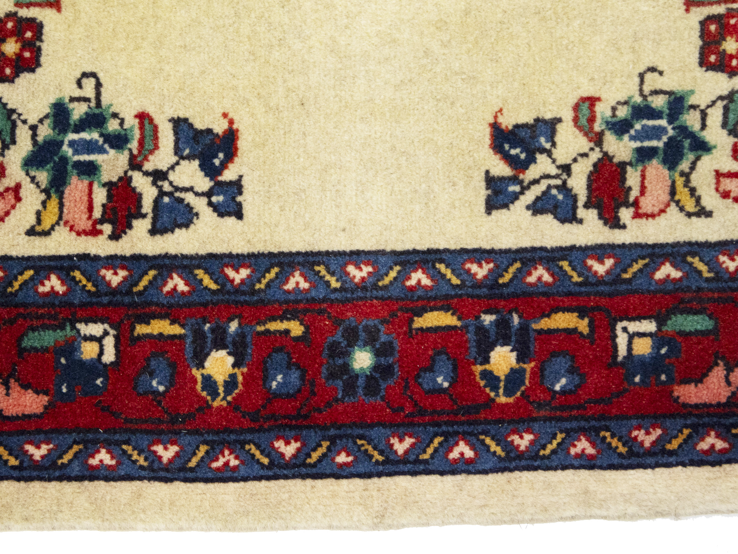 Handmade vintage 2'3X2'7 cream rug made with vegetable dyes (fine wool pile and cotton foundation), superior knot count, and alluring ancient designs. This Oriental rug never will go out of style and would be among your most valuable treasures.