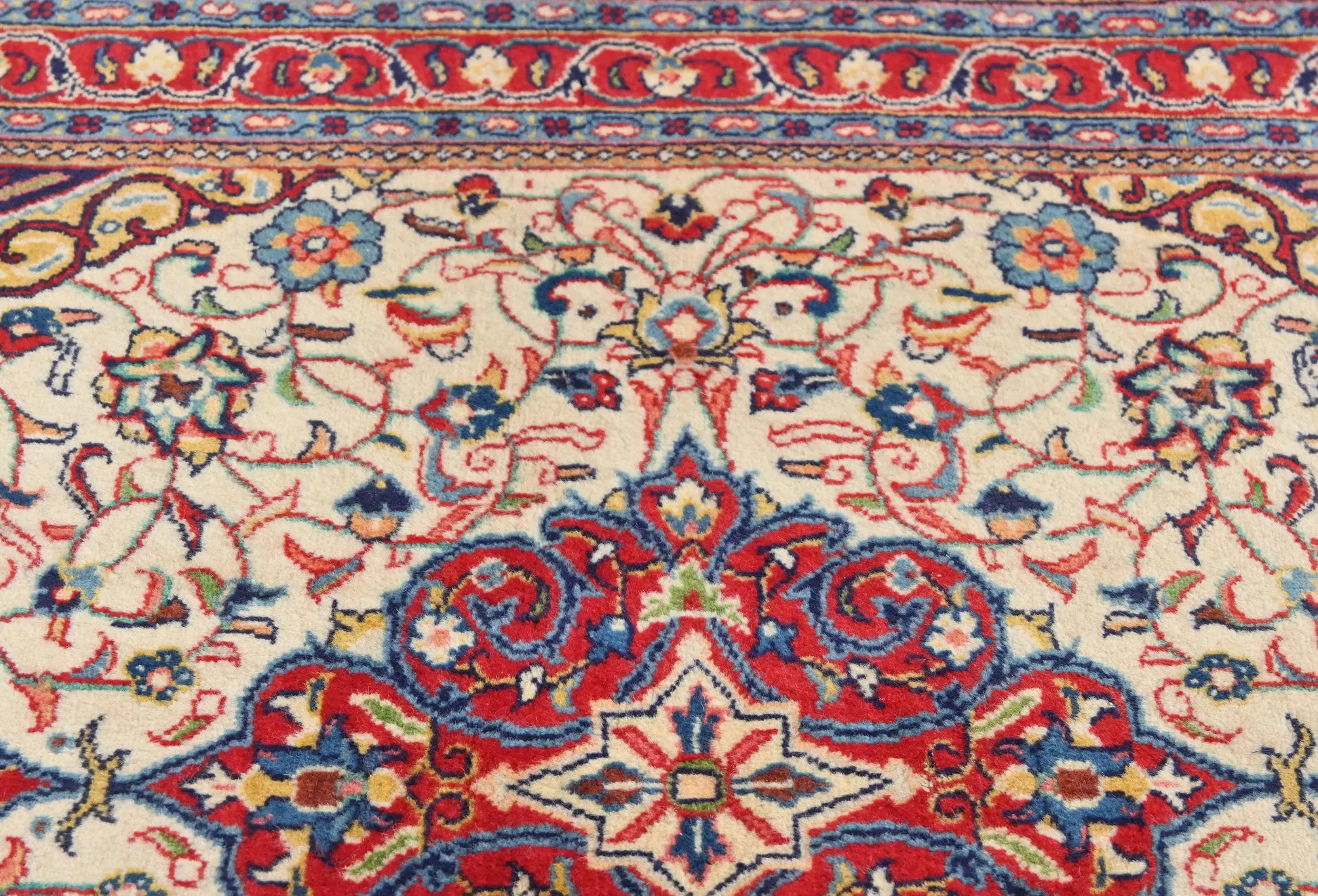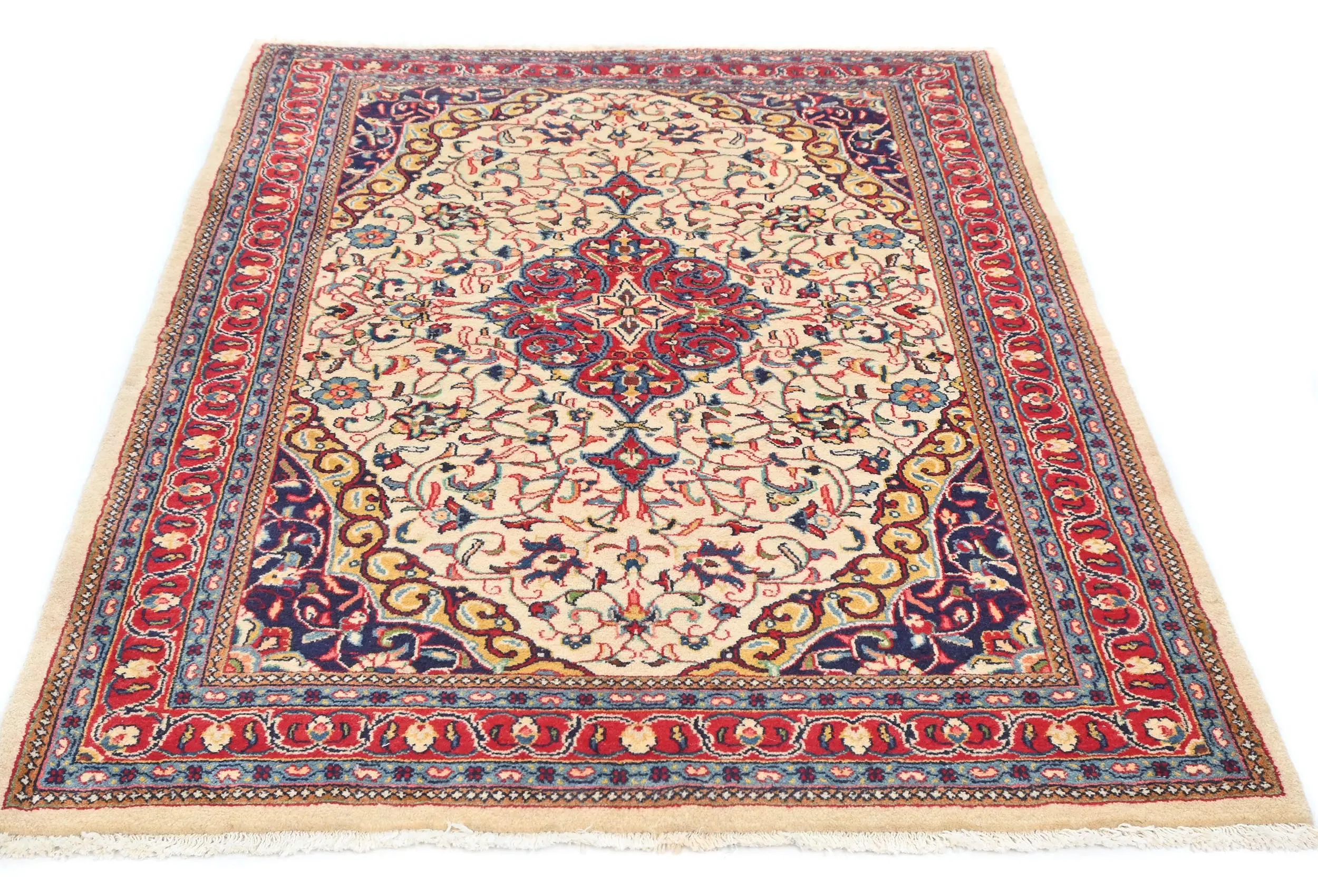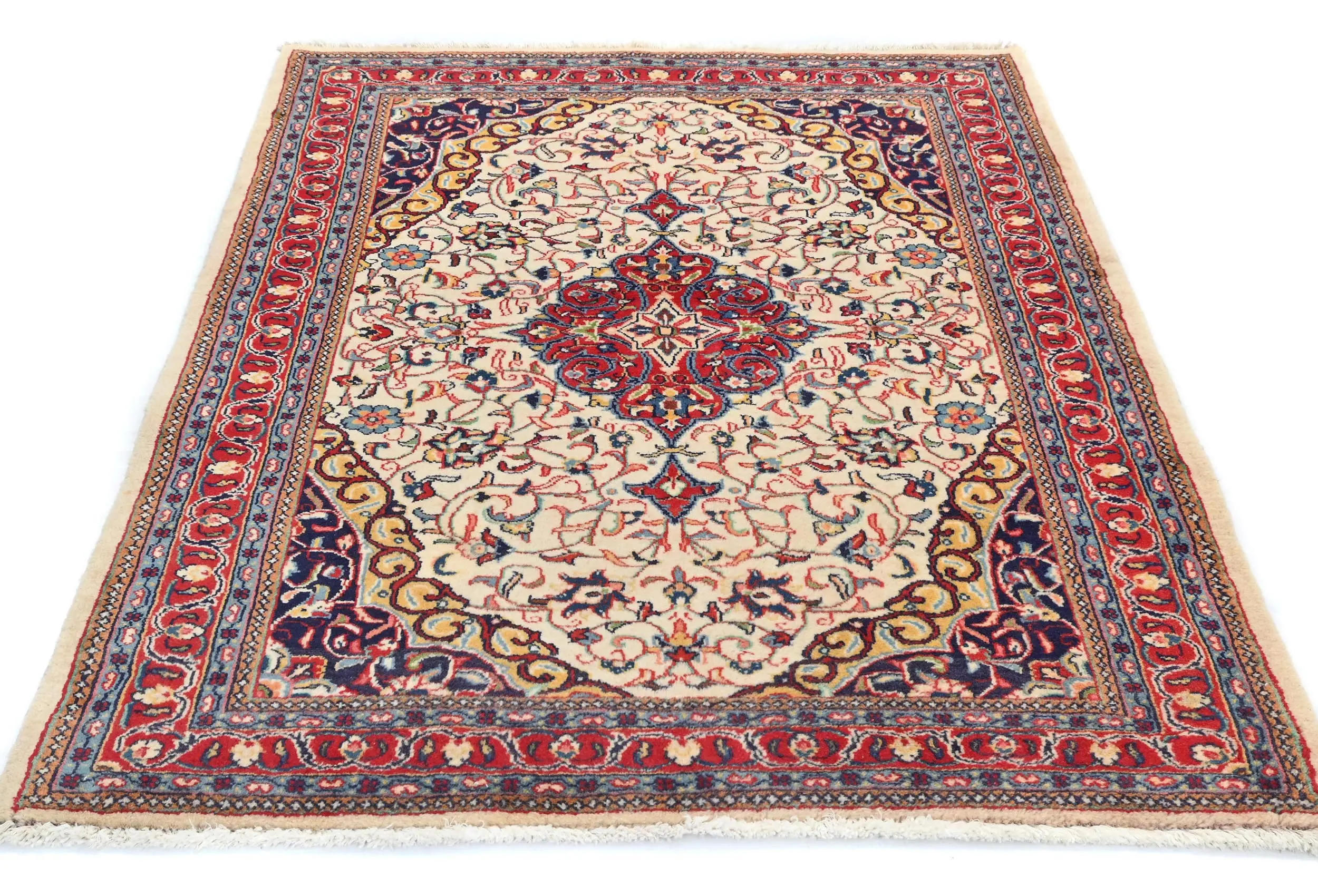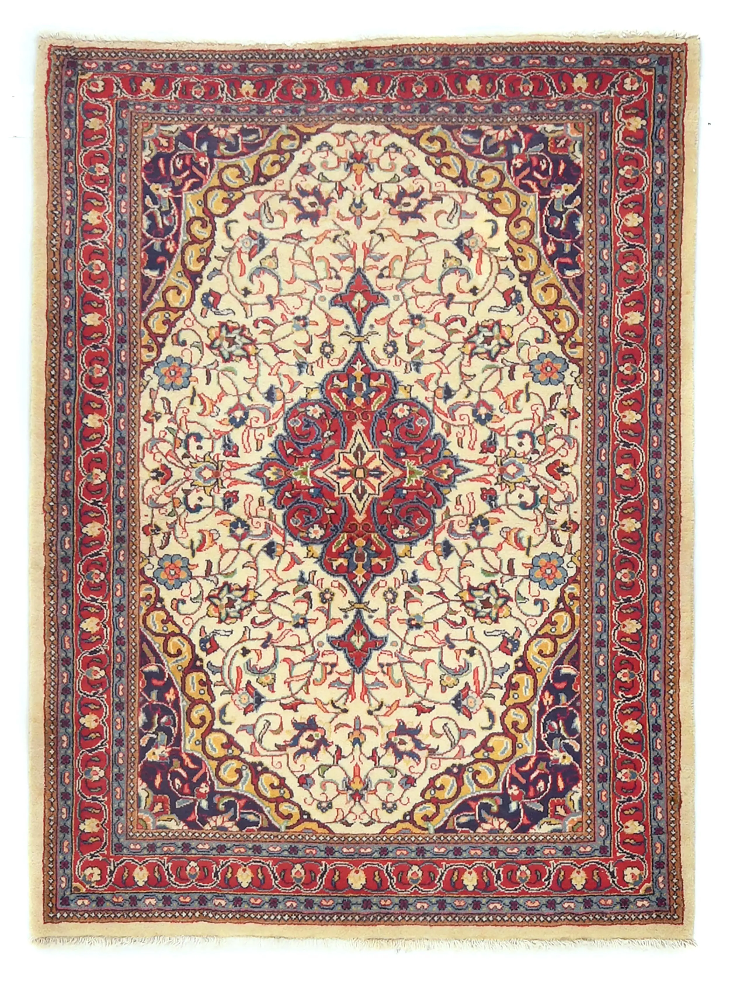 Handmade vintage 3'6X4'7 cream Persian rug made with vegetable dyes (fine wool pile and cotton foundation), superior knot count, and alluring ancient designs. This Oriental rug never will go out of style and would be among your most valuable treasures.