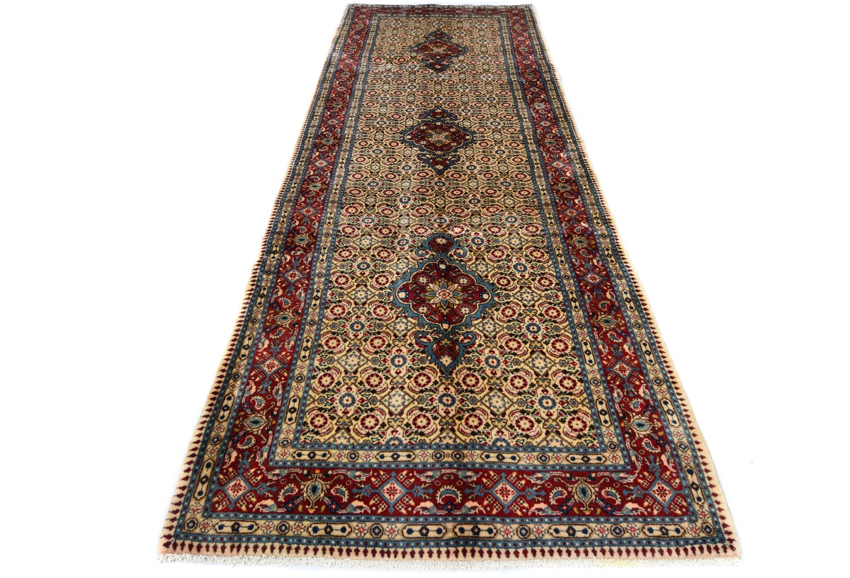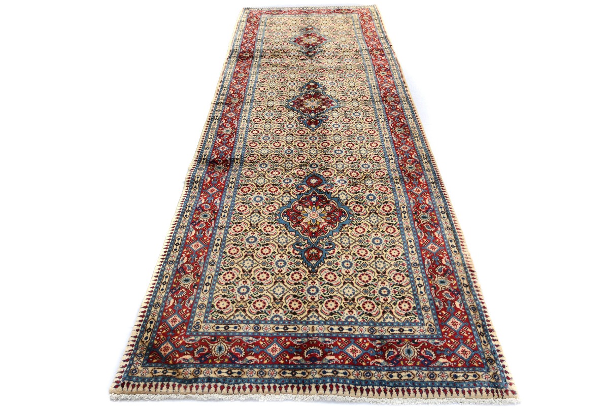 Handmade vintage 3'4X9'6 cream Persian runner made with vegetable dyes (fine wool pile and cotton foundation), superior knot count, and alluring ancient designs. This Oriental runner never will go out of style and would be among your most valuable treasures.