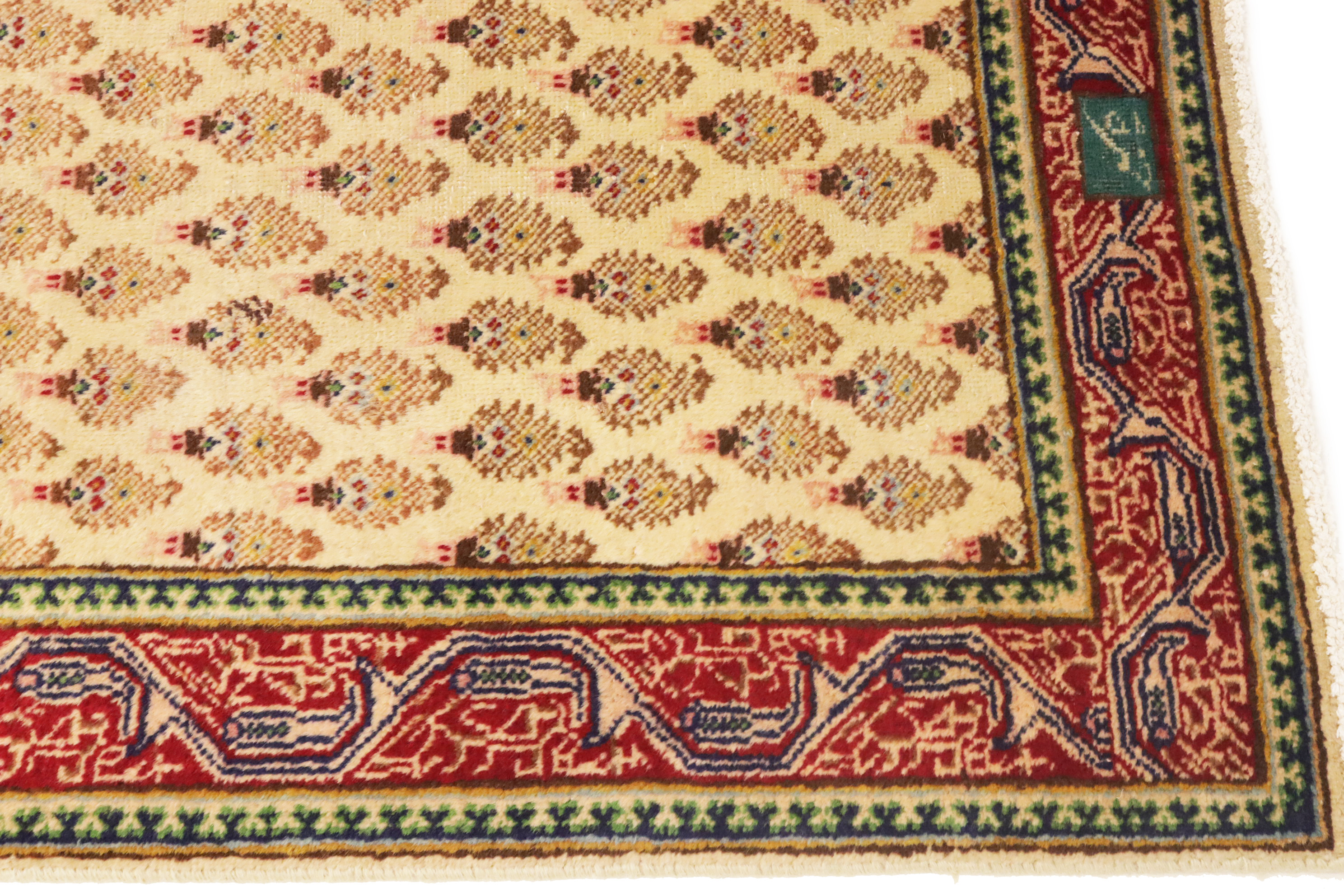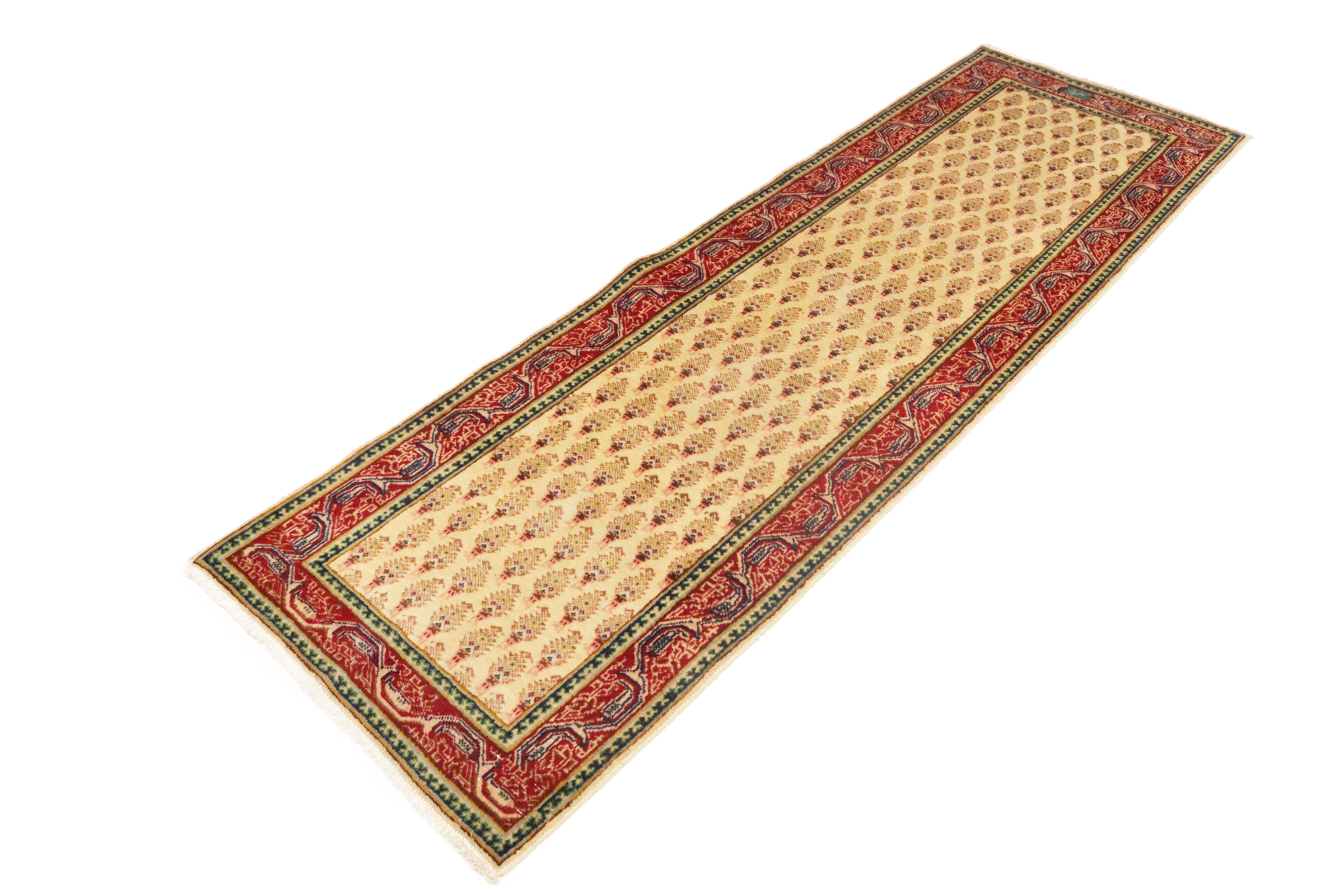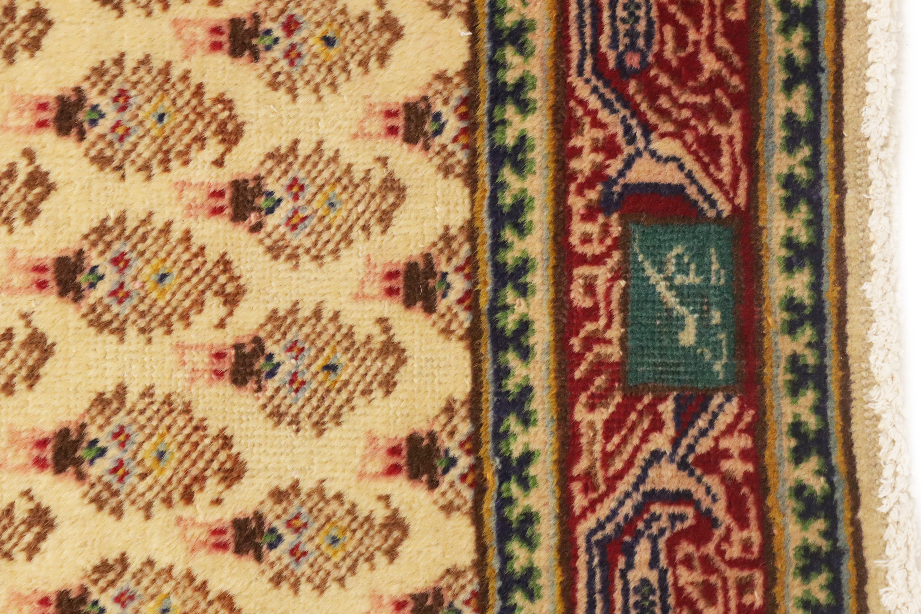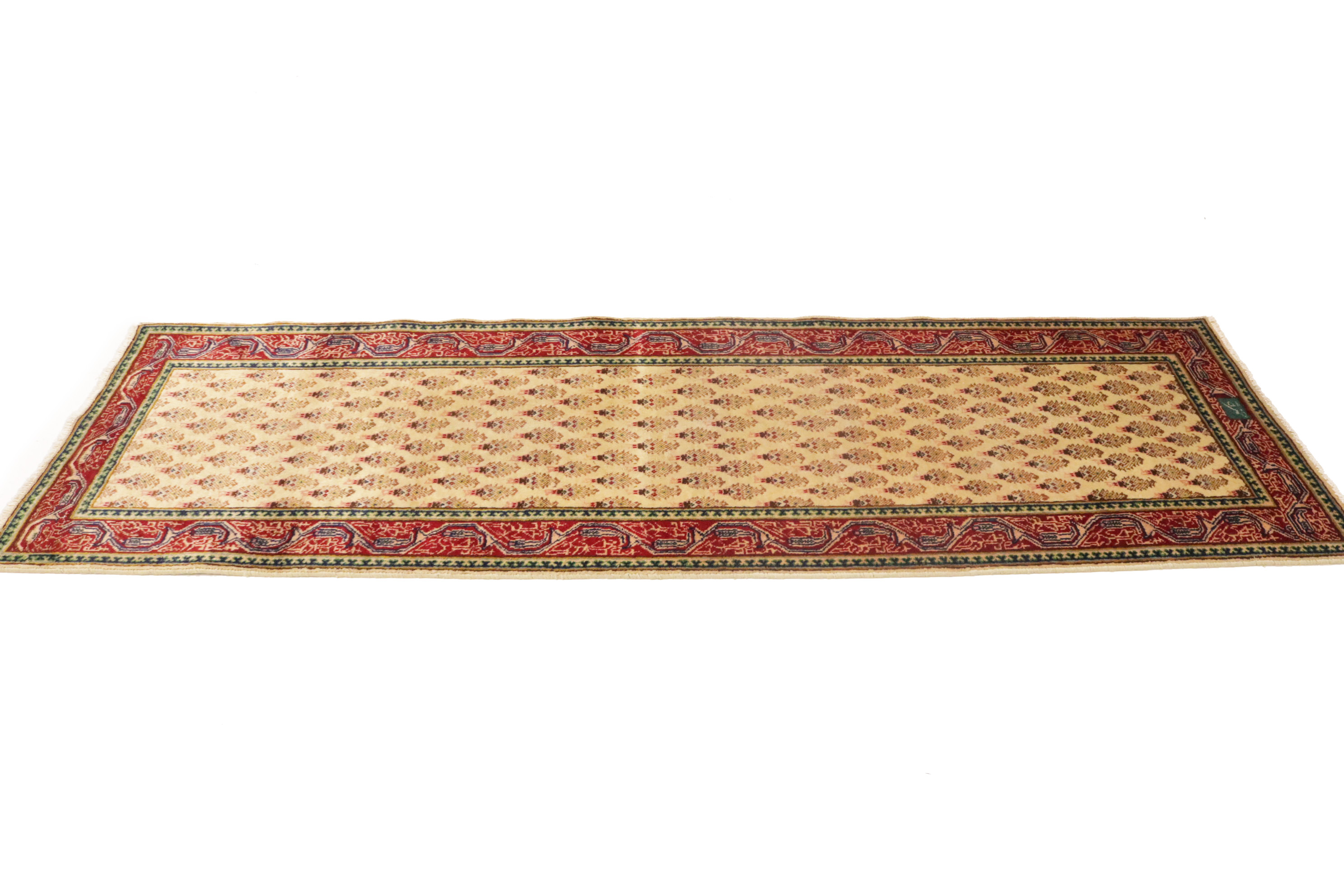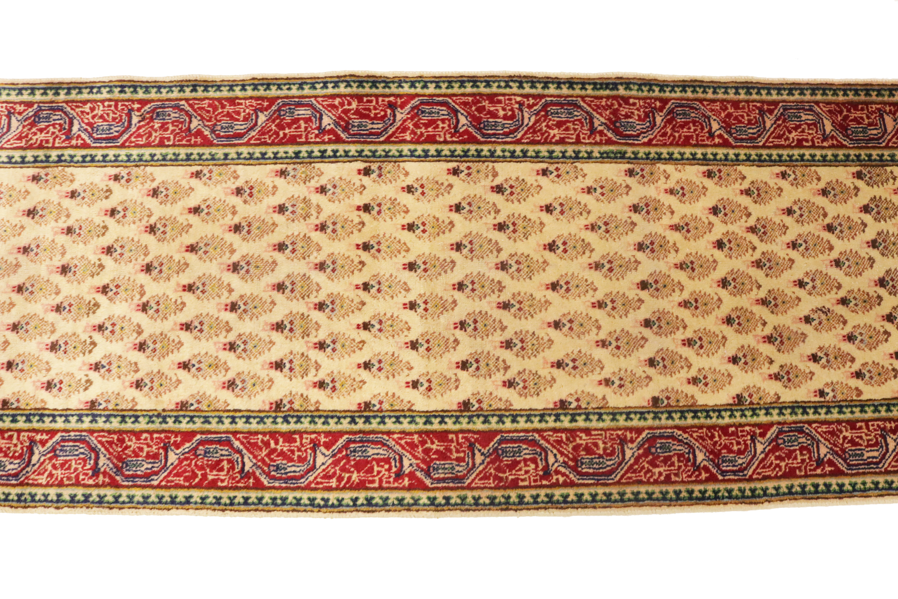 Handmade vintage 2'6X7'8 cream Persian runner made with natural dyes (fine wool pile and cotton foundation), superior knot count, and alluring ancient designs. This Oriental runner never will go out of style and would be among your most valuable treasures.