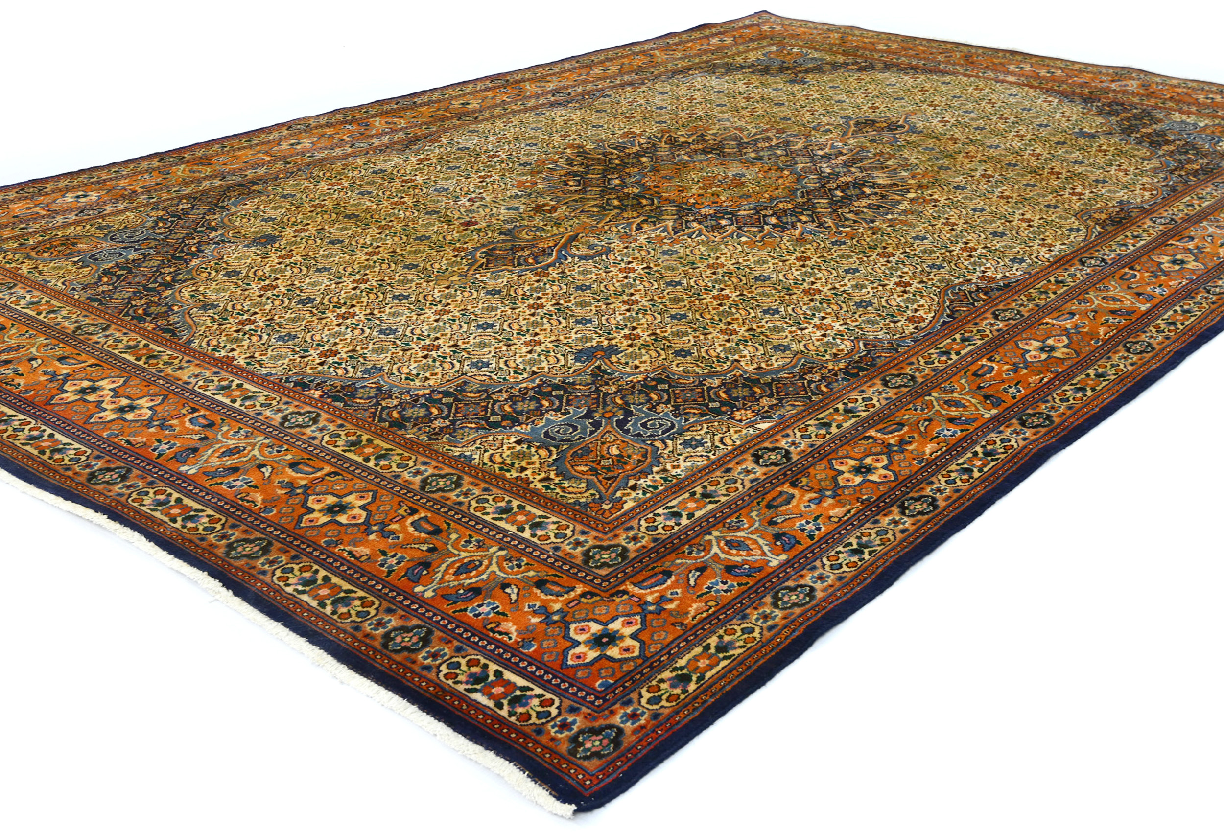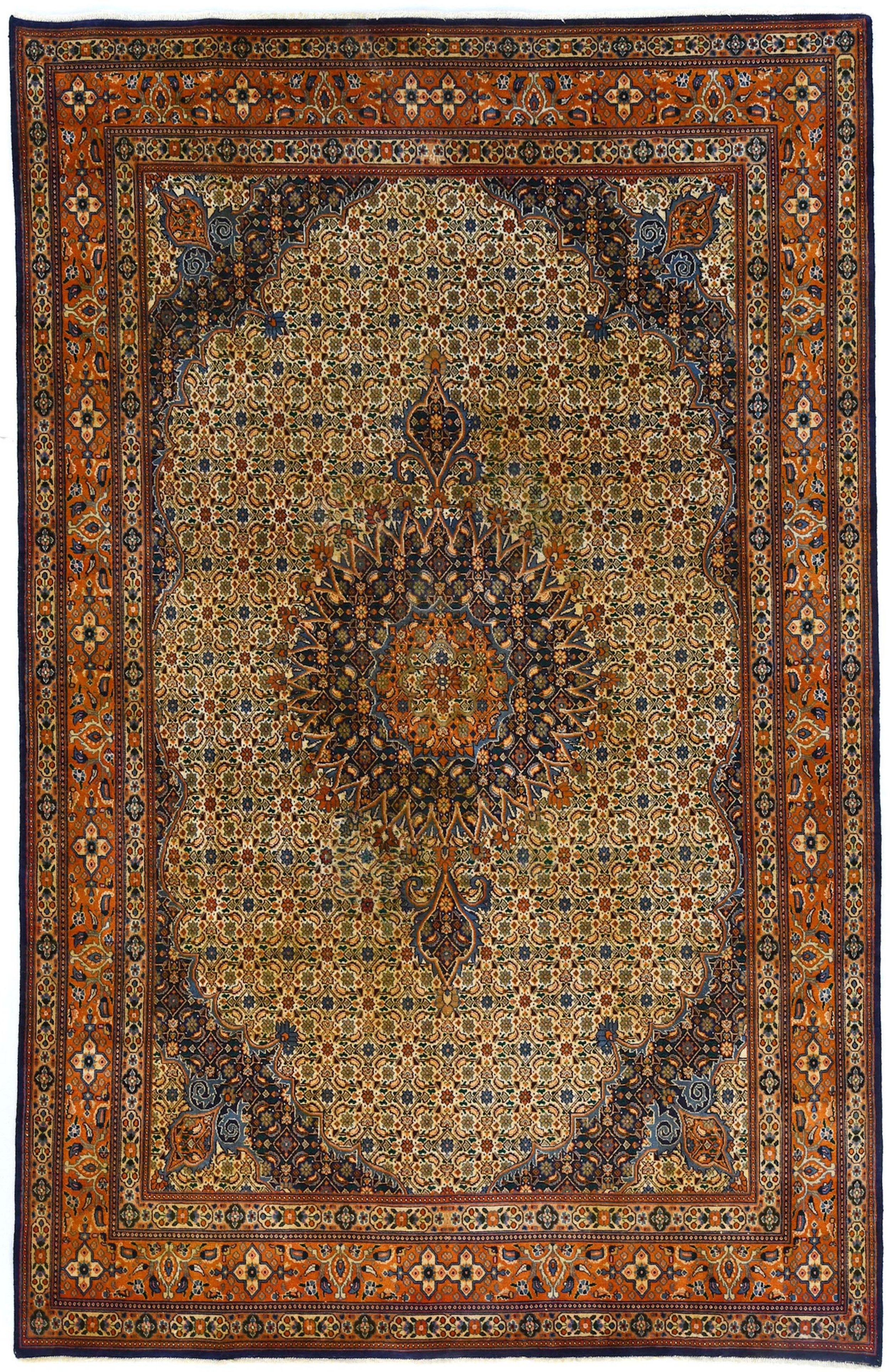 This genuine 6'5X10 cream vintage Persian rug was made by the hands of talented weavers influenced by a variety of gorgeous symmetrical artistic designs, to recreate the aged look of the unique piece with a richness of color and very balanced floral background field. What set this traditional Oriental area rug from the others are the material and dye used (wool pile and cotton foundation), knot count, antique designs, fantastic grades, and its regional historical connection: it has deep roots, from the story of the people who produced it to the meaning of the symbols and colors displayed across its canvas that have been praised for centuries. This classic home décor carpet will be completely cozy and inviting that never will go out of style! Also, this Oriental rug would be among your most valuable treasures, it is a great investment that accrues value over time, and it will last a lifetime because was woven with high-quality, all-natural wool; it won’t rip, tear, or shed. Eco-friendly, opulent yet affordable; this Persian rug will give you an extra pop of character to help define your home environment with sophistication and warmth that will capture the eyes and attention of your audience (homeowners, designers, decorators, family and friends). RT-6539