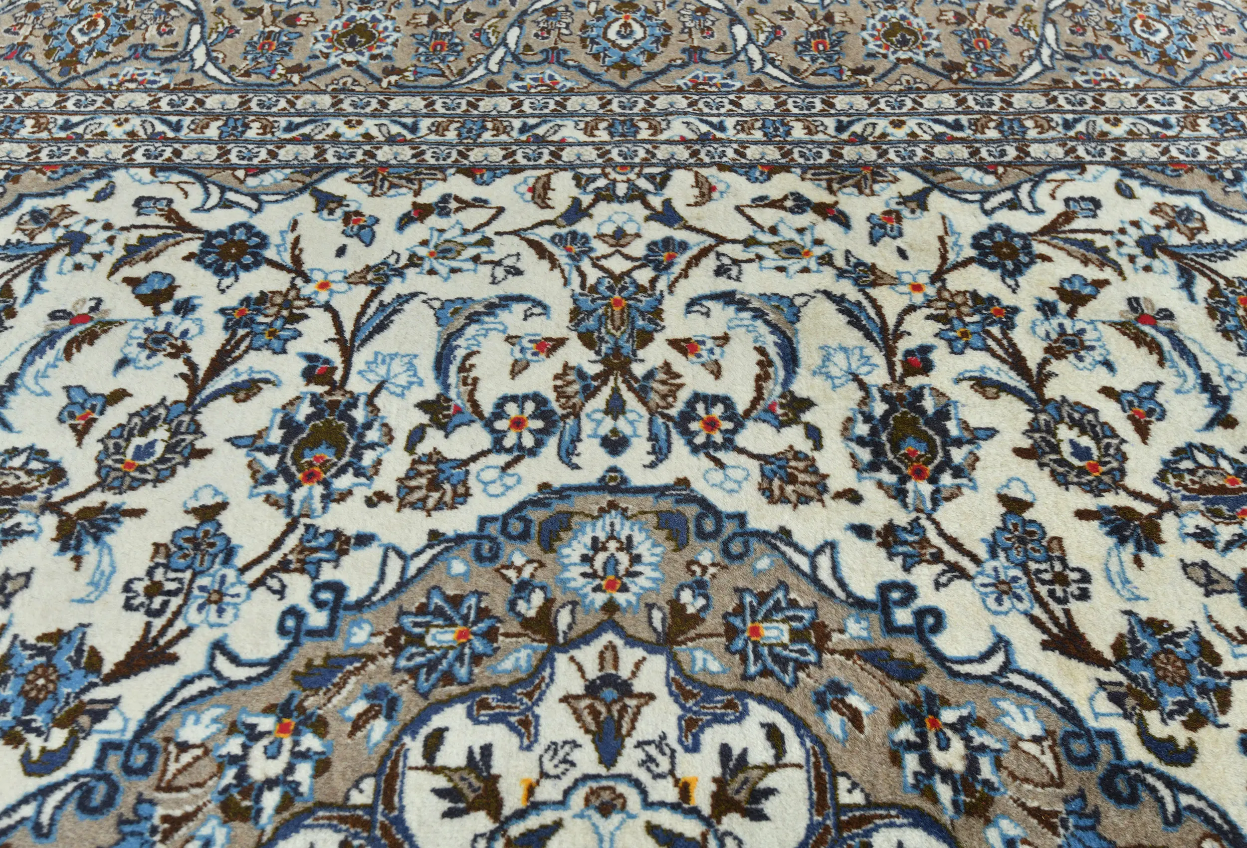 - Cream and tan base with accents of brown, purple-navy, blue, and red with abrash character