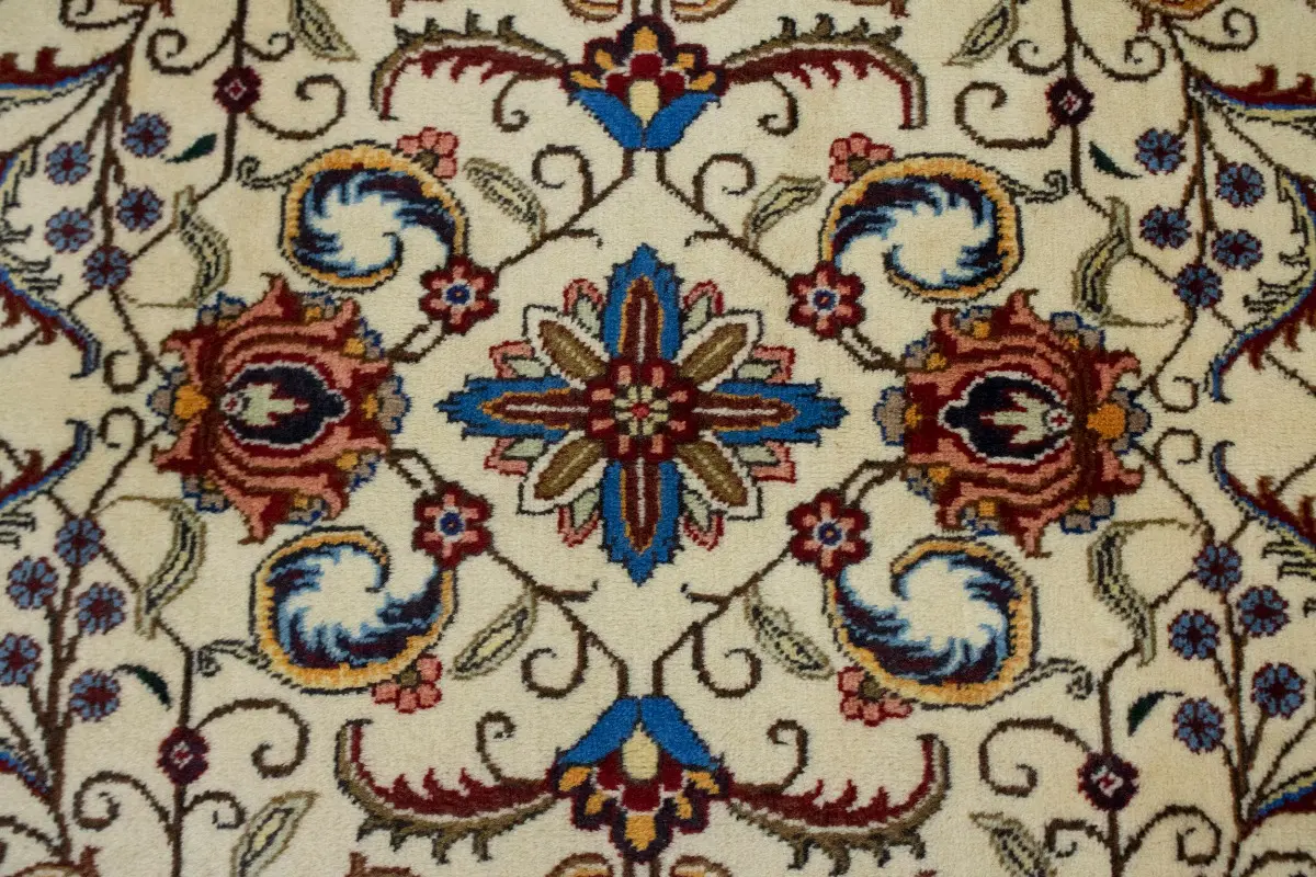 Hand Knotted vintage 10X13 cream floral Persian rug made with vegetable dyes (fine wool pile and cotton foundation), exceptional knot count, and appealing ancient designs. This Oriental rug never will go out of style and would be among your most valuable treasures.