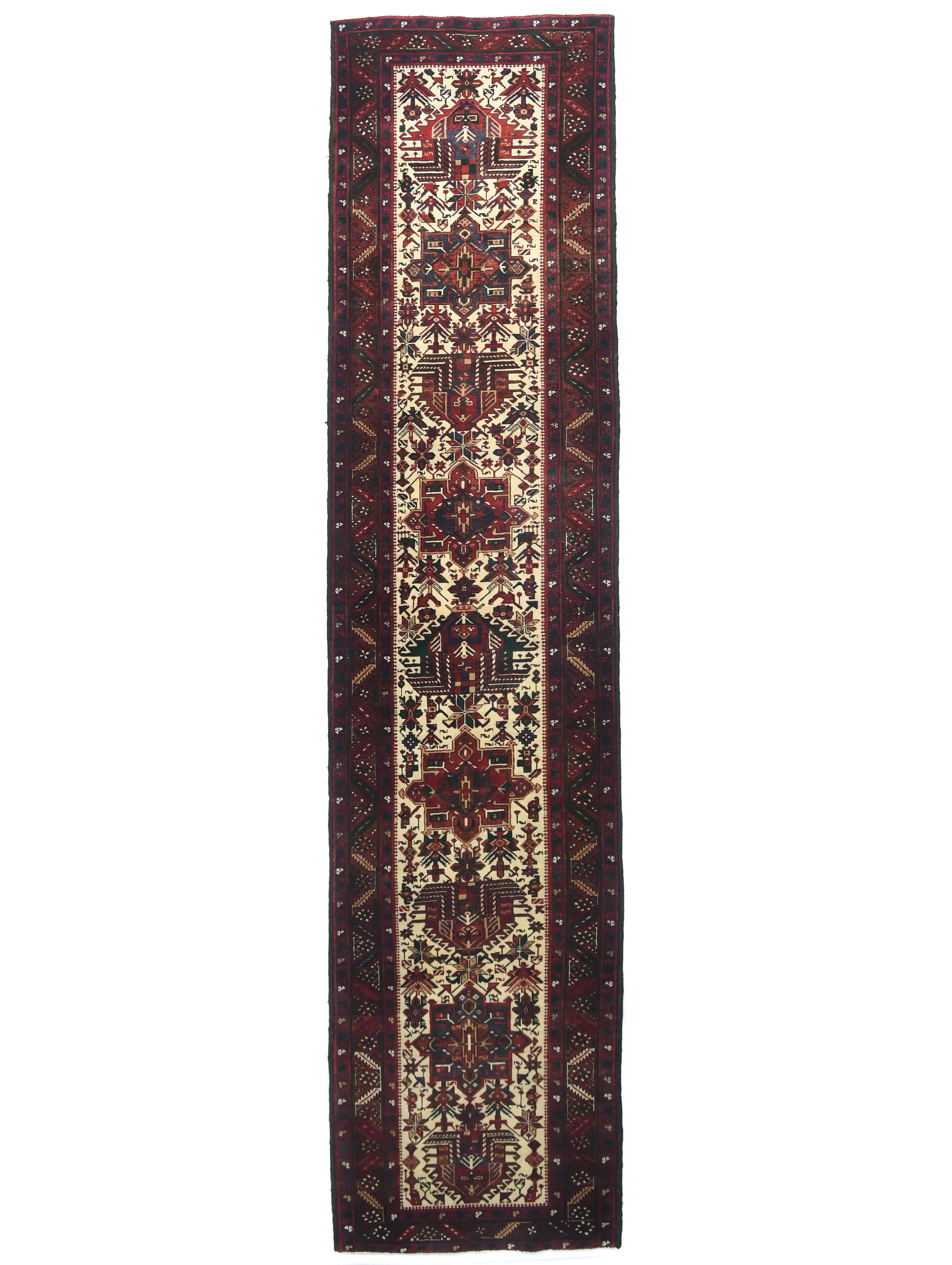 Hand Knotted vintage 3'4X14'6 cream Persian runner made with vegetable dyes (fine wool pile and cotton foundation), superior knot count, and appealing ancient designs. This Oriental runner never will go out of style and would be among your most valuable treasures.