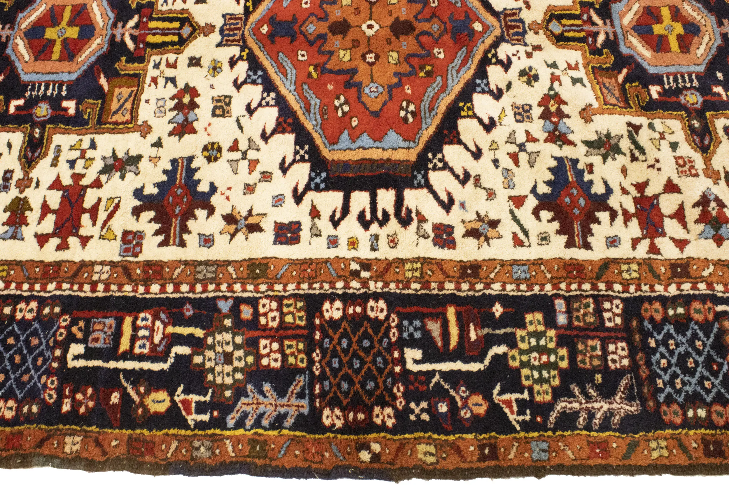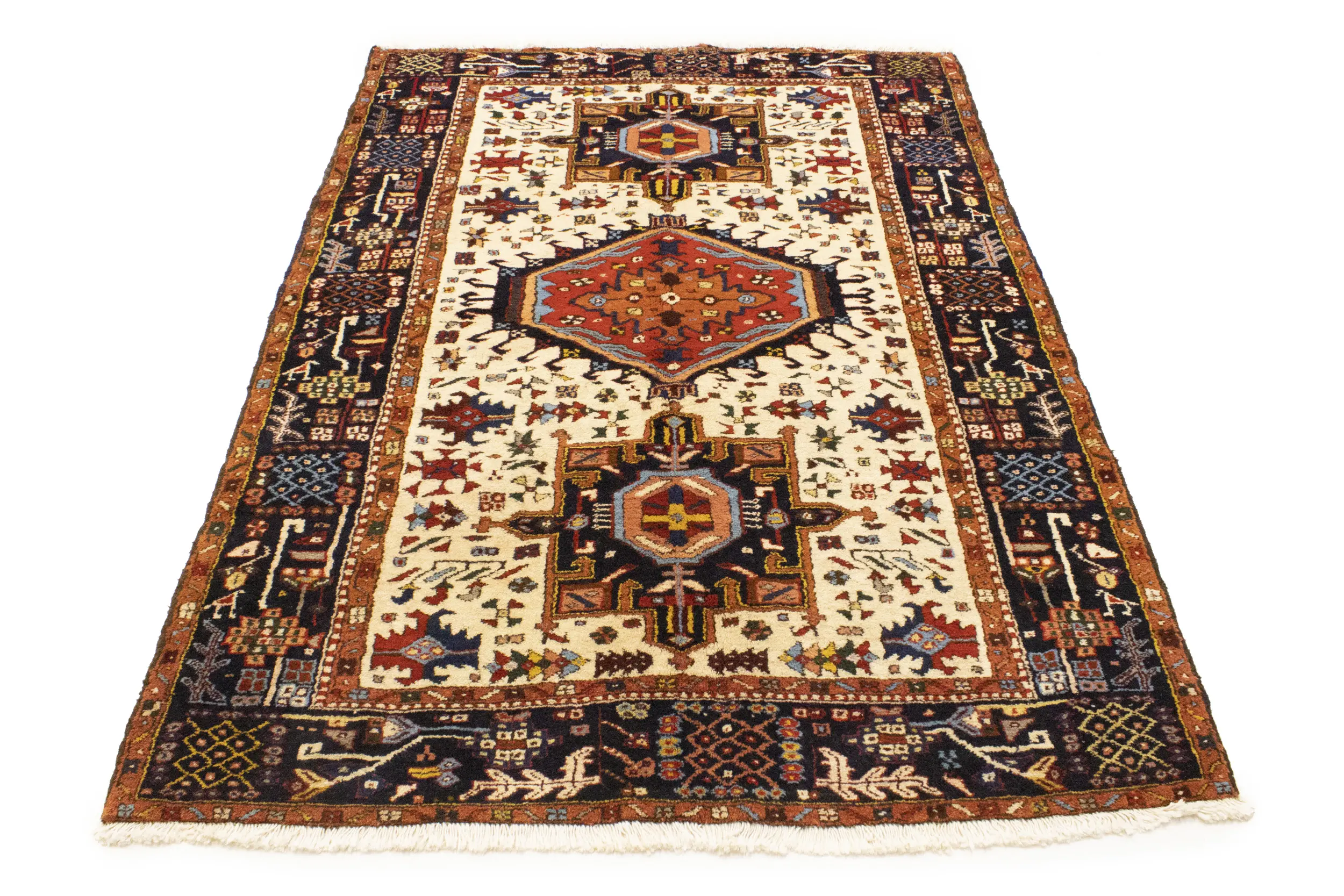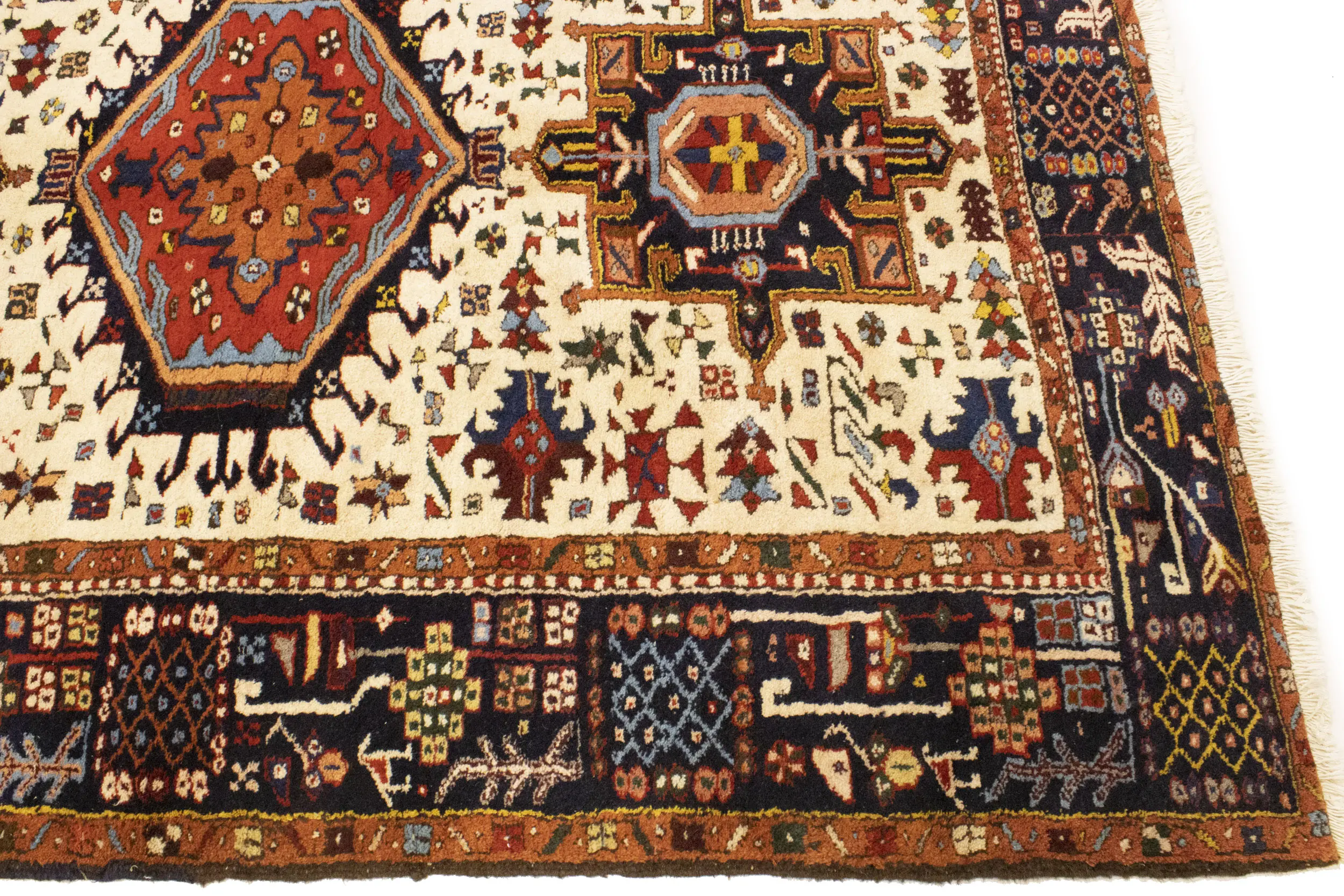 This authentic 5X7 cream vintage Persian rug was masterly knotted by the hands of weavers inspired by a variety of wonderful artistic designs, to recreate the aged look of the original piece with a richness of color and intricate patterned background field. What set this tribal Oriental area rug from the others are the material and dye used (wool pile and cotton foundation), knot count, antique designs, fantastic grades, and its regional historical connection: it has deep roots, from the story of the people who produced it to the meaning of the symbols and colors displayed across its canvas that have been praised for centuries. This home décor carpet will be completely cozy and inviting that never will go out of style!