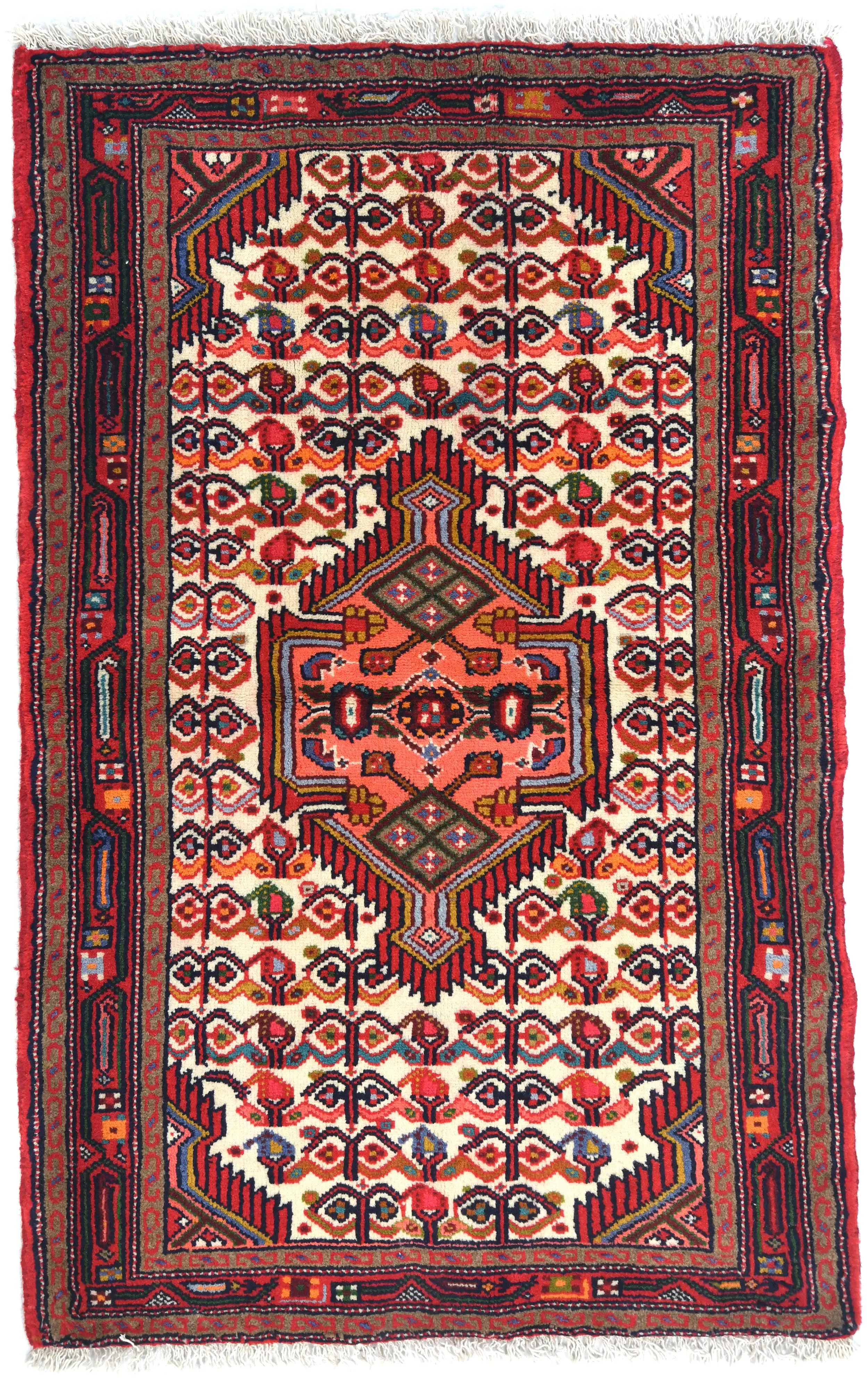 This authentic 2'7X4'1 cream vintage Persian rug was finely knotted by the hands of weavers influenced by a variety of amazing artistic designs, to recreate the aged look of the exceptional piece with a richness of color and embellished background field. What set this tribal Oriental area rug from the others are the material and dye used (wool pile and cotton foundation), knot count, antique designs, fantastic grades, and its regional historical connection: it has deep roots, from the story of the people who produced it to the meaning of the symbols and colors displayed across its canvas that have been praised for centuries. This home décor carpet will be completely cozy and inviting that never will go out of style! Also, this Oriental rug would be among your most valuable treasures, it is a great investment that increase in value over time, and it will last a lifetime because was woven with high-quality, all-natural wool; it won’t rip, tear, or shed. Eco-friendly, opulent yet affordable; this Persian rug will give you an extra pop of character to help define your home environment with luxury and warmth that will capture the eyes and attention of your audience (homeowners, designers, decorators, family and friends). RT-7370