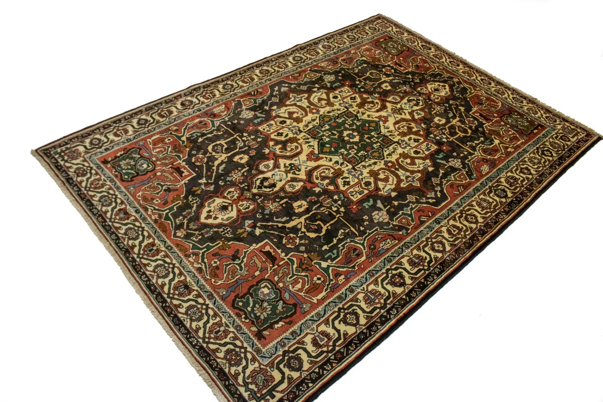 This genuine 7X10 dark brown vintage Persian rug was made by the hands of gifted weavers inspired by a variety of spectacular artistic designs, to recreate the aged look of the original piece with a richness of color and ornately patterned floral background field. What set this Oriental area rug from the others are the material and dye used (wool pile and cotton foundation), knot count, ancient designs, fantastic grades, and its regional historical connection: it has deep roots, from the story of the people who produced it to the meaning of the symbols and colors displayed across its canvas that have been praised for centuries. This home décor carpet will be completely cozy and inviting that never will go out of style! Also, this Oriental rug would be among your most valuable treasures, it is a great investment that accrues value over time, and it will last for generations because was woven with high-quality, all-natural wool; it won’t rip, tear, or shed. Environmentally friendly, opulent yet affordable; this Persian rug will give you a thorough amount of character to help define your living space with elegance and warmth that will capture the eyes and attention of your audience (homeowners, designers, decorators, family and friends). RT-3434