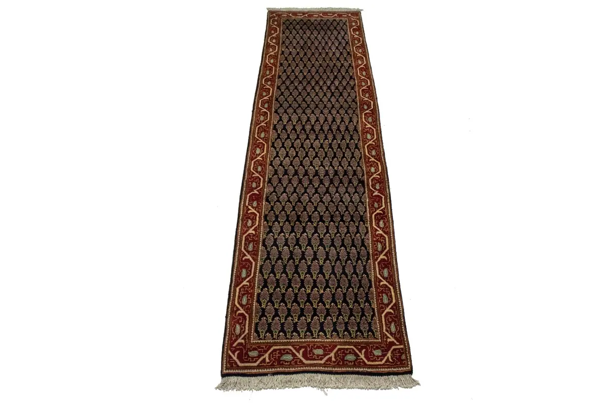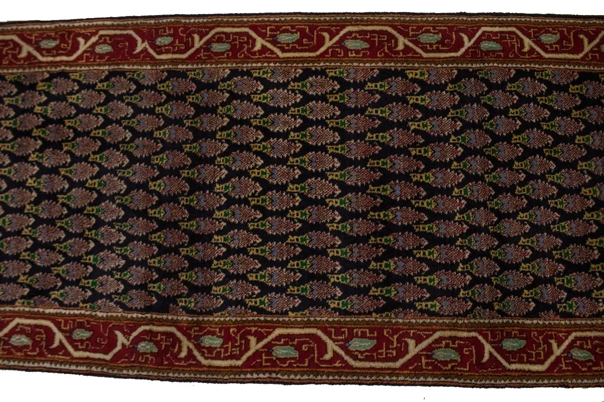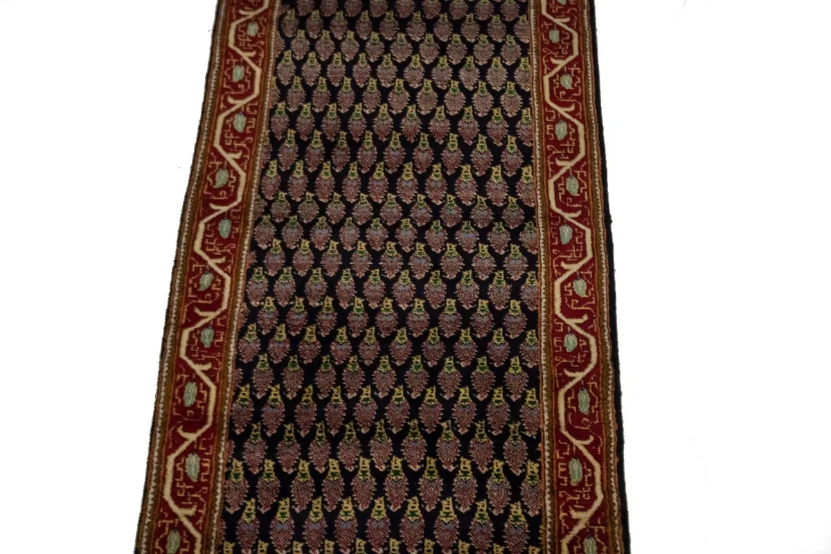 Hand Knotted 3X11 dark navy vintage Persian runner made with natural dyes (fine wool pile and cotton foundation), superior knot count, and appealing ancient designs. This Oriental runner never will go out of style and would be among your most valuable treasures.
