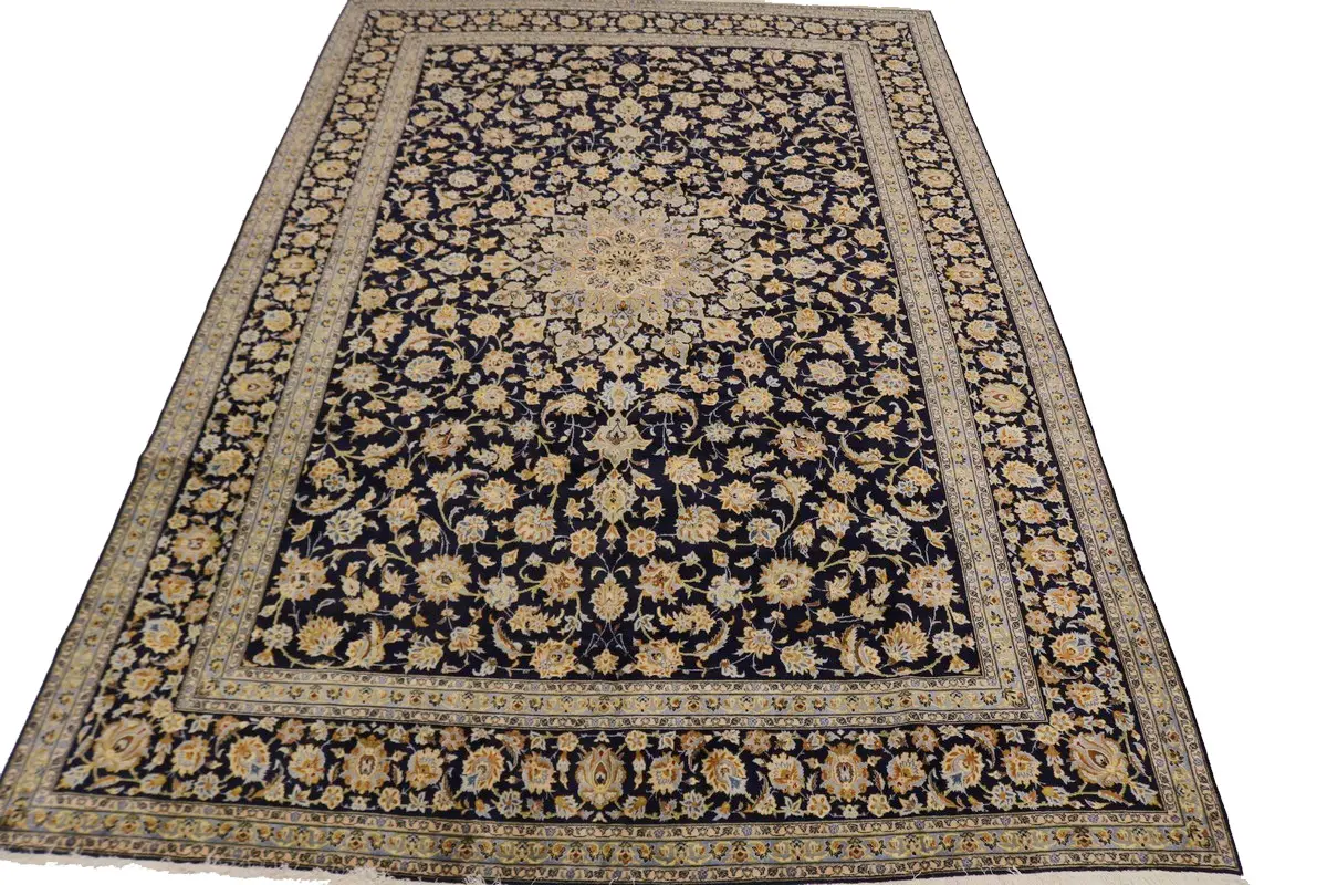 This authentic 11'6X17'4 dark navy oversized dark navy vintage Persian rug was masterly knotted by the hands of weavers inspired by a variety of wonderful artistic designs, to recreate the aged look of the original piece with a richness of color and intricate patterned floral background field. What set this traditional Oriental area rug from the others are the material and dye used (wool pile and cotton foundation), knot count, antique designs, fantastic grades, and its regional historical connection: it has deep roots, from the story of the people who produced it to the meaning of the symbols and colors displayed across its canvas that have been praised for centuries. This classic home décor carpet will be completely cozy and inviting that never will go out of style! Also, this Oriental rug would be among your most valuable treasures, it is a great investment that accrues value over time, and it will last for generations because was woven with high-quality, all-natural wool; it won’t rip, tear, or shed. Environmentally friendly, opulent yet affordable; this Persian rug will give you a thorough amount of character to help define your living space with luxury and warmth that will capture the eyes and attention of your audience (homeowners, designers, decorators, family and friends). RT-4273