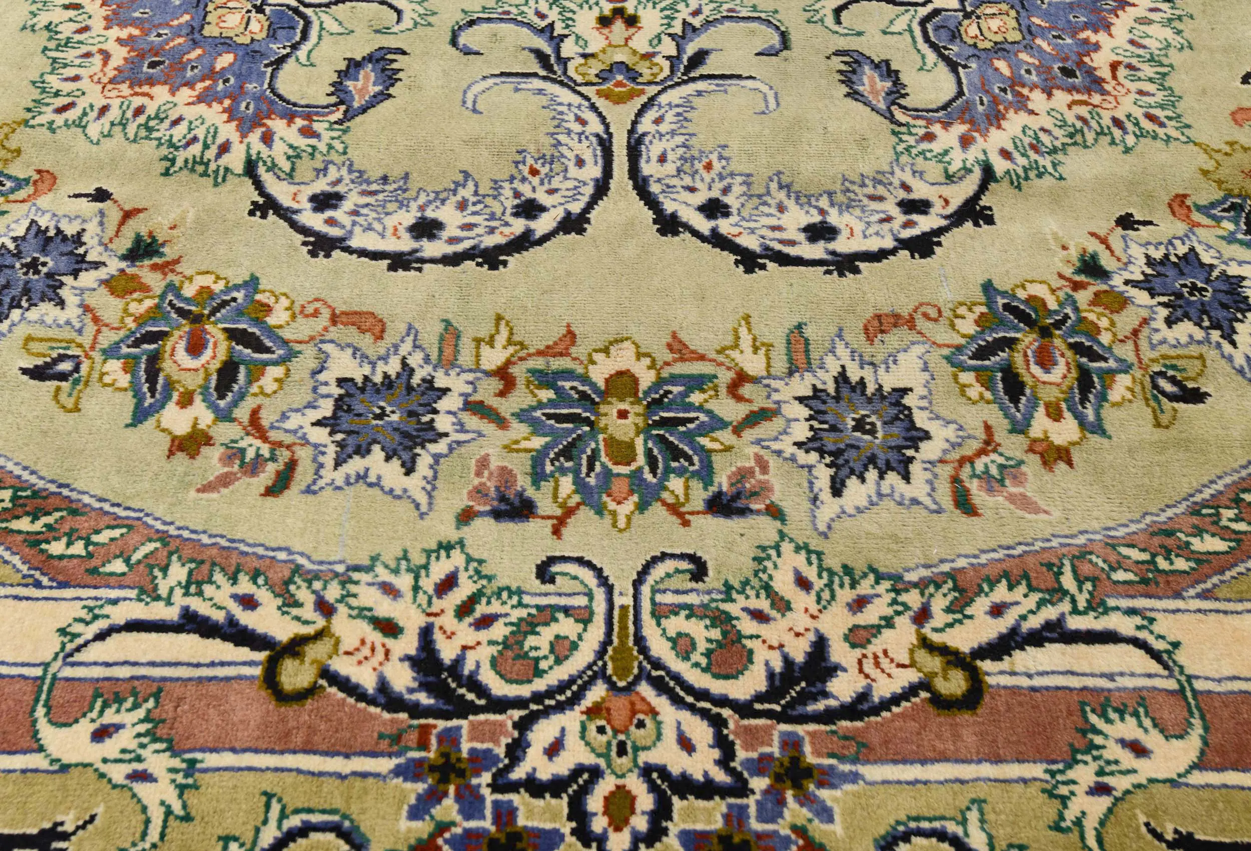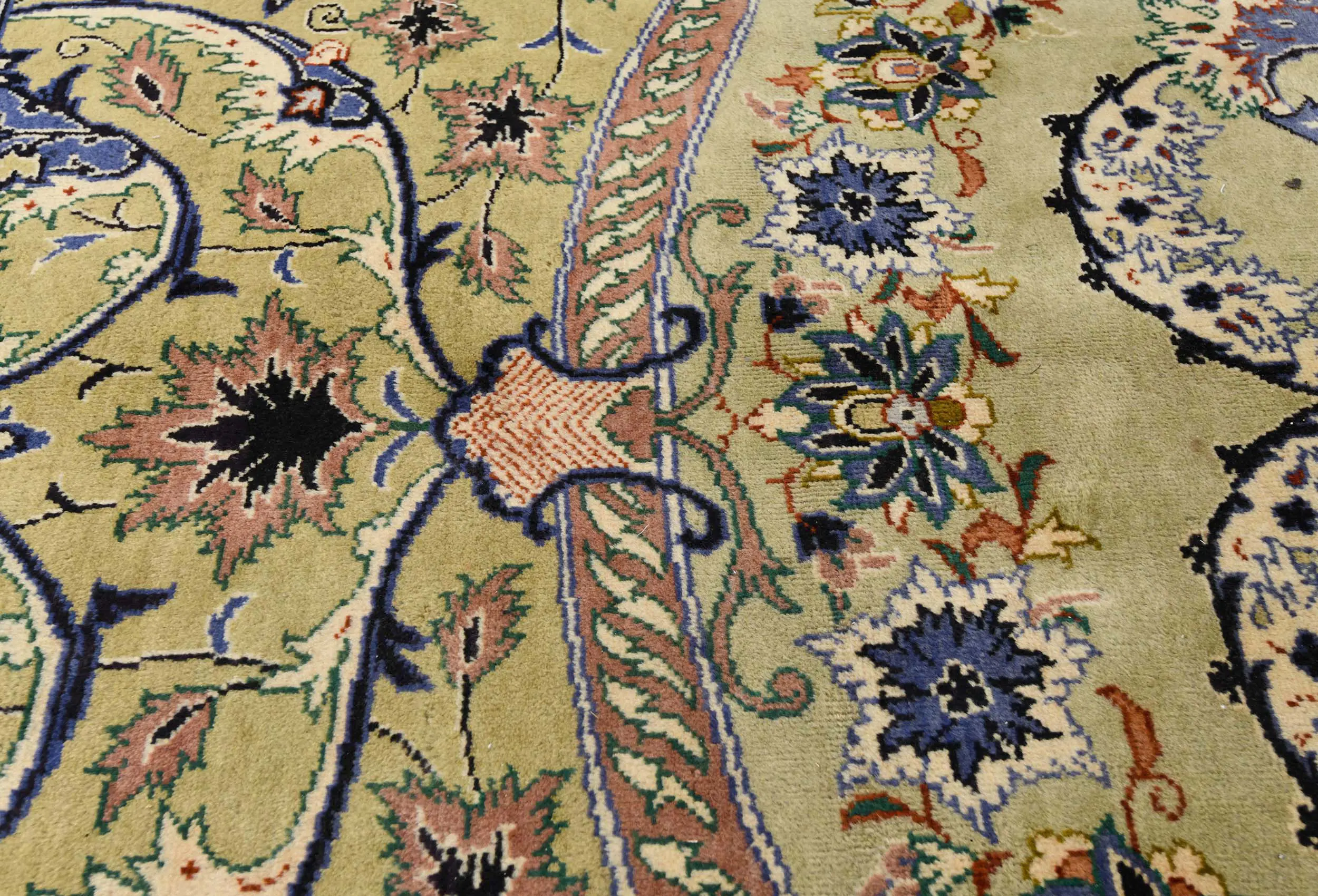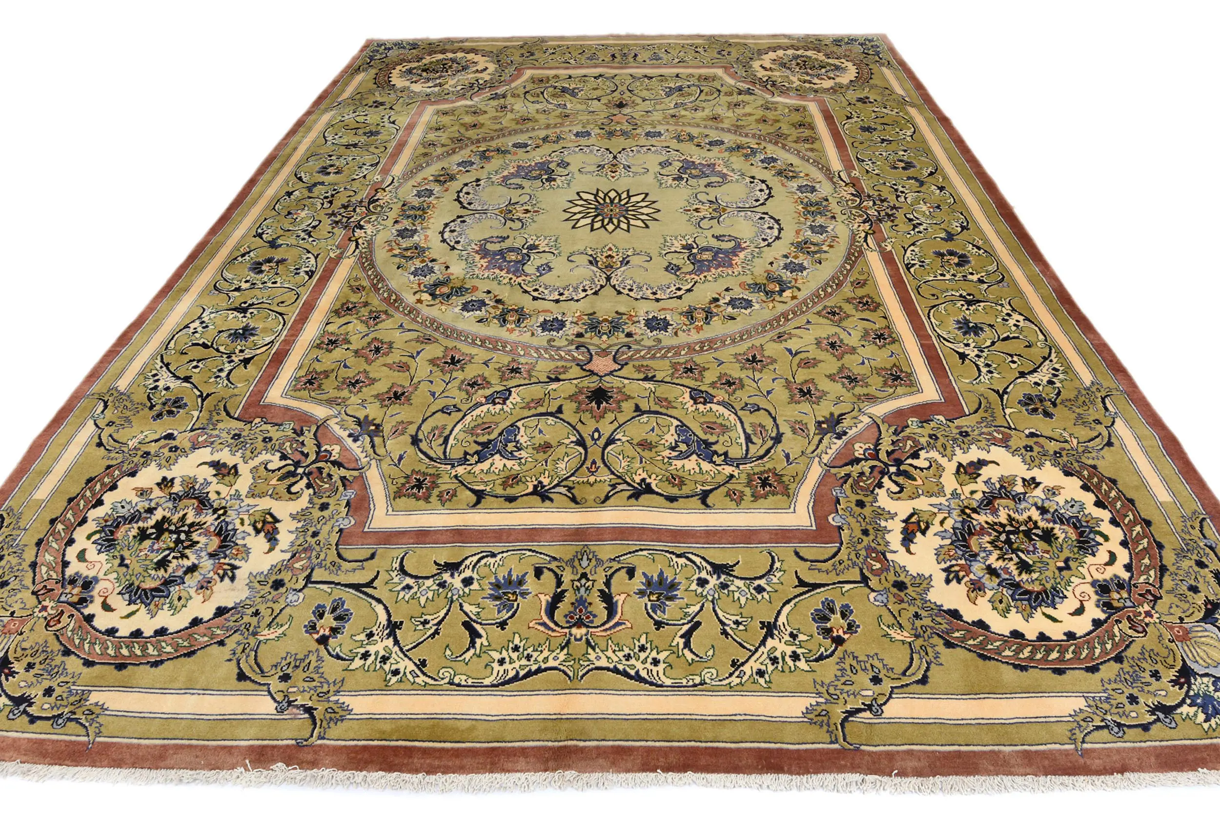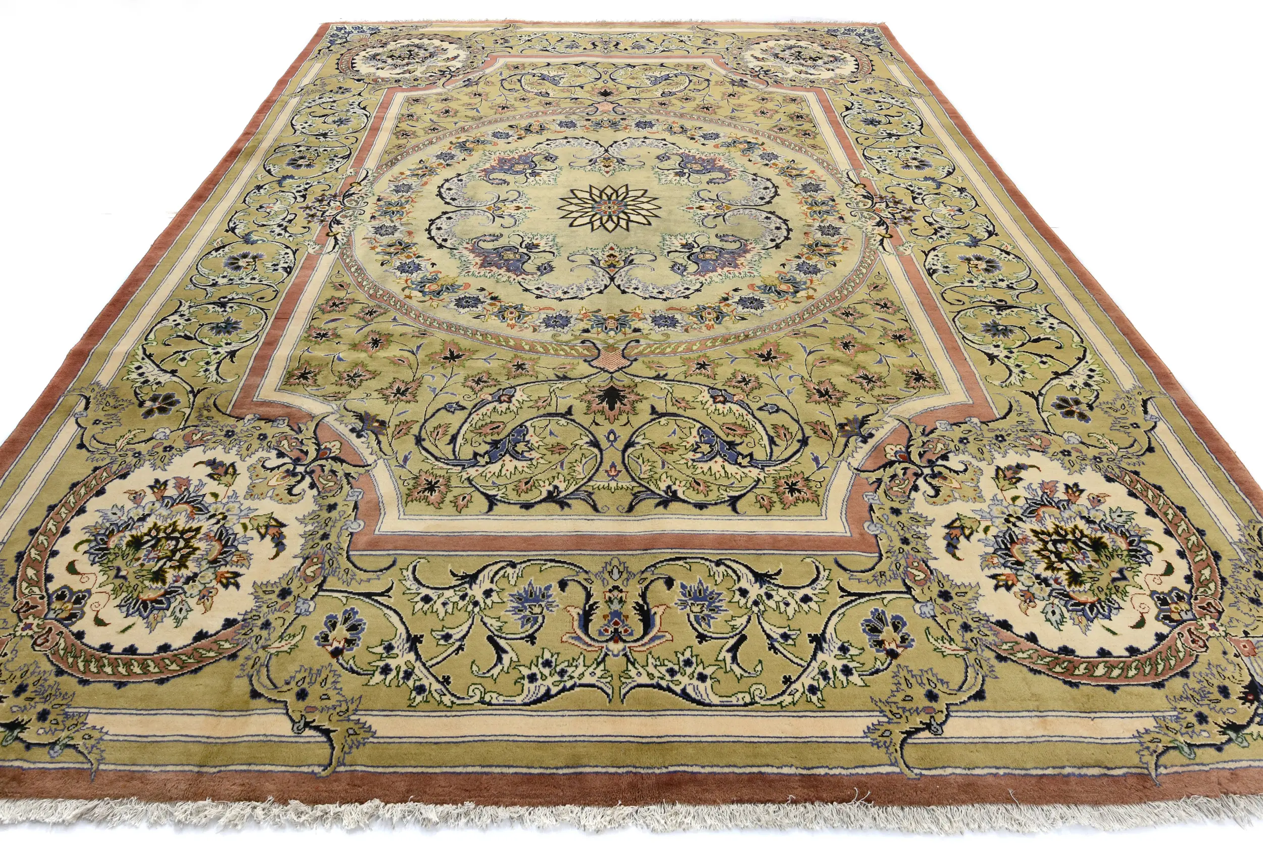 Handmade vintage 9'9X13'5 green Persian rug made with vegetable dyes (fine wool pile and cotton foundation), superior knot count, and alluring ancient designs. This Oriental rug never will go out of style and would be among your most valuable treasures.