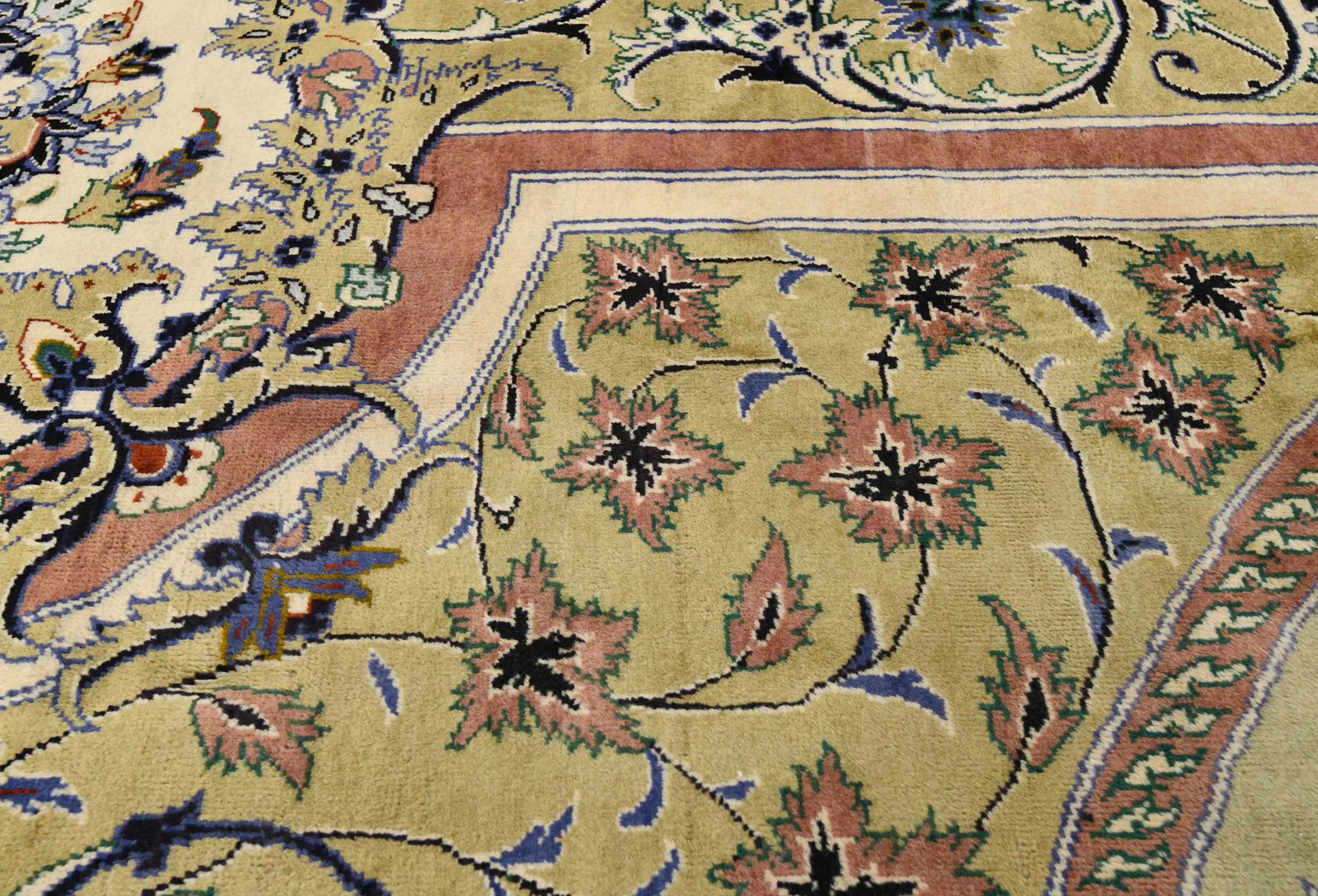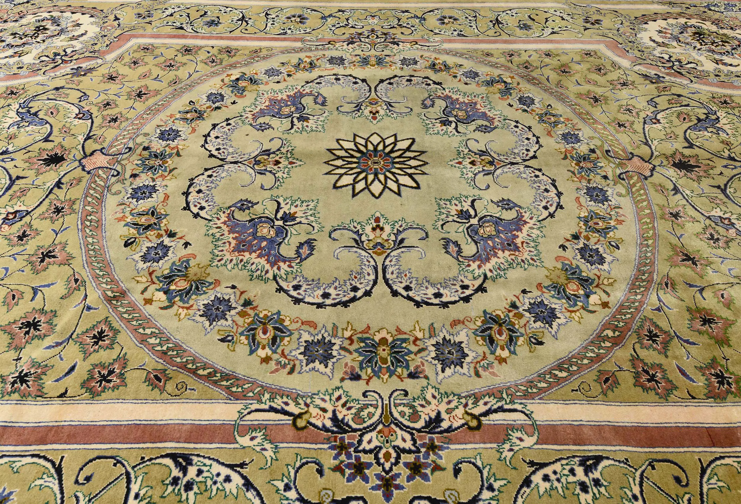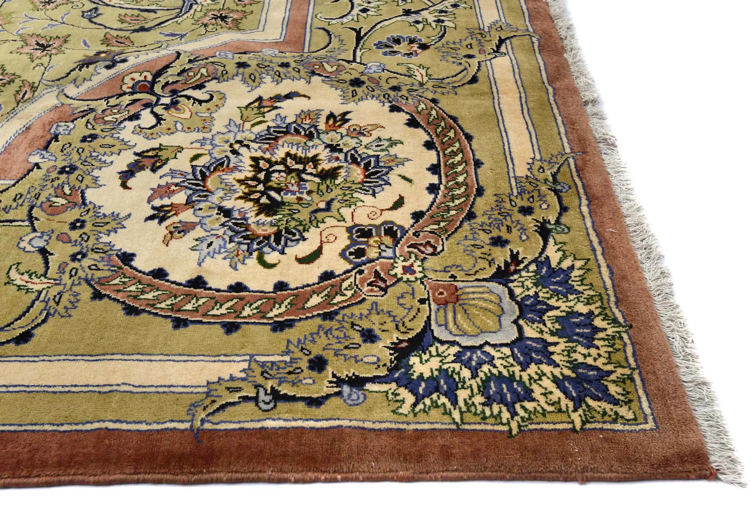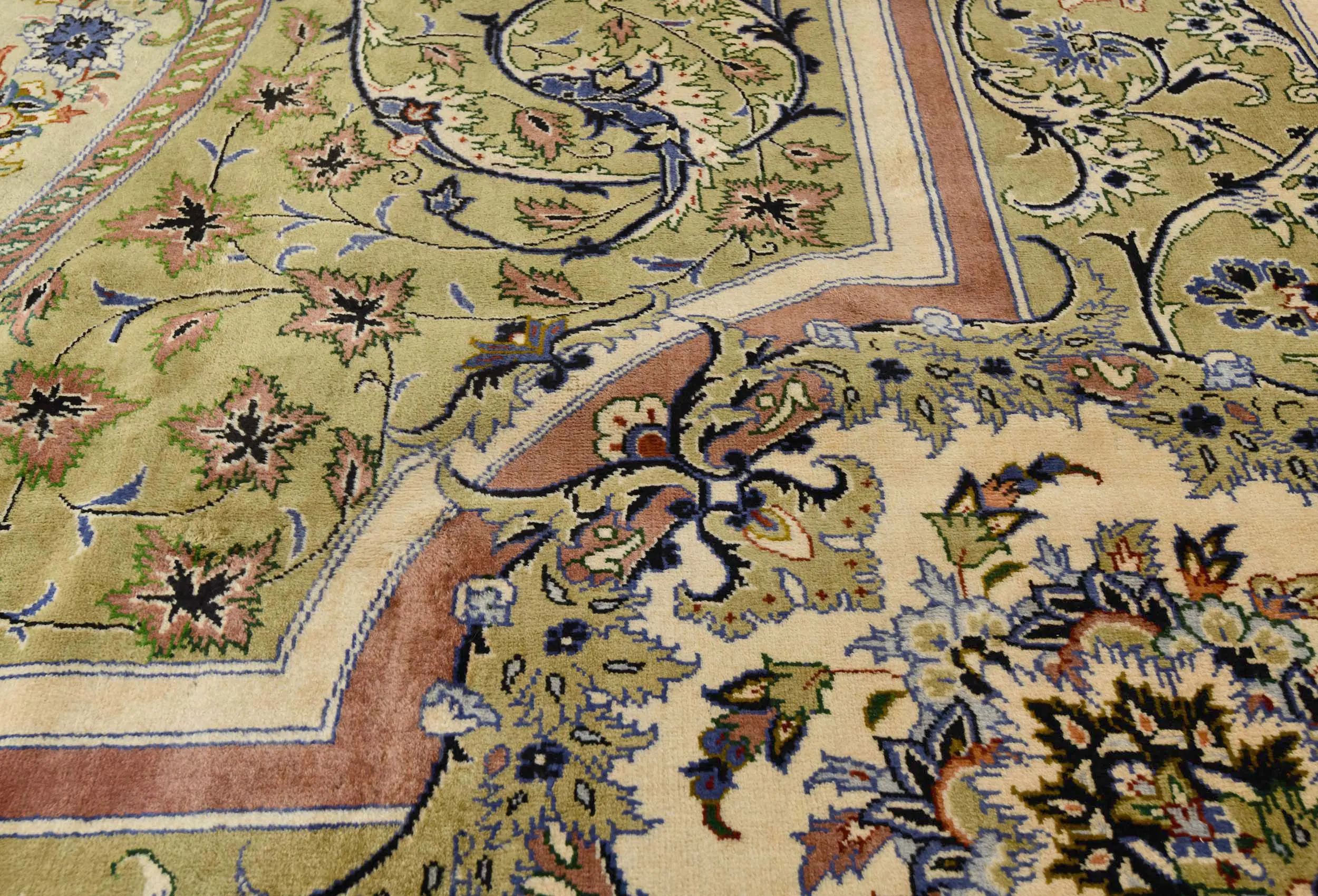 Handmade vintage 9'9X13'5 green Persian rug made with vegetable dyes (fine wool pile and cotton foundation), superior knot count, and alluring ancient designs. This Oriental rug never will go out of style and would be among your most valuable treasures.