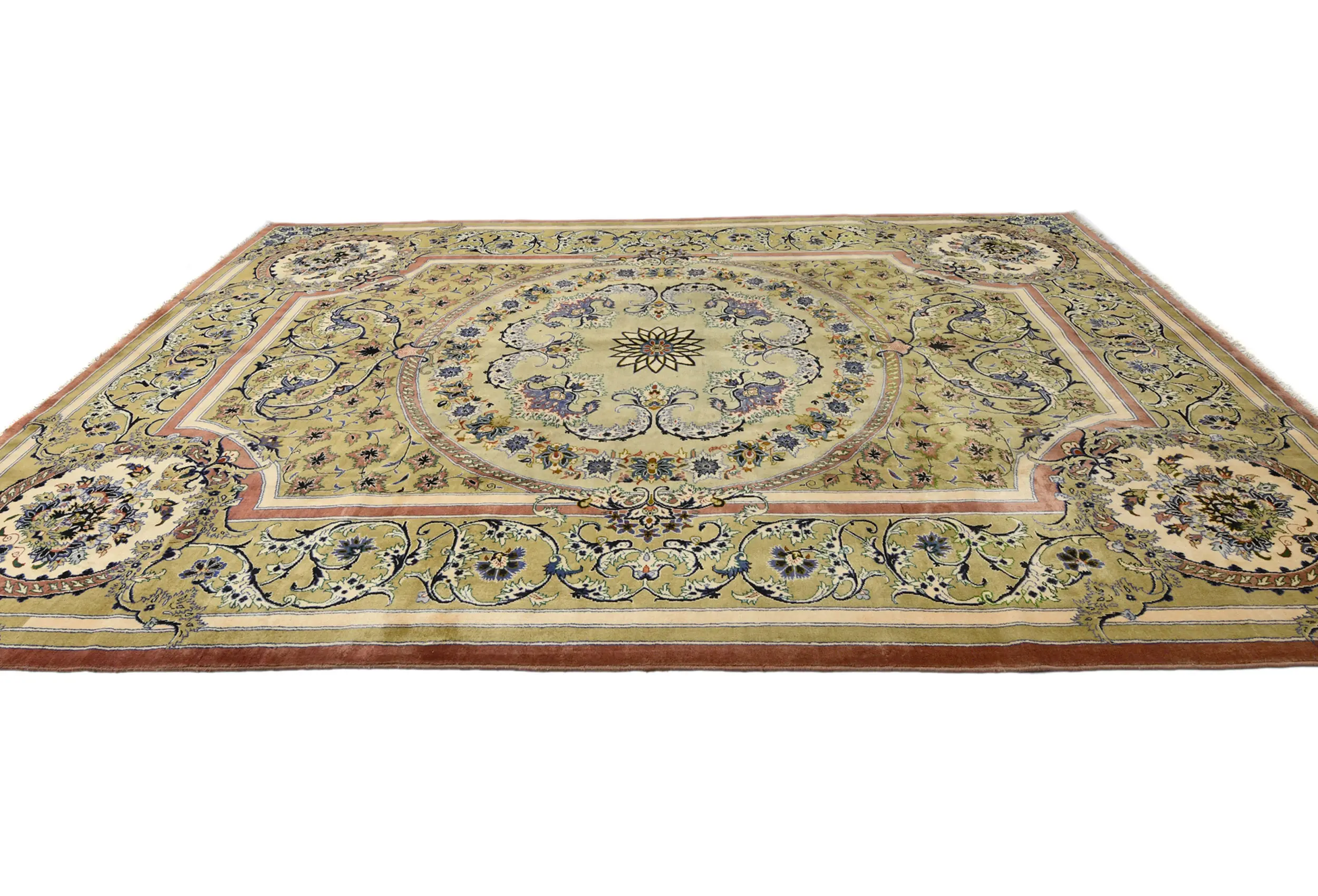 This authentic 9'9X13'5 green vintage Persian rug was finely knotted by the hands of weavers influenced by a variety of amazing artistic designs, to recreate the aged look of the exceptional piece with a richness of color and embellished floral background field. What set this traditional Oriental area rug from the others are the material and dye used (wool pile and cotton foundation), knot count, antique designs, fantastic grades, and its regional historical connection: it has deep roots, from the story of the people who produced it to the meaning of the symbols and colors displayed across its canvas that have been praised for centuries. This classic home décor carpet will be completely cozy and inviting that never will go out of style! Also, this Oriental rug would be among your most valuable treasures, it is a great investment that increase in value over time, and it will last a lifetime because was woven with high-quality, all-natural wool; it won’t rip, tear, or shed. Eco-friendly, opulent yet affordable; this Persian rug will give you an extra pop of character to help define your home environment with luxury and warmth that will capture the eyes and attention of your audience (homeowners, designers, decorators, family and friends). EB-6497
