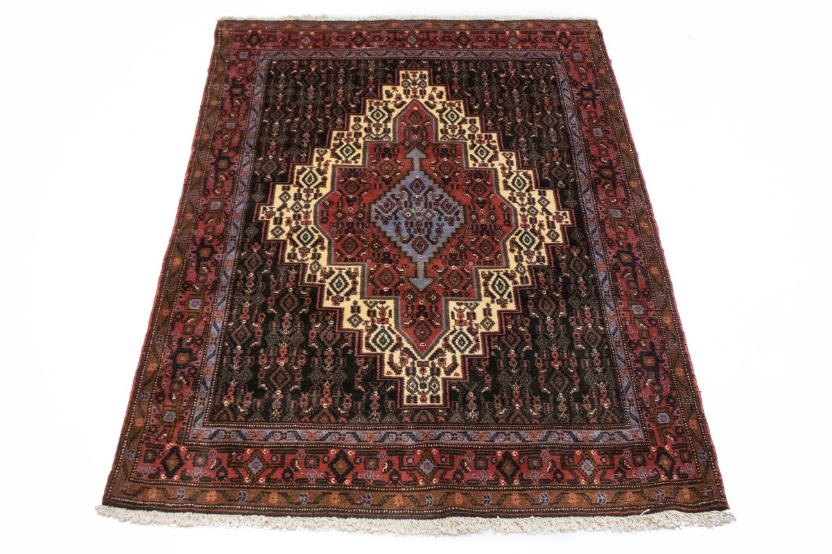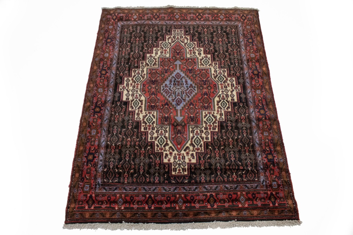 This genuine 4X5'5 vintage Persian rug was made by the hands of gifted weavers inspired by a variety of spectacular artistic designs, to recreate the aged look of the original piece with a richness of color and ornately patterned background field. What set this geometric Oriental area rug from the others are the material and dye used (wool pile and cotton foundation), knot count, ancient designs, fantastic grades, and its regional historical connection: it has deep roots, from the story of the people who produced it to the meaning of the symbols and colors displayed across its canvas that have been praised for centuries. This home decor carpet will be completely cozy and inviting that never will go out of style! Also, this Oriental rug would be among your most valuable treasures, it is a great investment that accrues value over time, and it will last for generations because was woven with high-quality, all-natural wool; it won't rip, tear, or shed. Environmentally friendly, opulent yet affordable; this Persian rug will give you a thorough amount of character to help define your living space with elegance and warmth that will capture the eyes and attention of your audience (homeowners, designers, decorators, family and friends).
