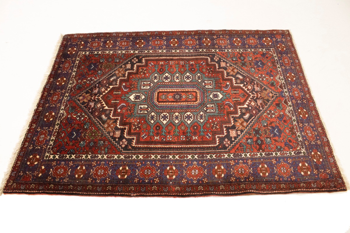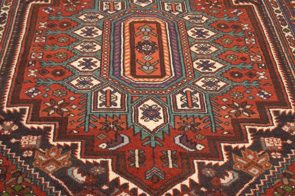 Hand Knotted vintage 4X5 red Persian rug made with natural dyes (fine wool pile and cotton foundation), superior knot count, and appealing ancient designs. This Oriental rug never will go out of style and would be among your most valuable treasures.