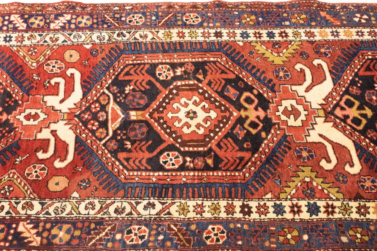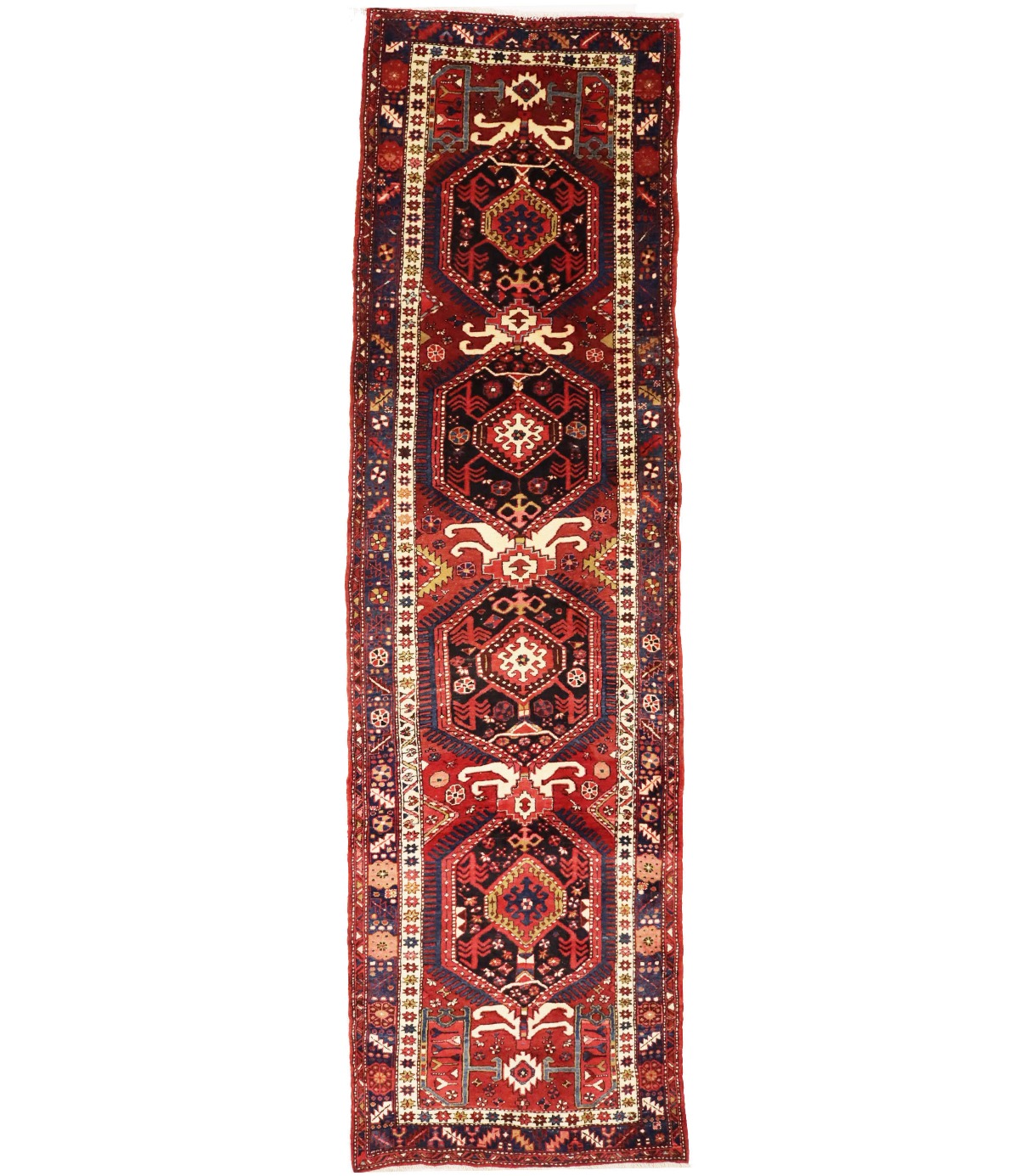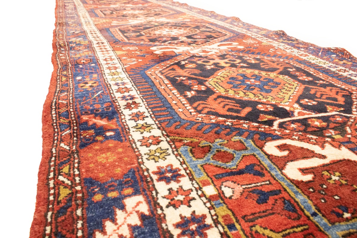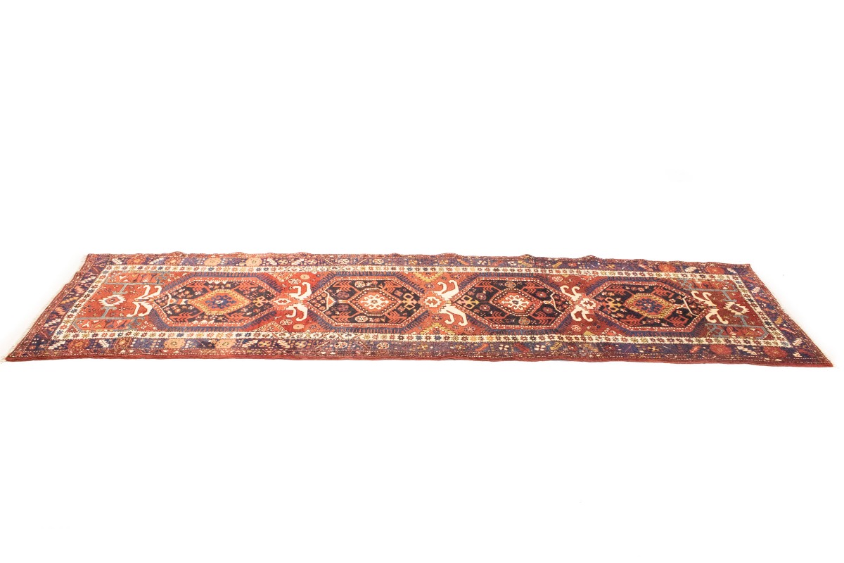 Hand Knotted vintage 4X14 red Persian runner made with vegetable dyes (fine wool pile and cotton foundation), superior knot count, and appealing ancient designs. This Oriental runner never will go out of style and would be among your most valuable treasures.